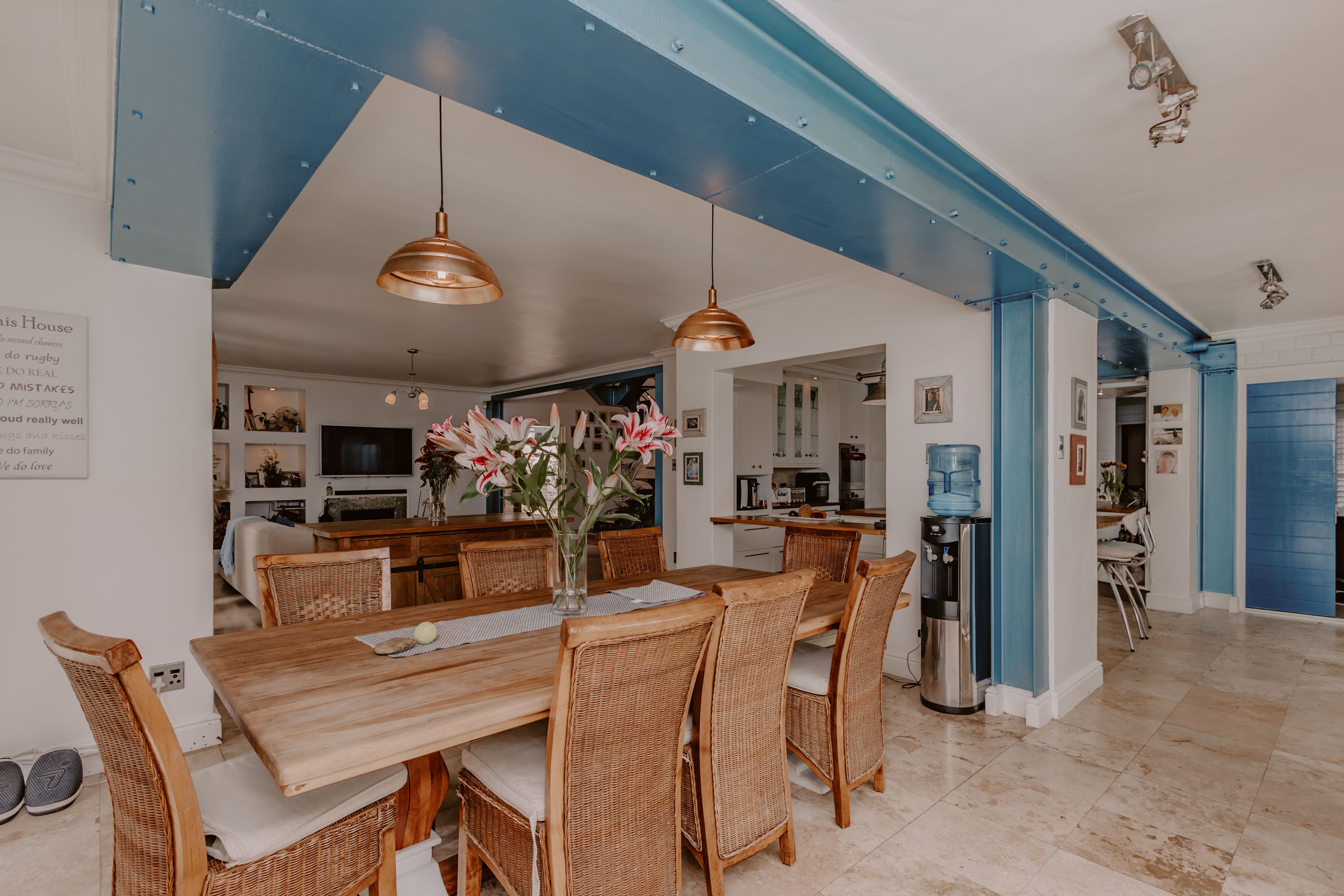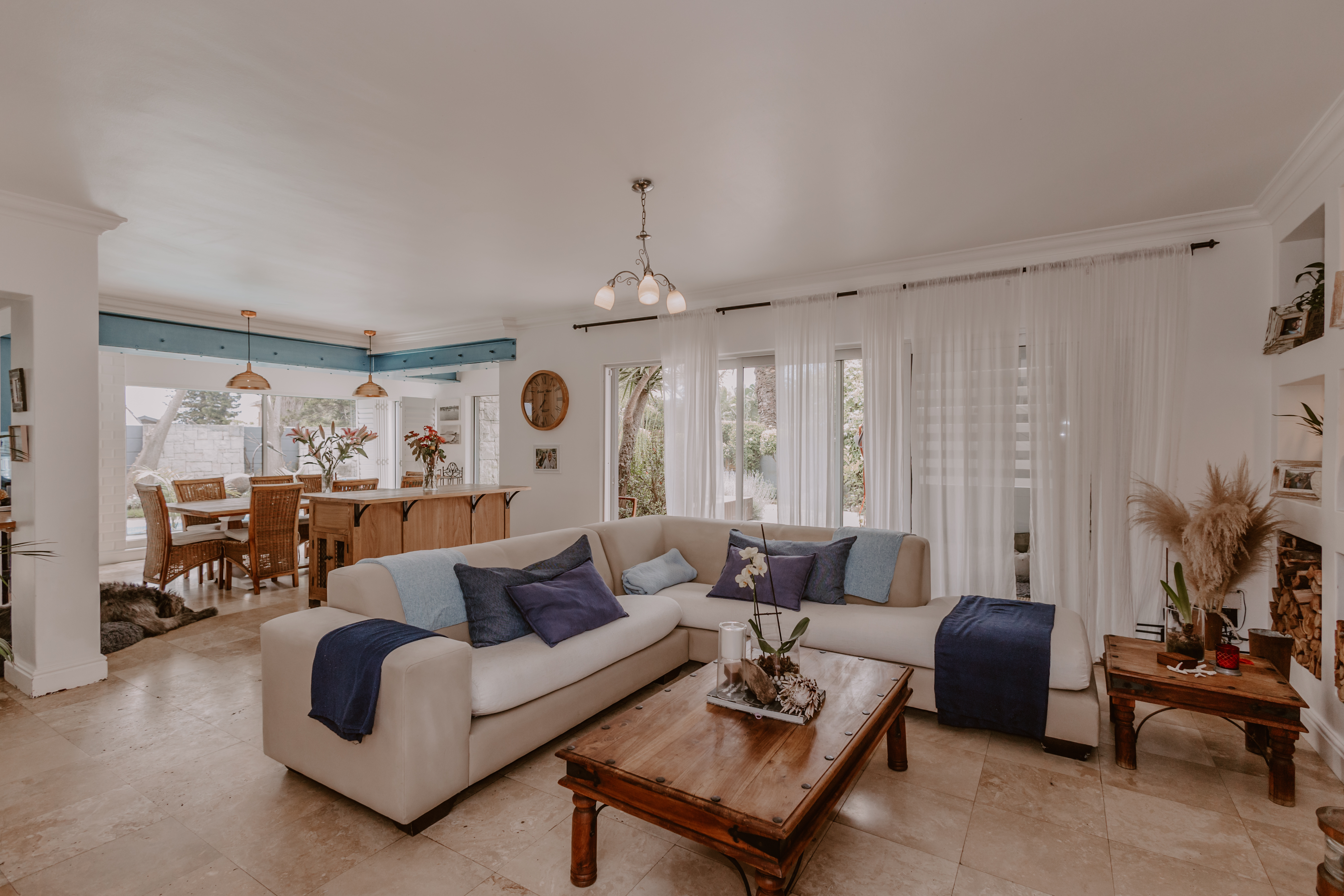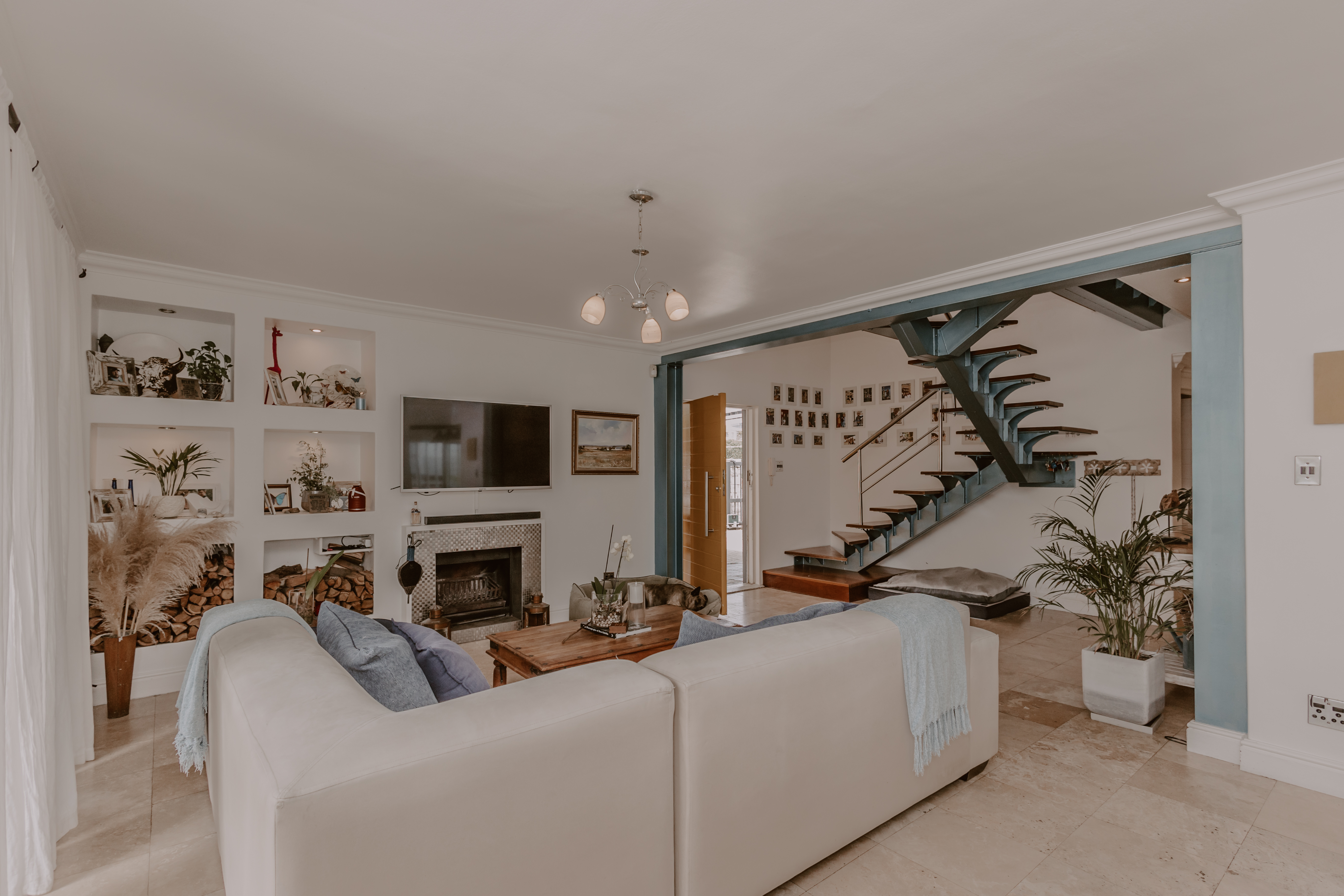- Large open-plan lounge and dining areas with built-in fireplace.