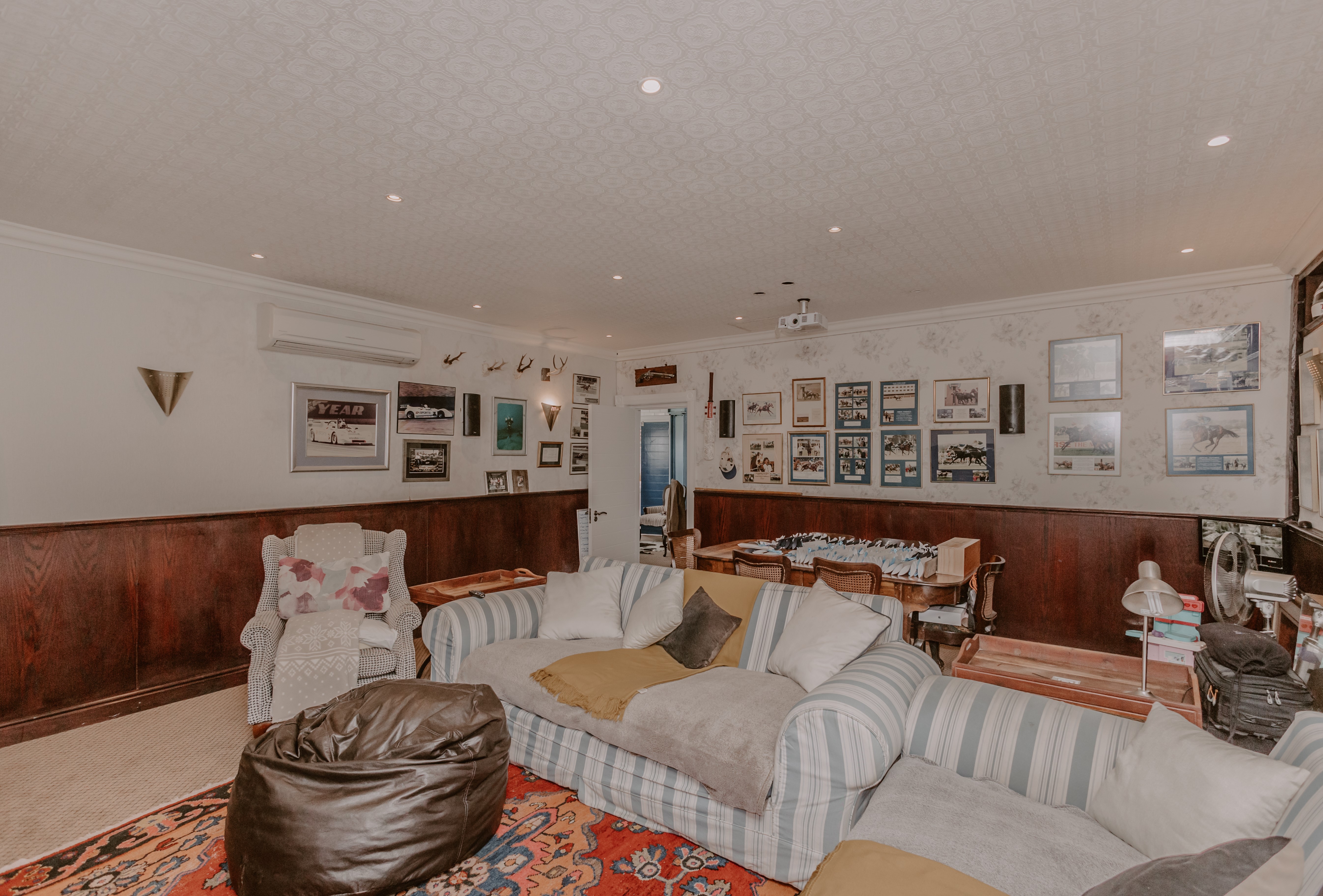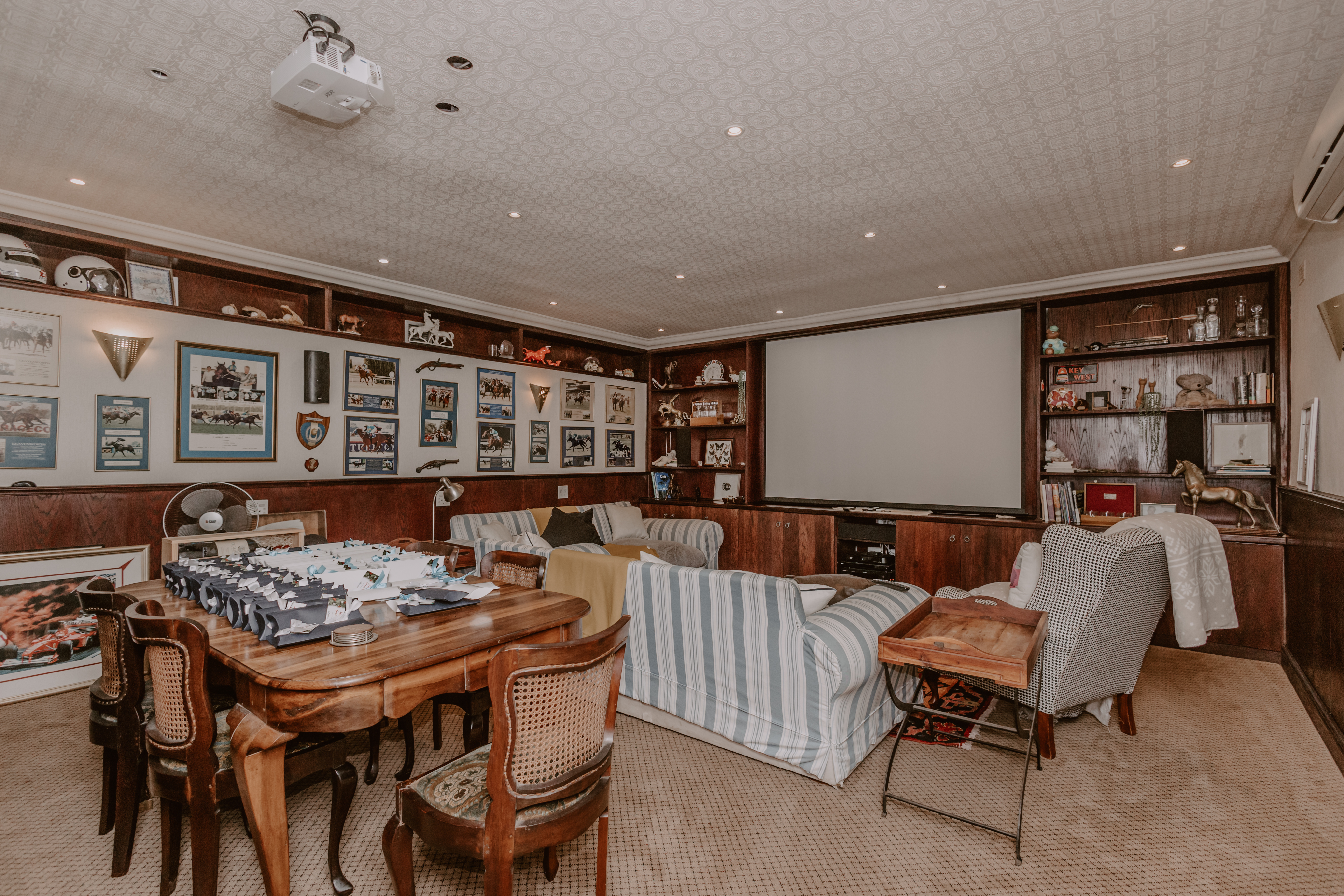 - Massive cinema/boardroom with projector and sound system.