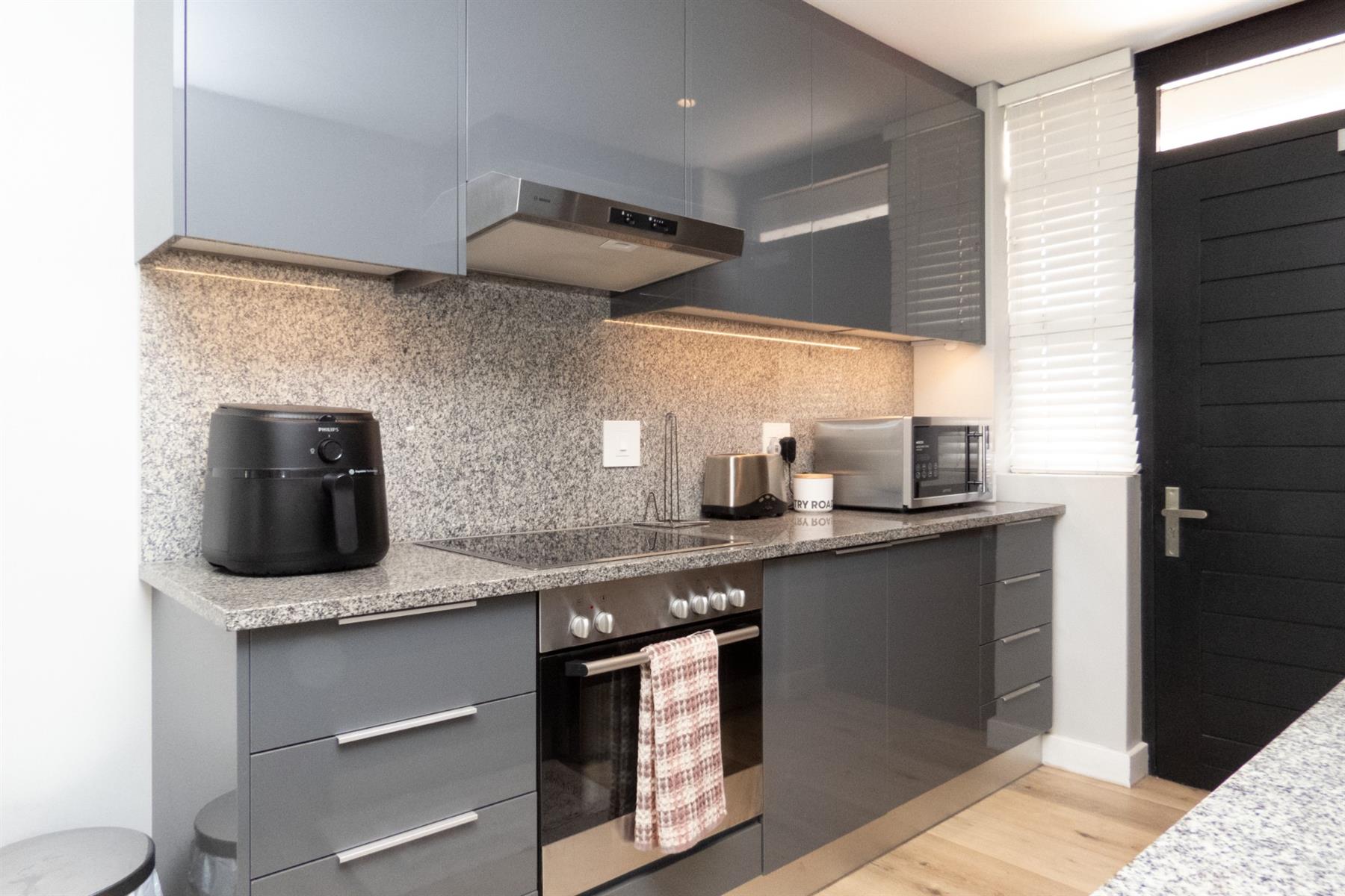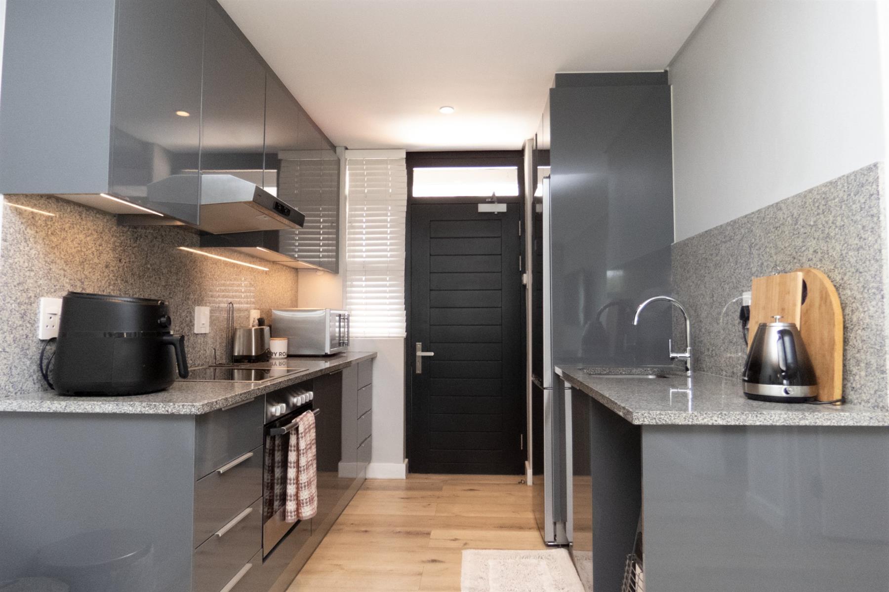 The kitchen is functional and neatly finished, featuring a fitted stove, single sink, and lighting installed. The living space is fitted with laminate flooring, complemented by a ceiling finish, creating a clean and low-maintenance interior. Electricity is prepaid, allowing for easy cost management, while water is billed monthly.
