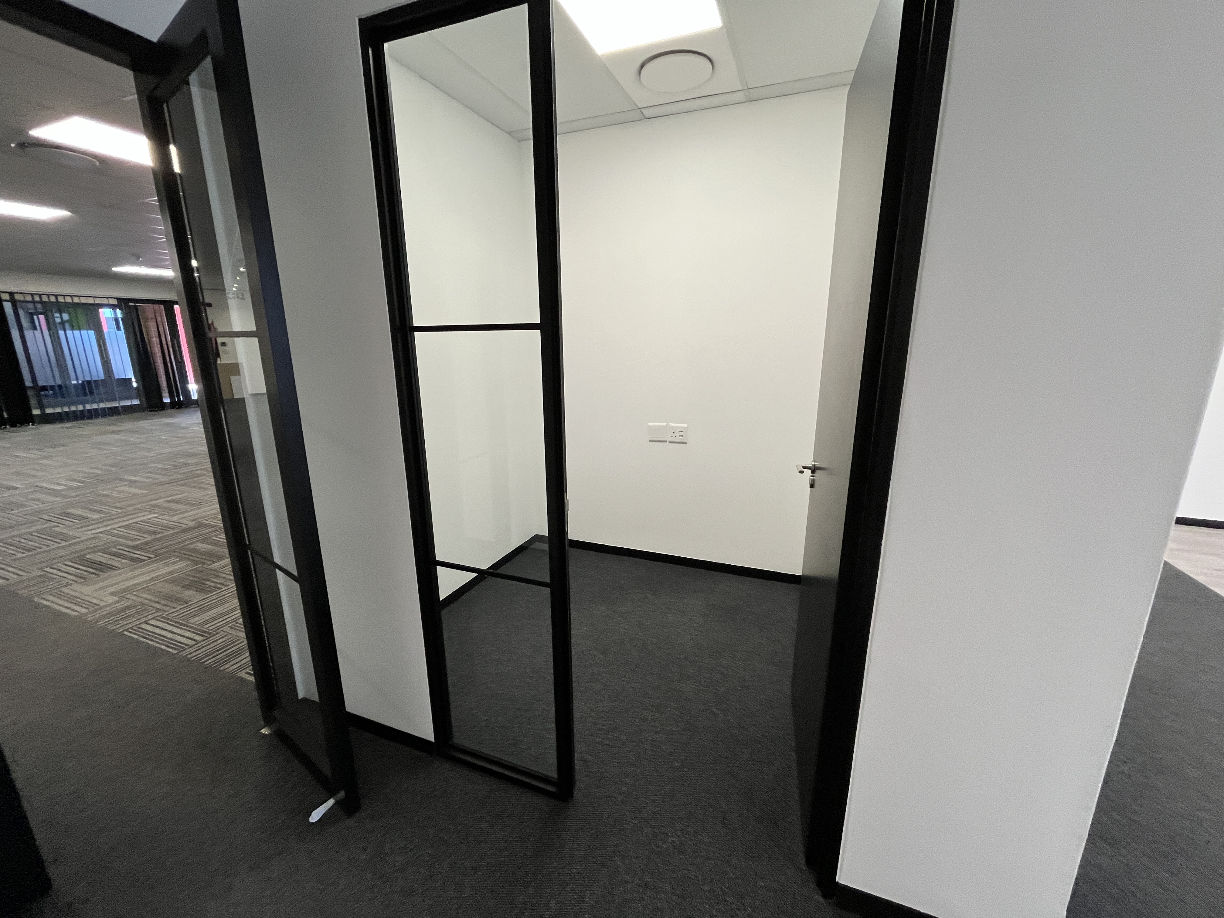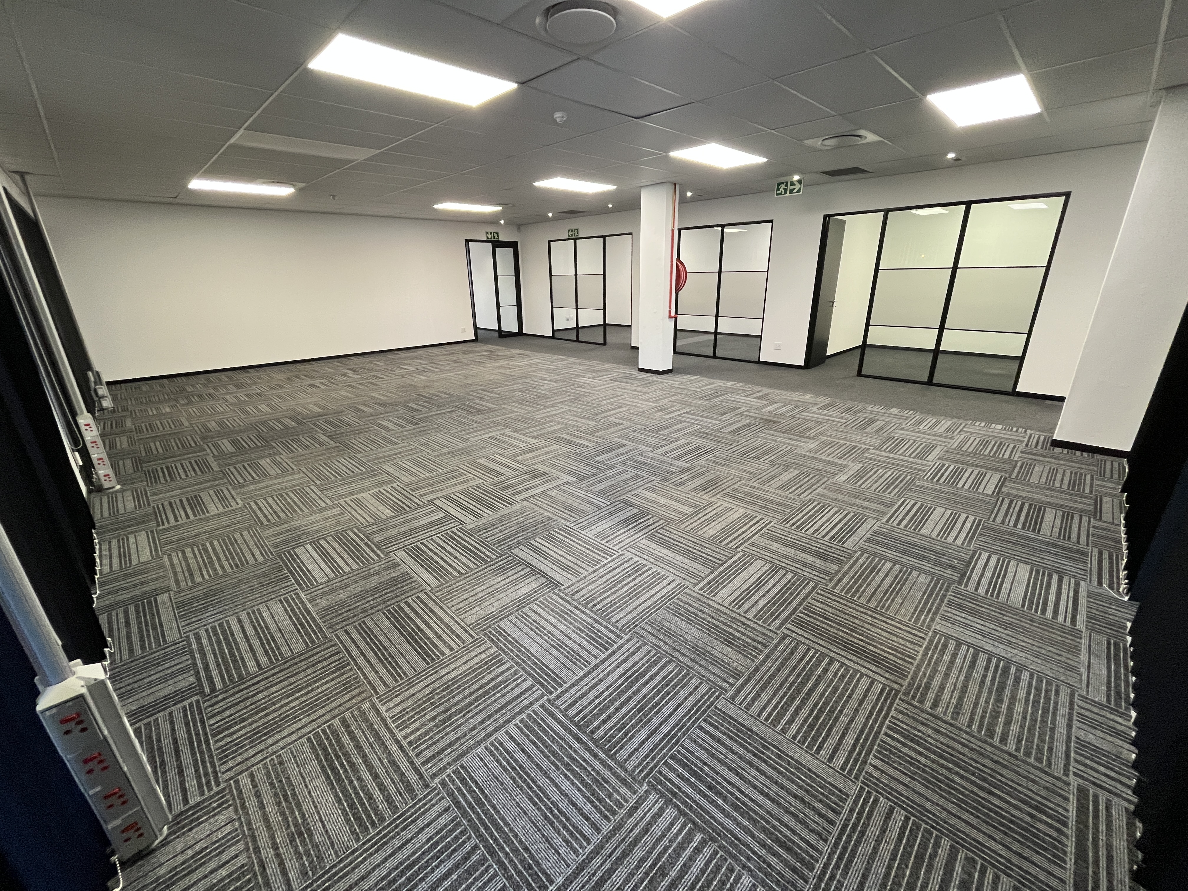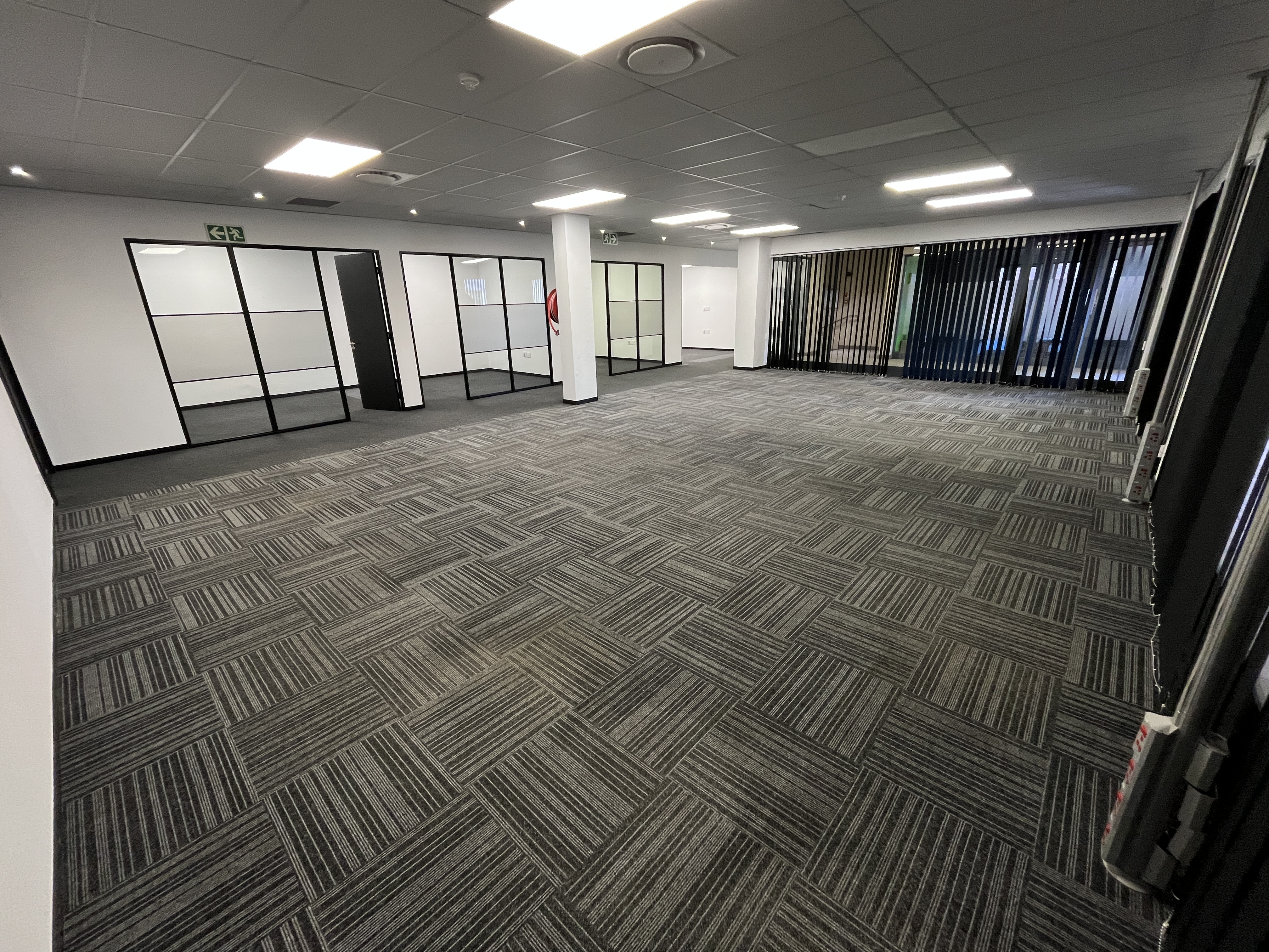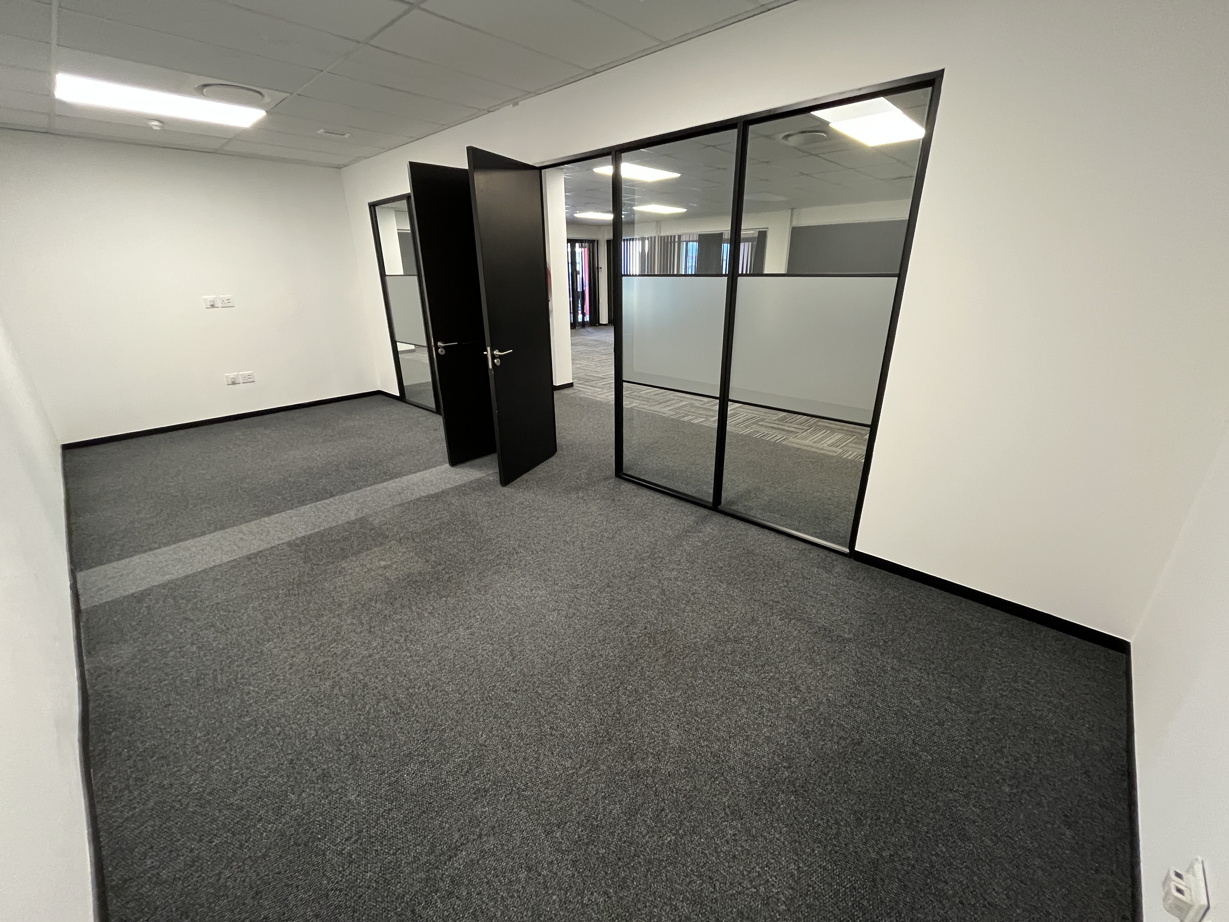 Brand-new carpets enhance the professional finish, while stylish glass-partitioned cubicles with sleek black framing create a contemporary aesthetic without compromising natural light or openness. Large windows wrap the main workspace, allowing abundant natural light to filter through and creating a bright, productive environment.