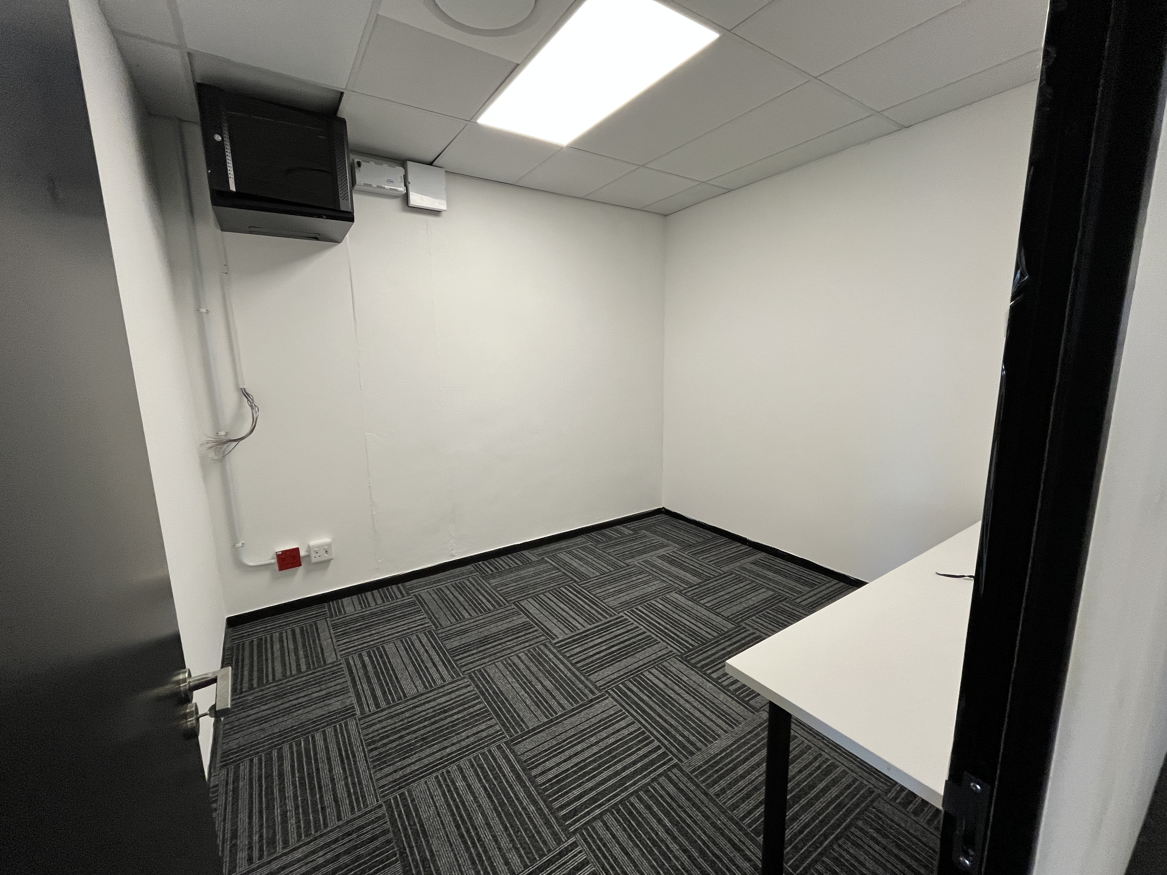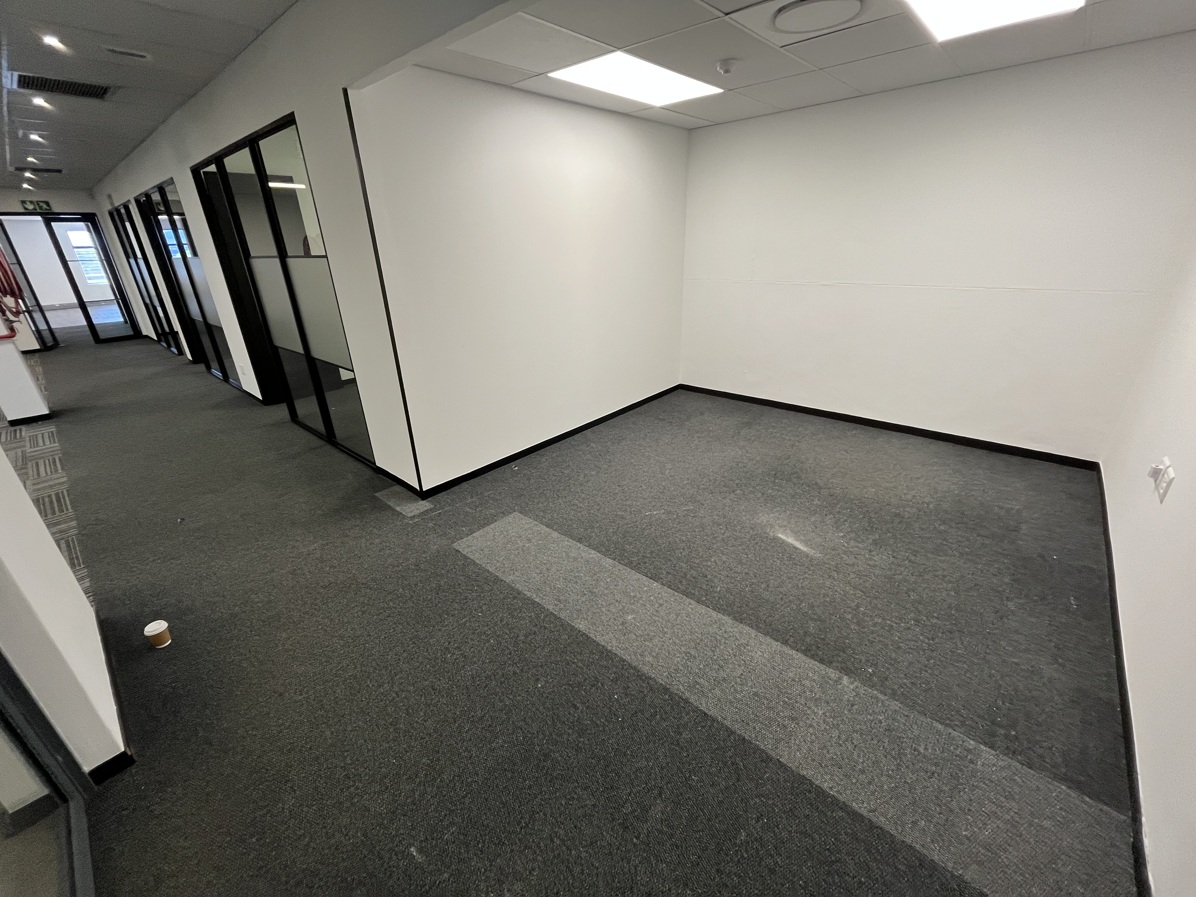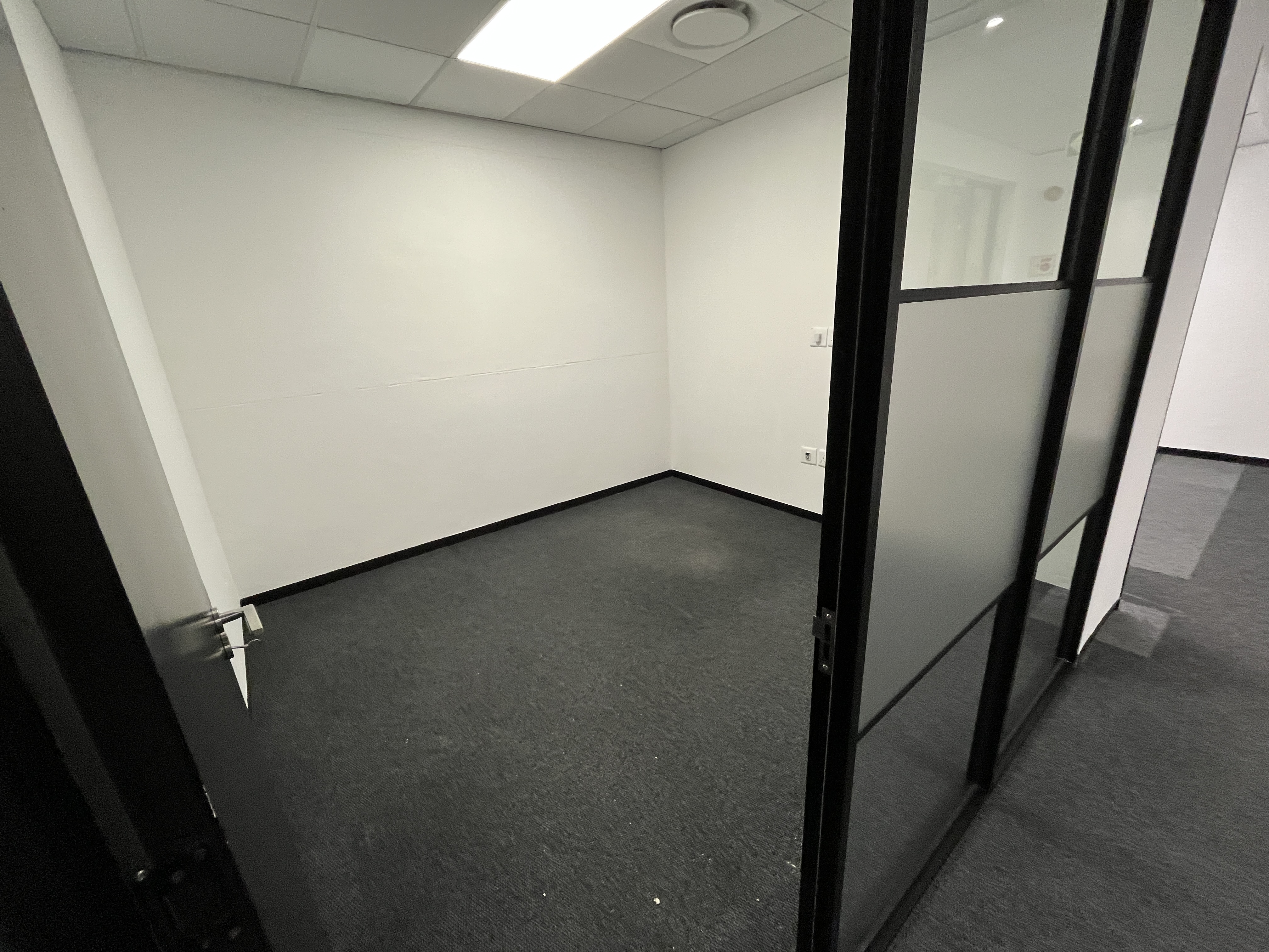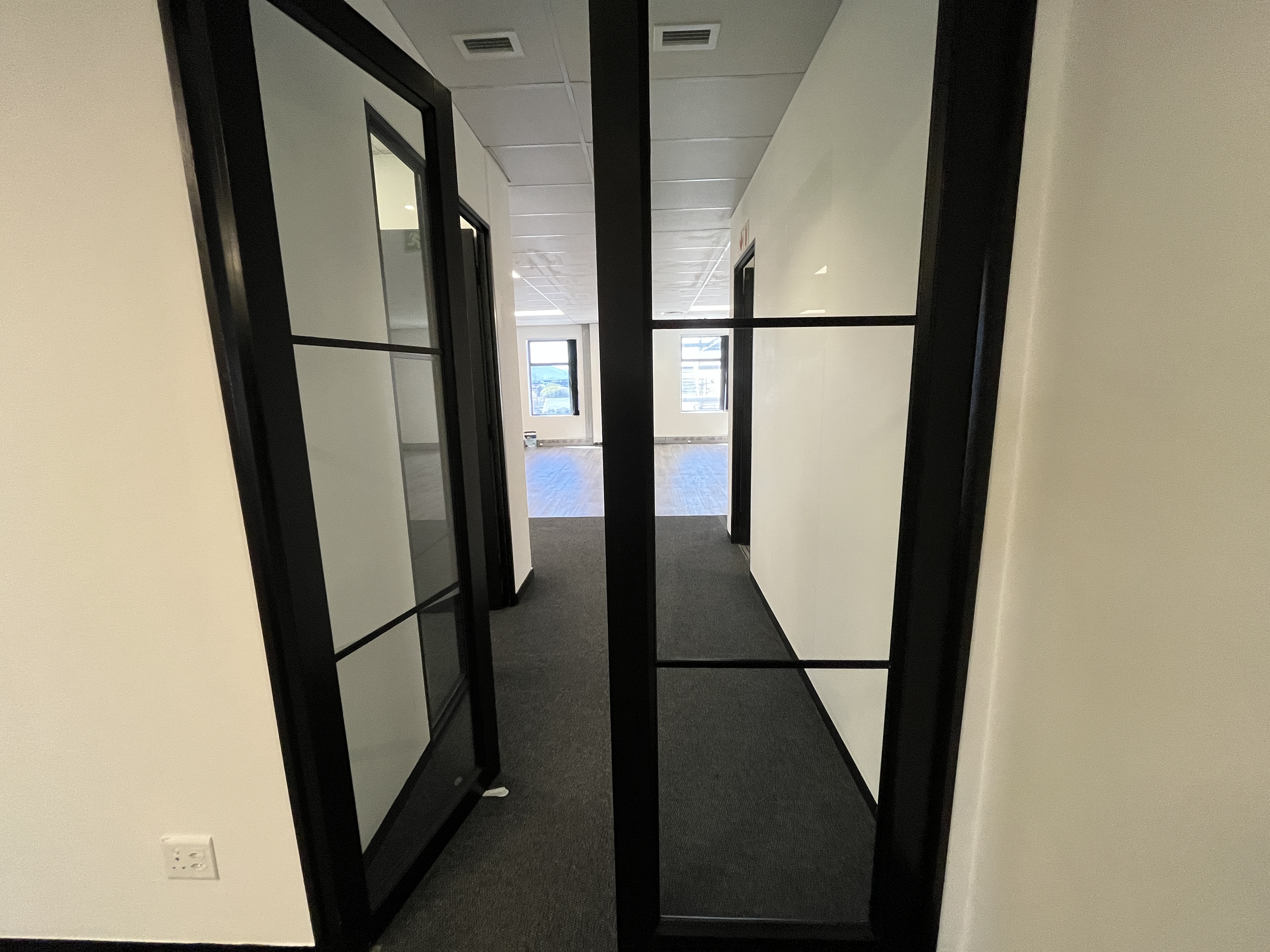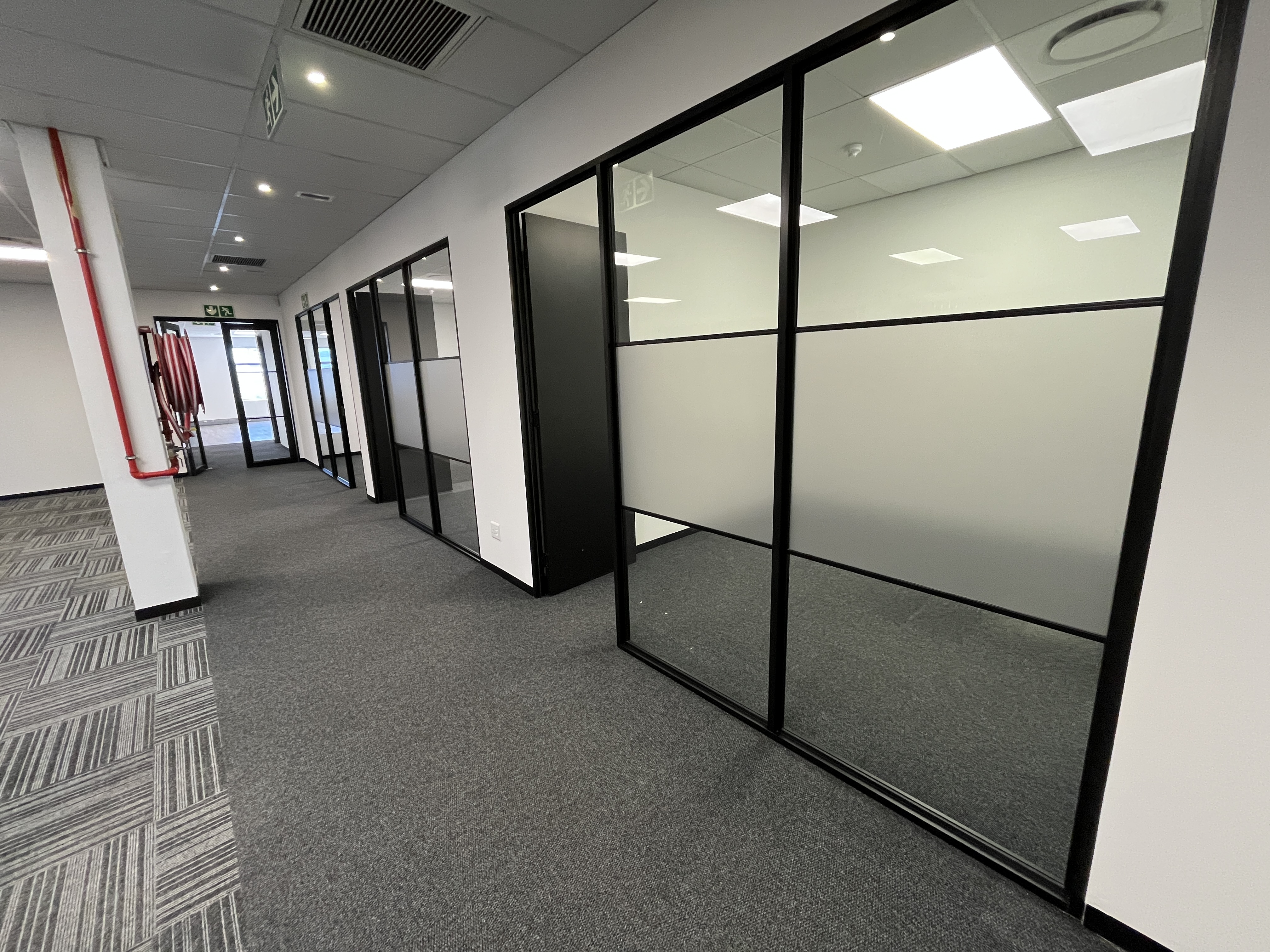 Brand-new carpets enhance the professional finish, while stylish glass-partitioned cubicles with sleek black framing create a contemporary aesthetic without compromising natural light or openness. Large windows wrap the main workspace, allowing abundant natural light to filter through and creating a bright, productive environment.
