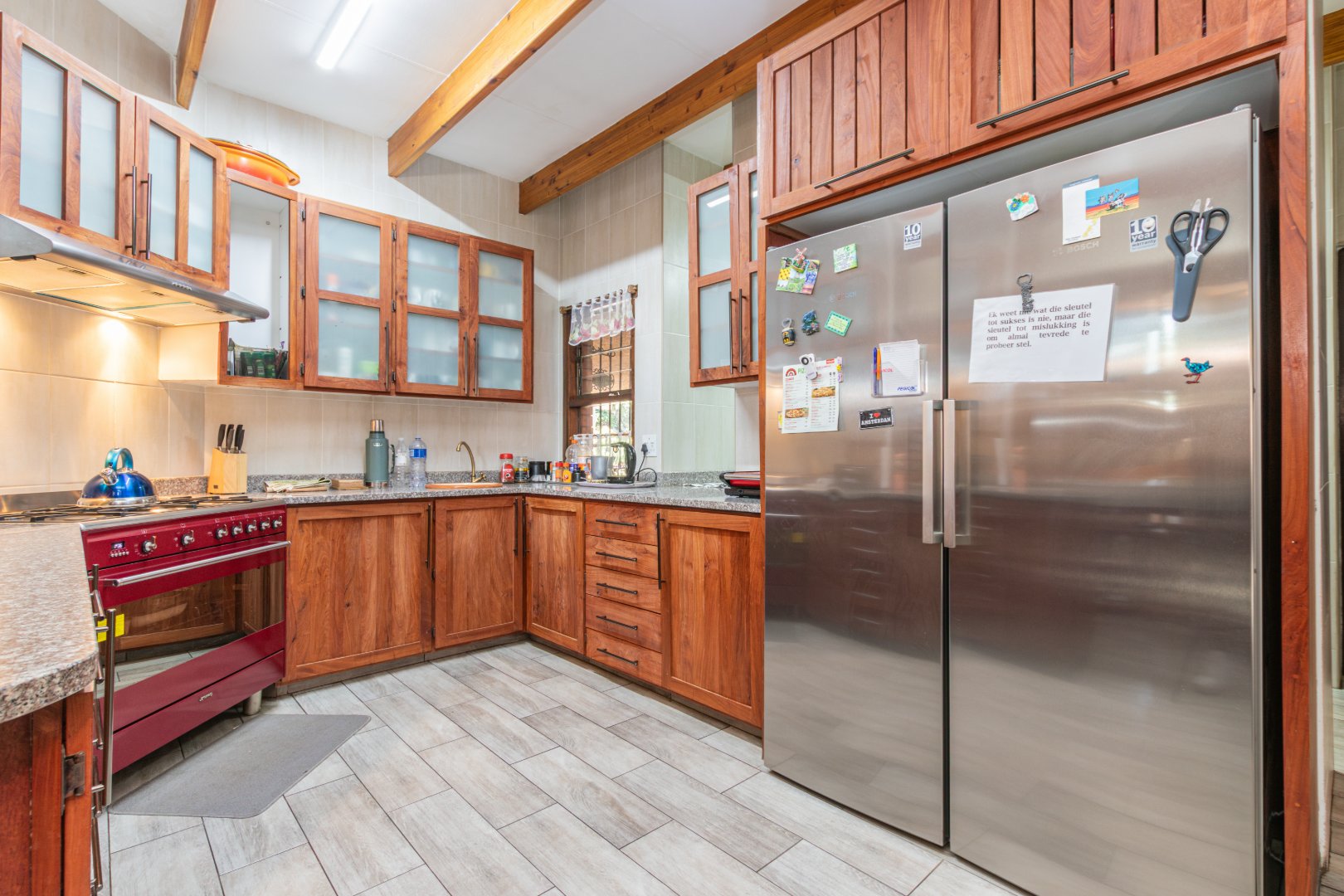 The home offers two larger-than-normal garages, servants quarters, and a lovely kitchen with gas stove, granite tops, a separate pantry, scullery and laundry. It includes 3 bedrooms, 2 full bathrooms, a guest toilet, and a main bedroom with an extended sunroom perfect for a gym, relaxation area or baby room.
