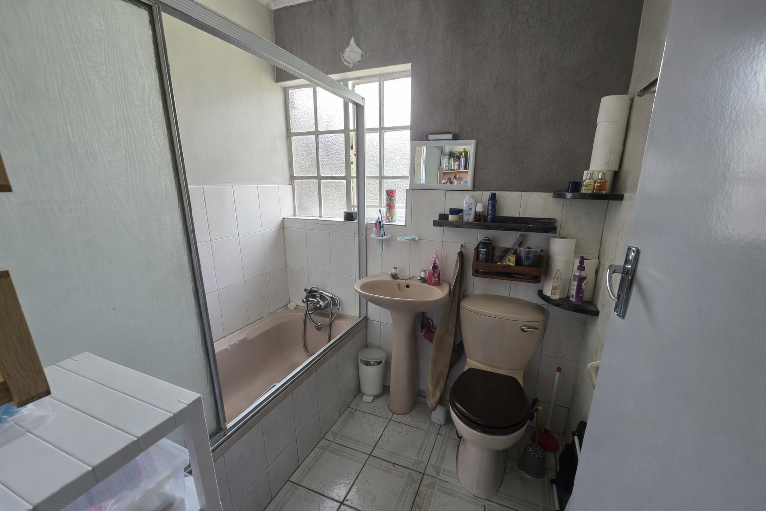 Down the passage you have a bathroom, with bath and shower over bath.