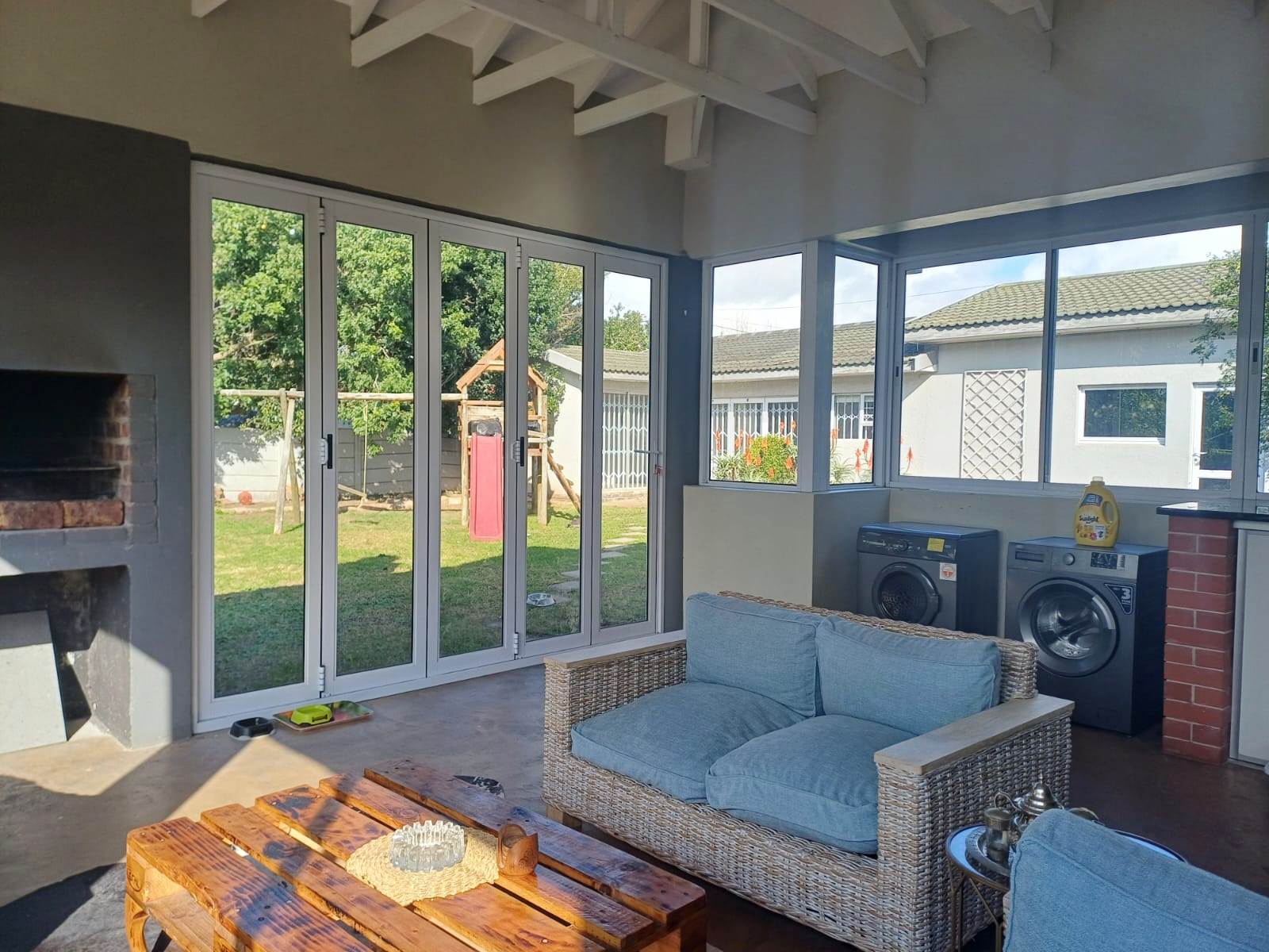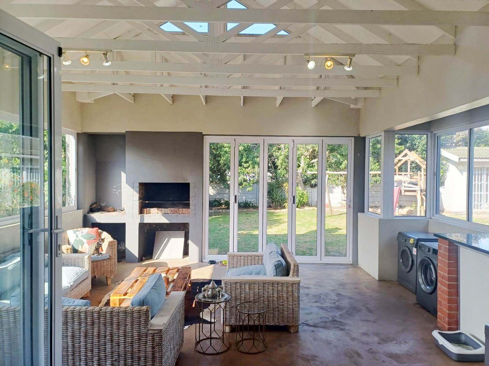 Indoor Braai Area: Features foldable doors/windows, exposed trusses, and a Stackadoor, creating a seamless indoor-outdoor living experience that opens directly to the spacious garden – ideal for summer gatherings.