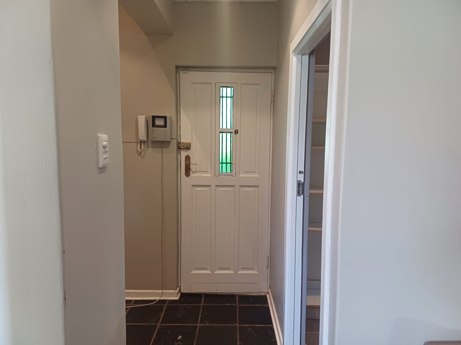 Linen Storage: A convenient linen cupboard in the passageway.