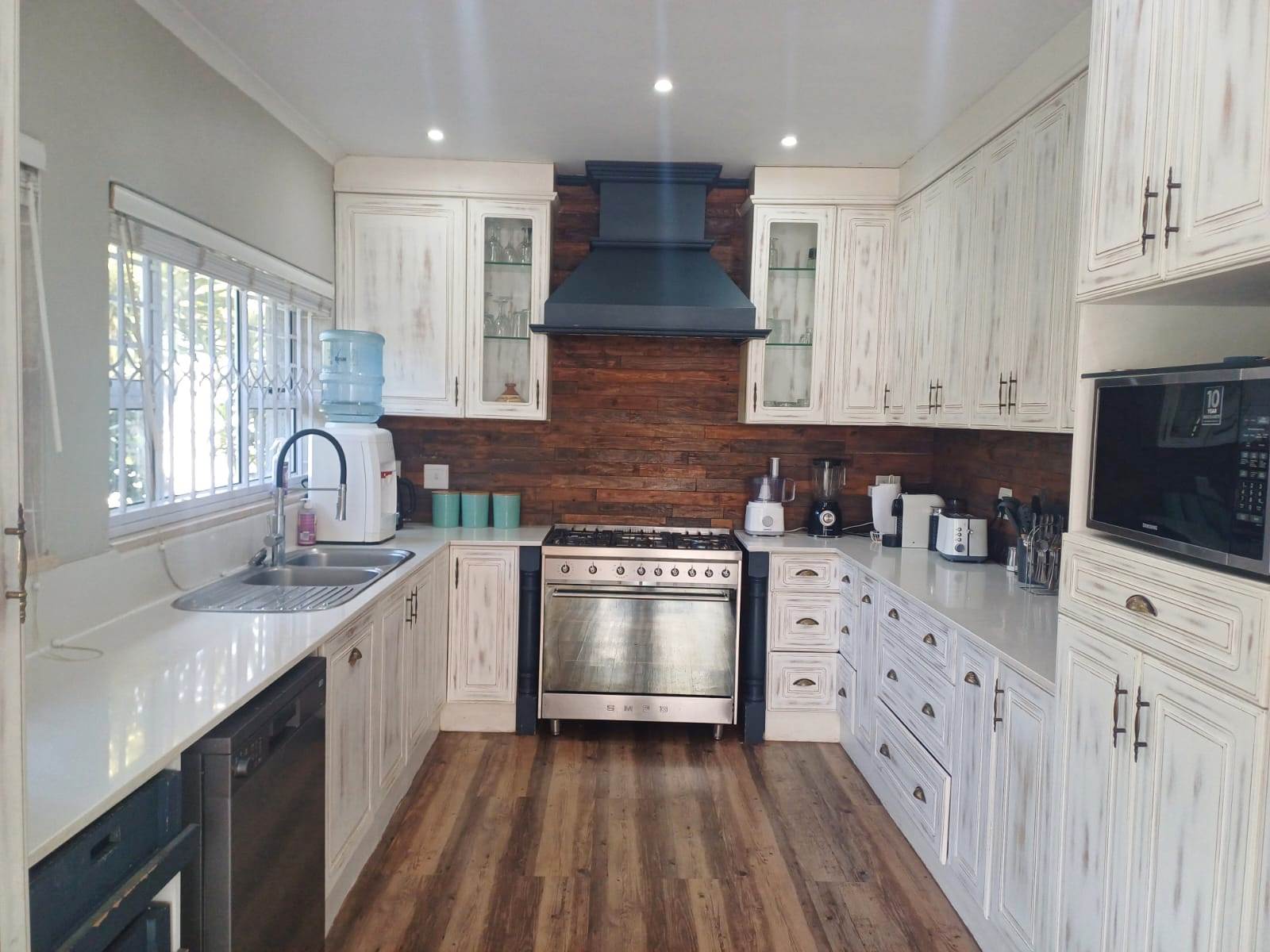 Chef’s Kitchen: Boasts a Smeg gas oven, extractor, double basin, laminated floors with stunning cupboards design.