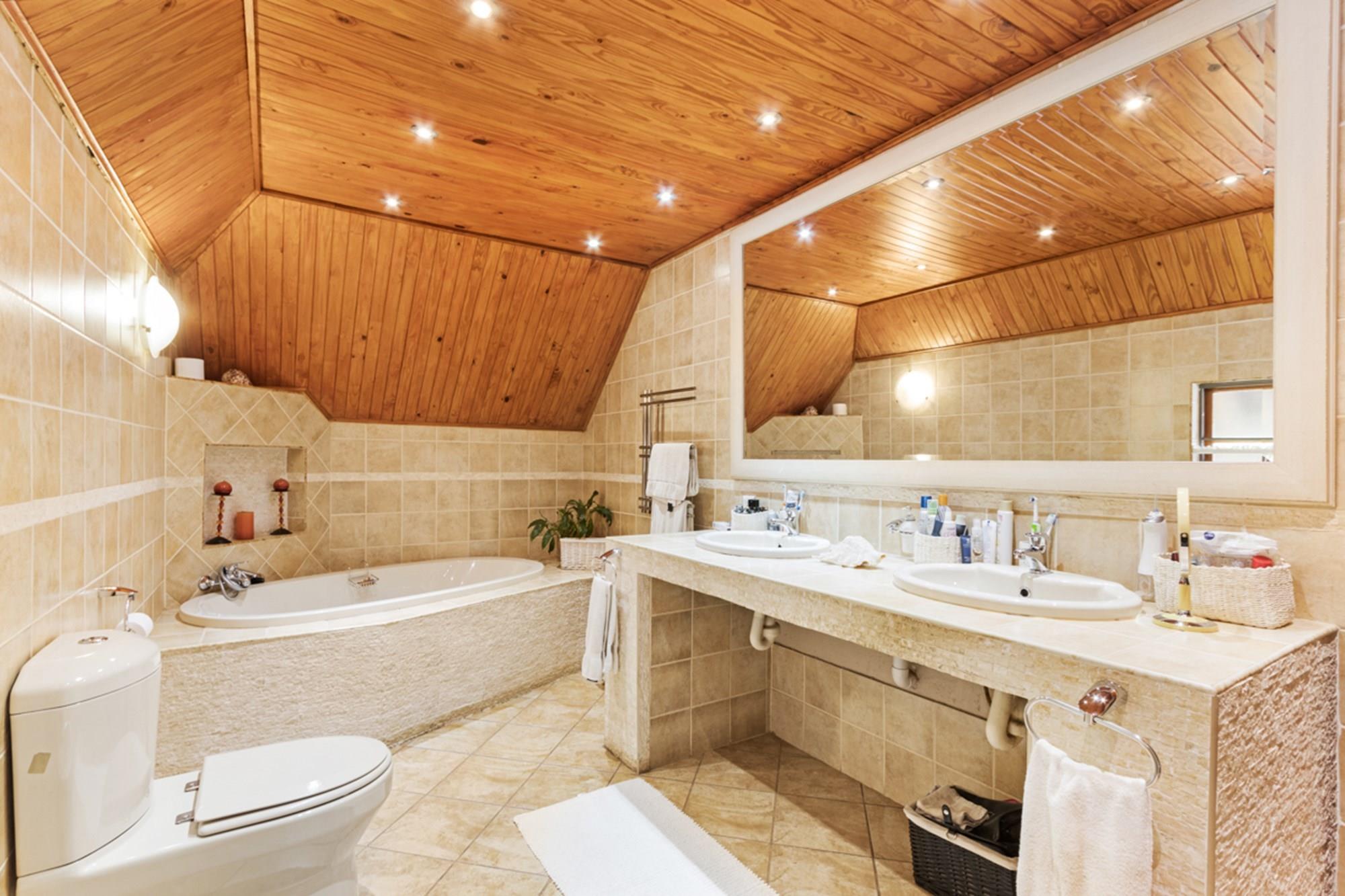Main Bathroom:Stylish and spacious, with tiled flooring, a bidet, a toilet, a bath, a shower, and dual basins.