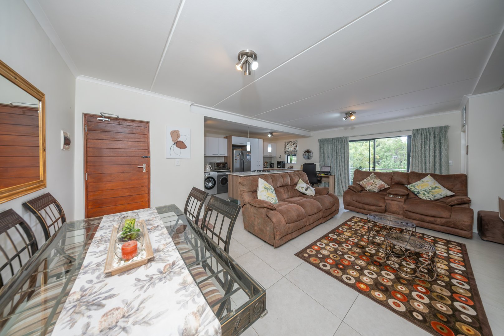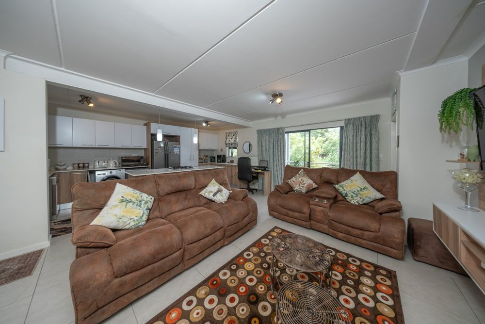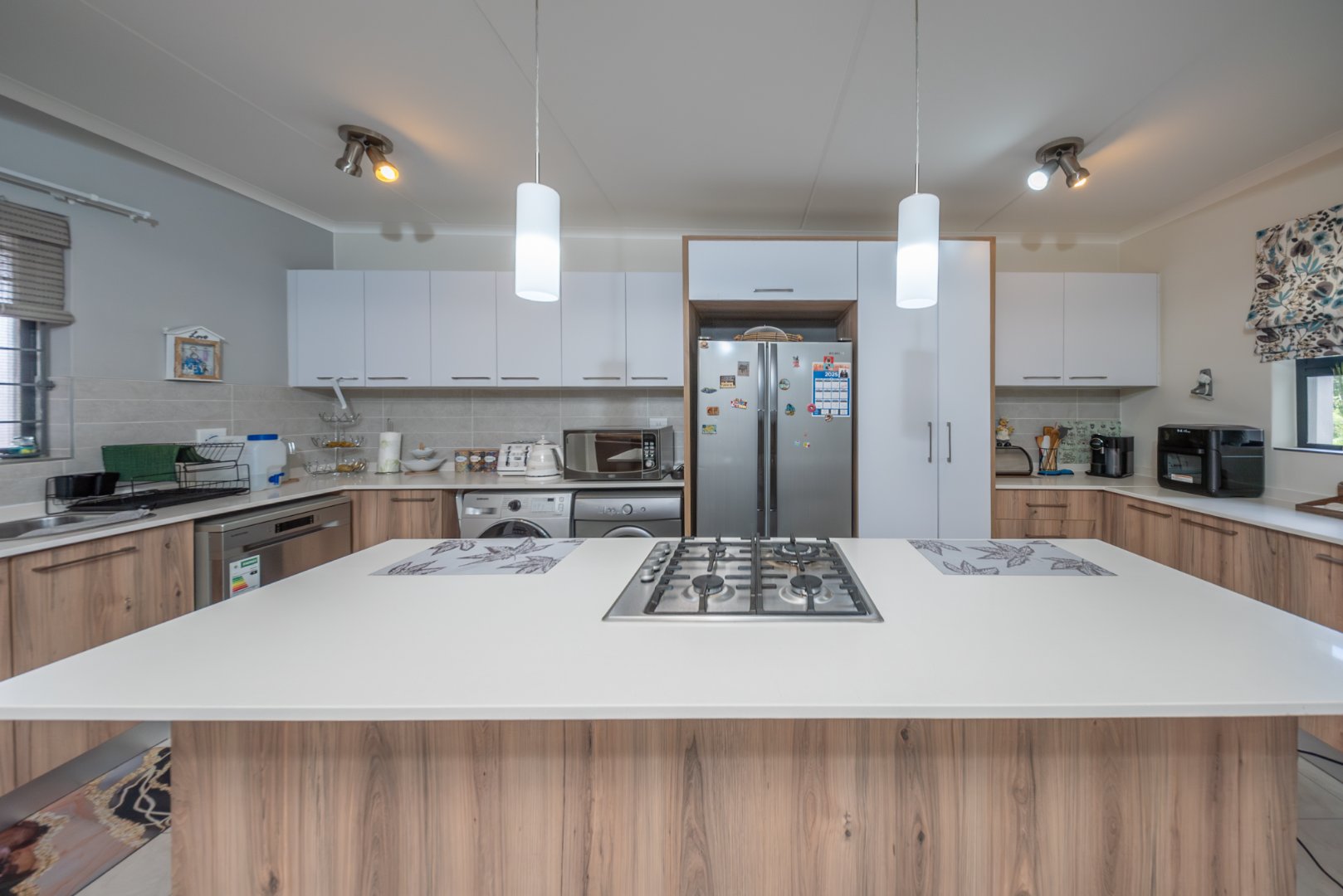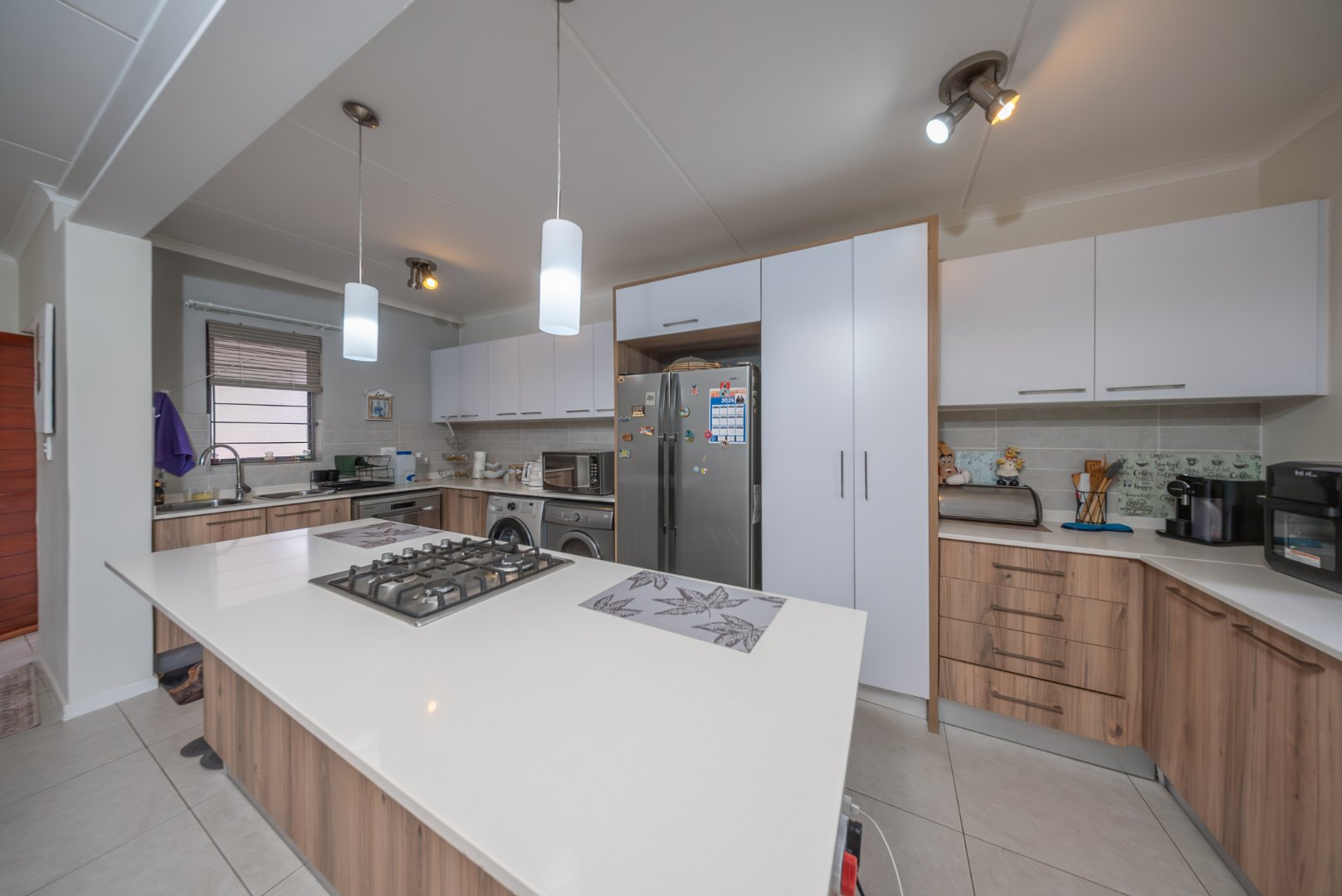 The home features a spacious open-plan layout with a gourmet kitchen, complete with a gas hob and space for three appliances. The bright lounge and dining area flow seamlessly onto a covered patio with a built-in gas braai, offering beautiful views of the Modderfontein Nature Reserve — ideal for relaxed entertaining.