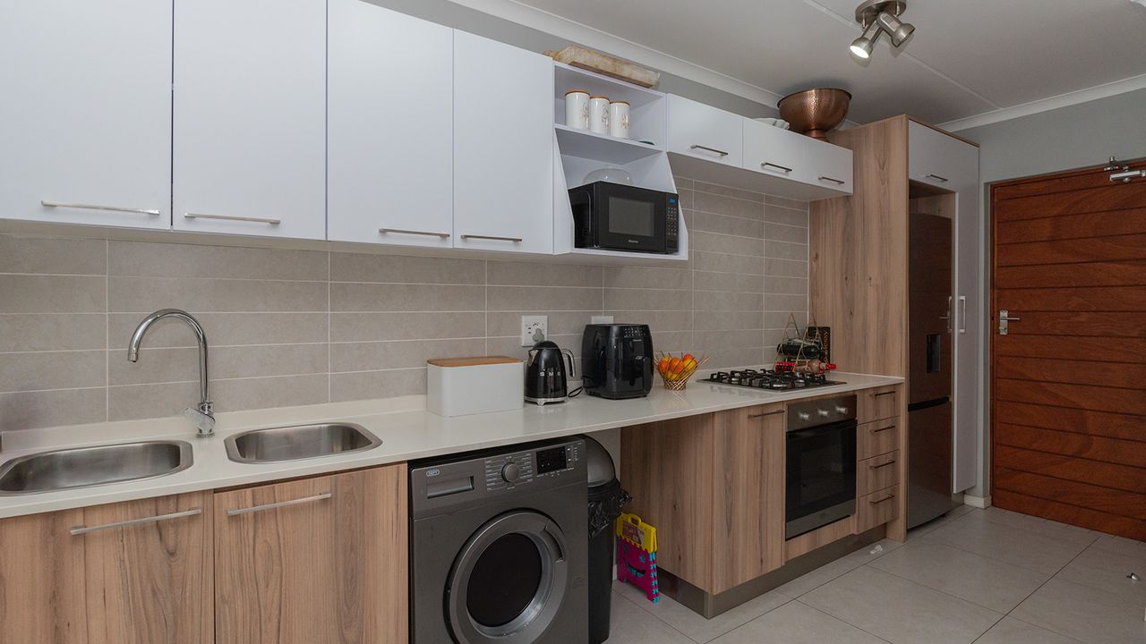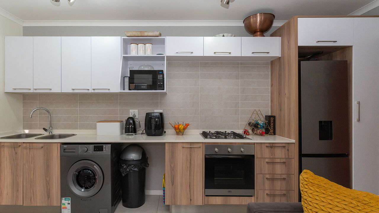 The open plan modern kitchen has a gas hob, electric oven and ample cupboard space.