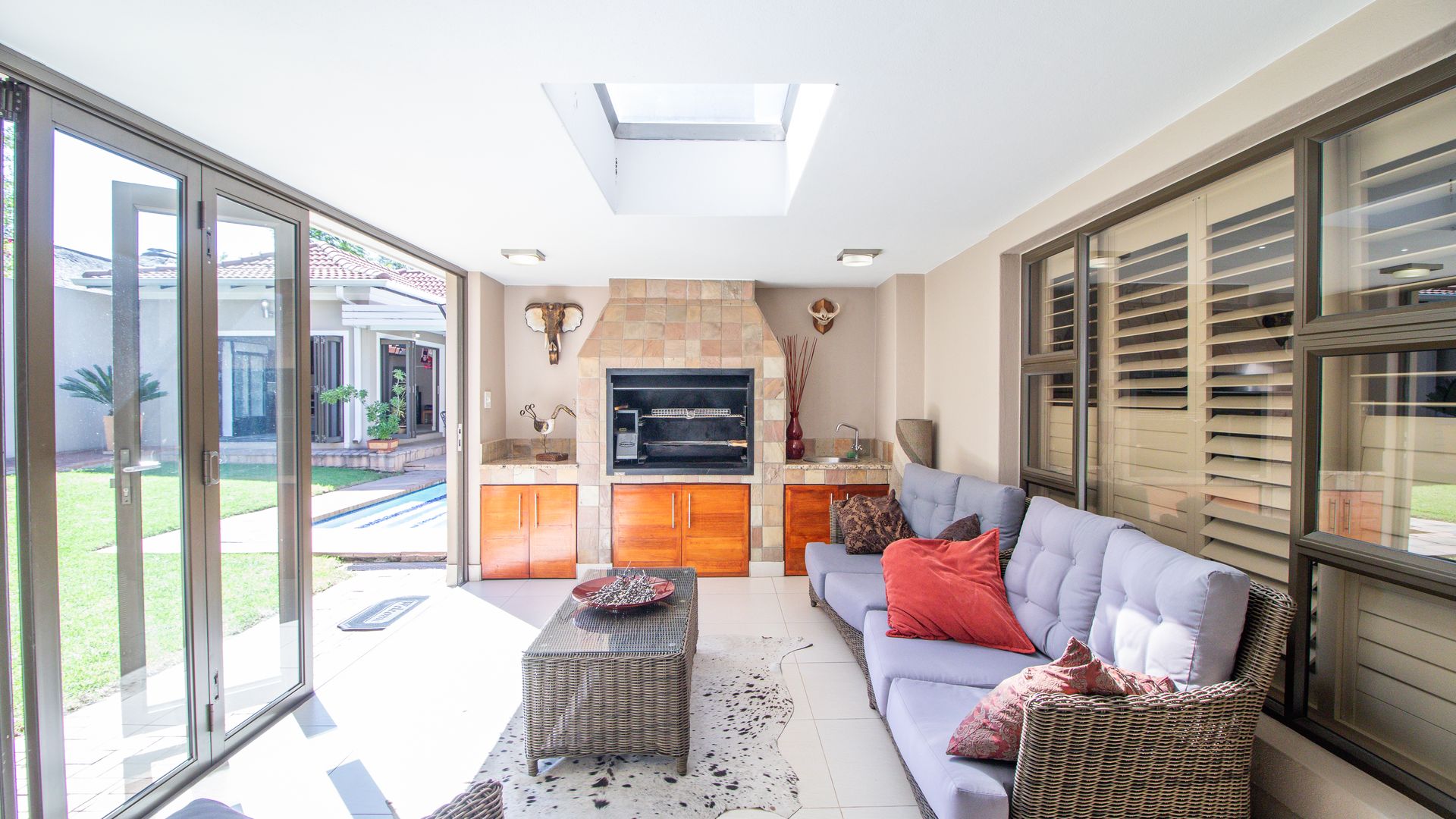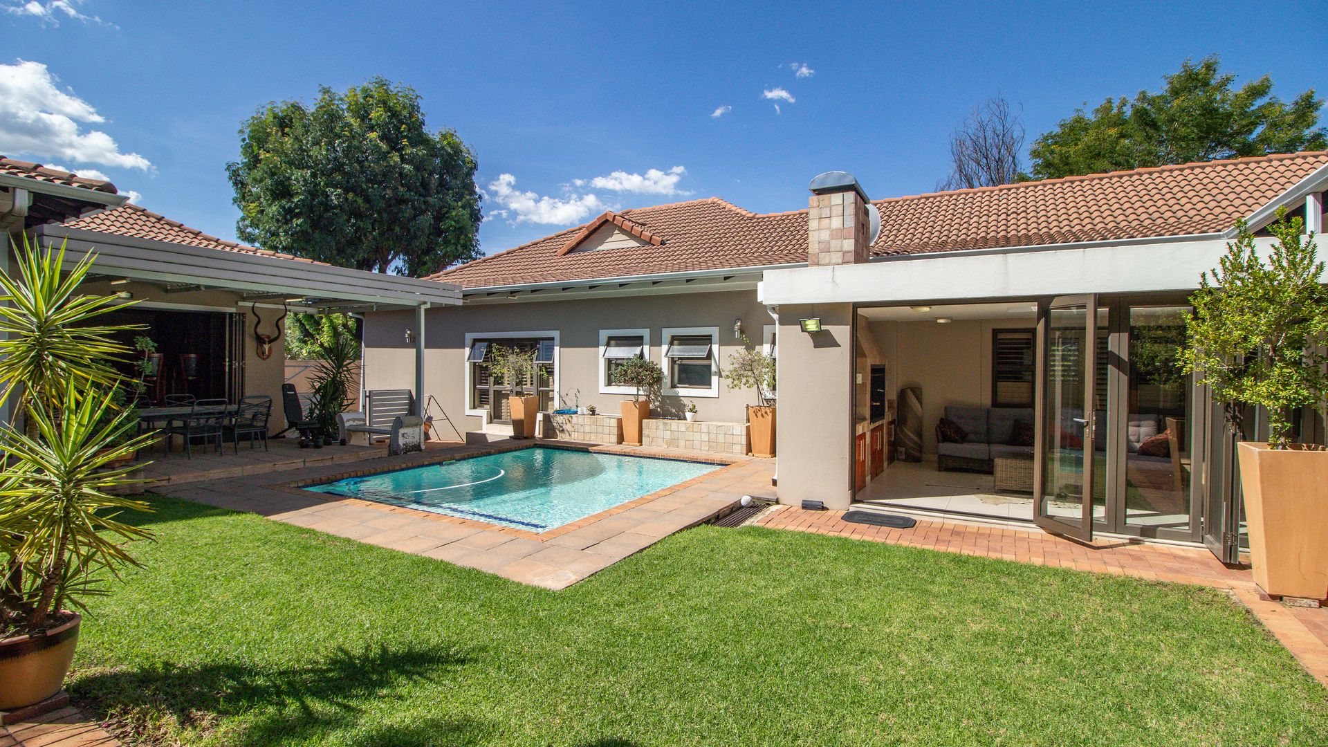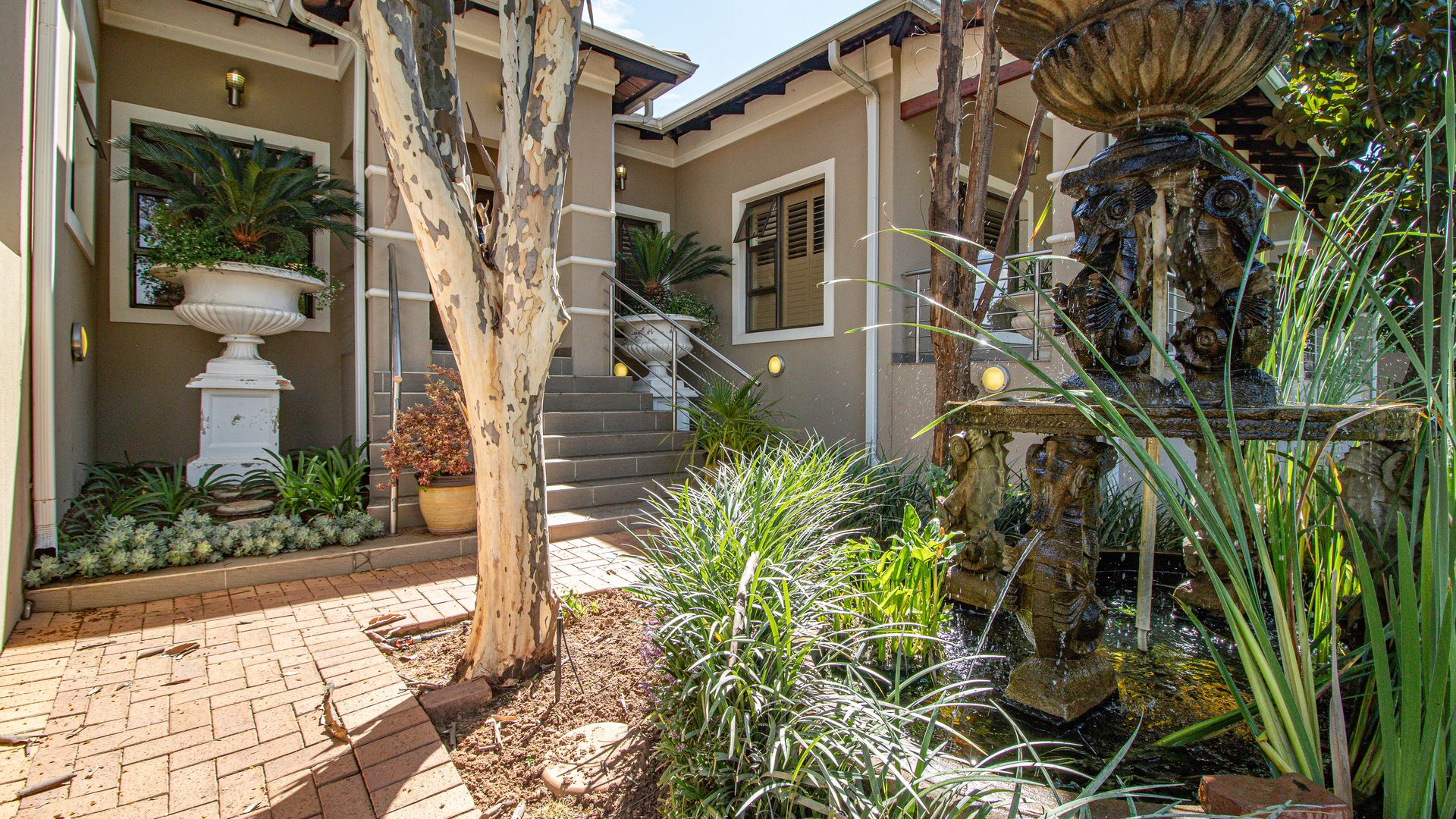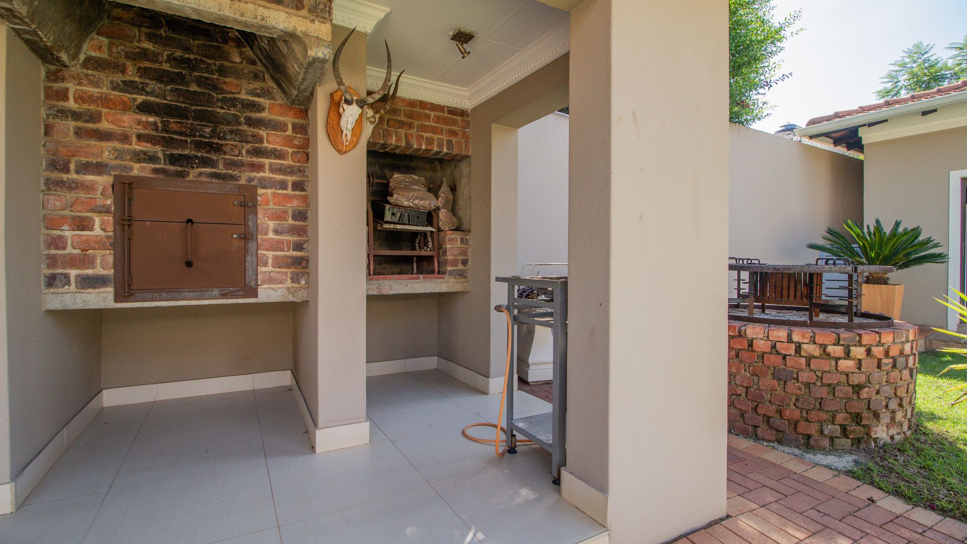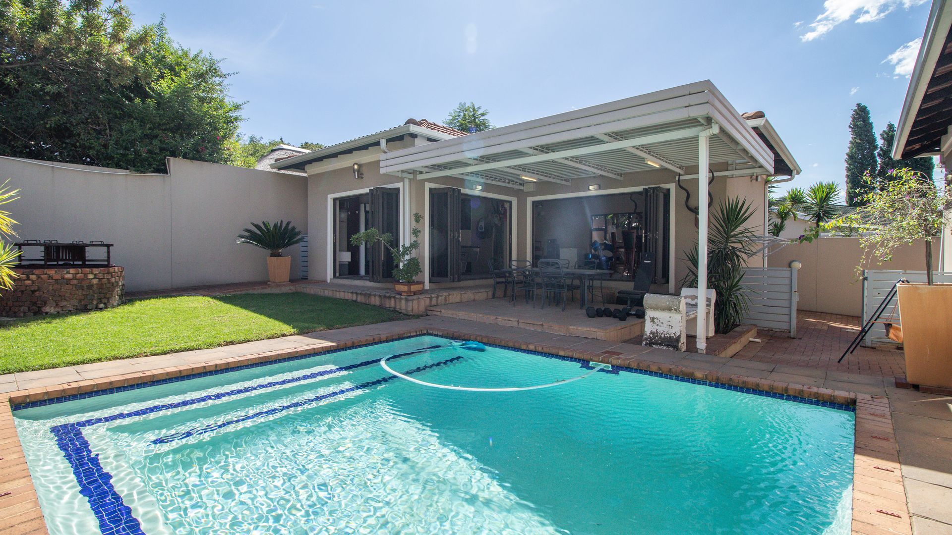 Great entertainment areas with a covered patio, built-in braai plus a separate area which includes a fitted bar, kitchenette and guest bathroom. Well positioned pool in a tranquil landscaped garden with water feature.