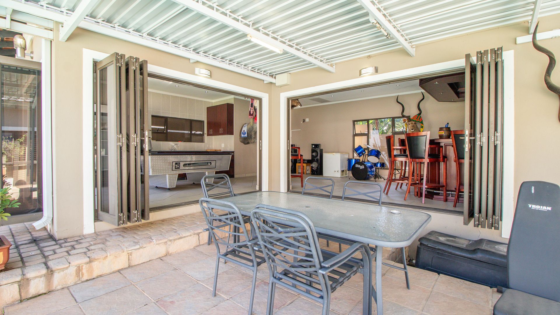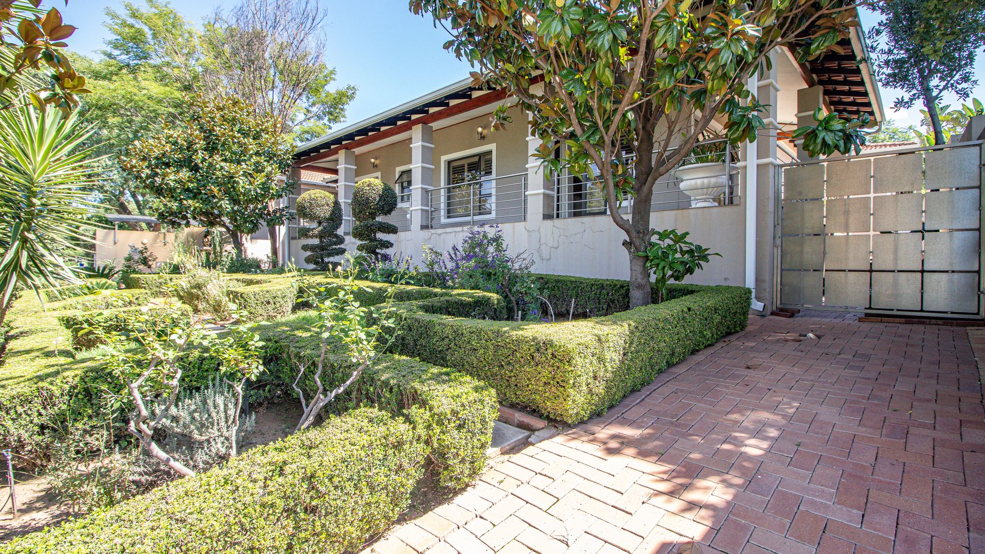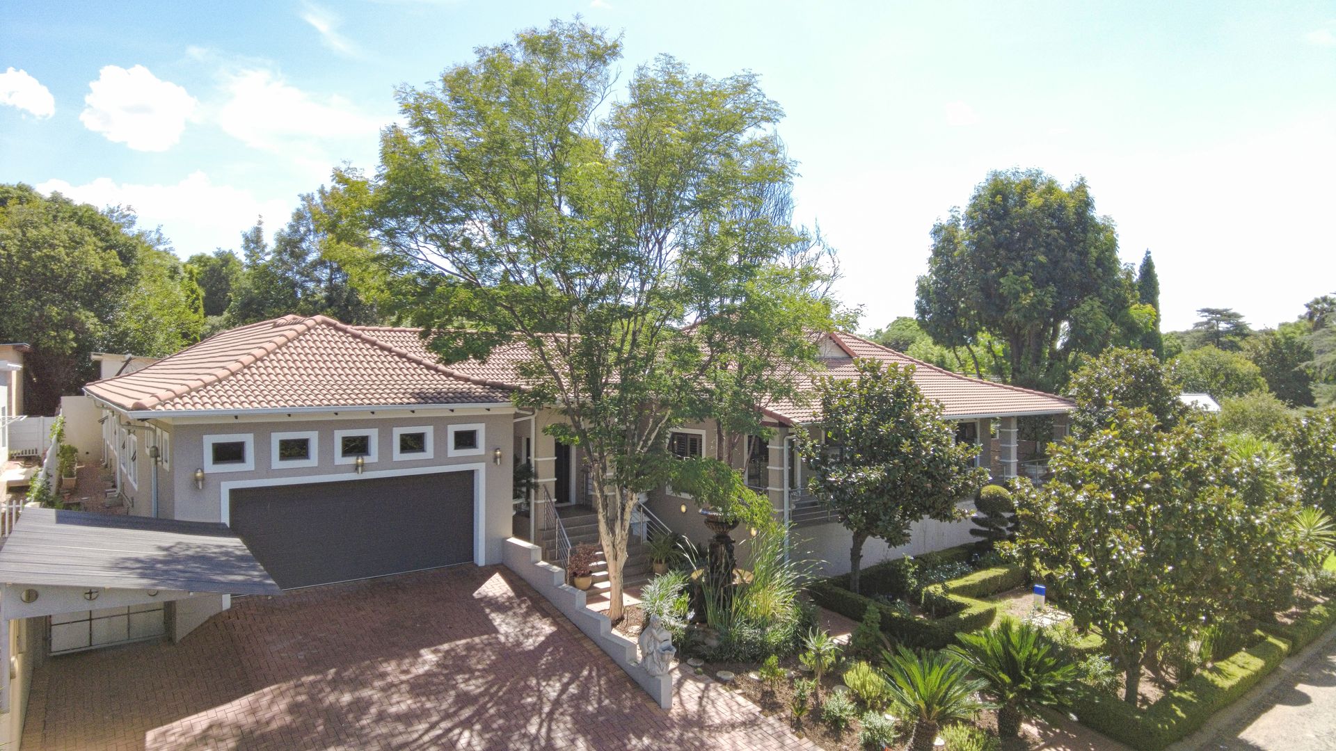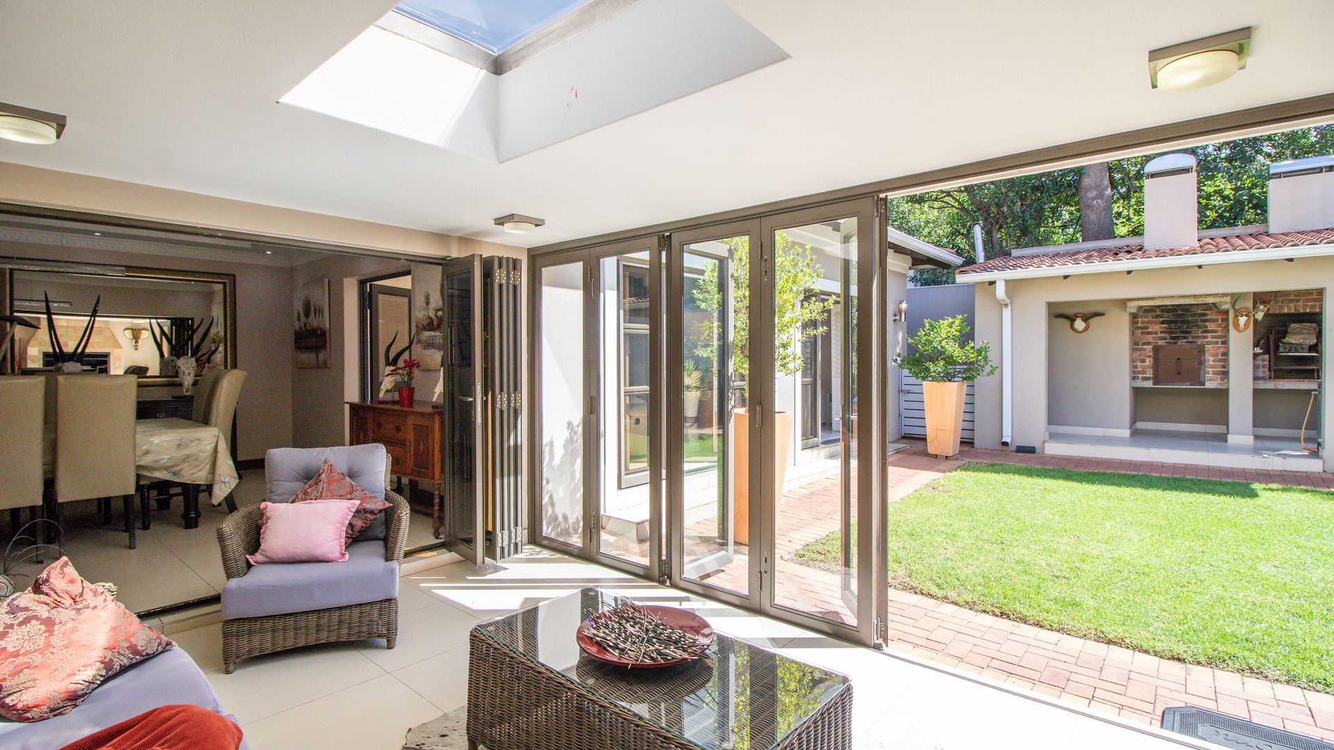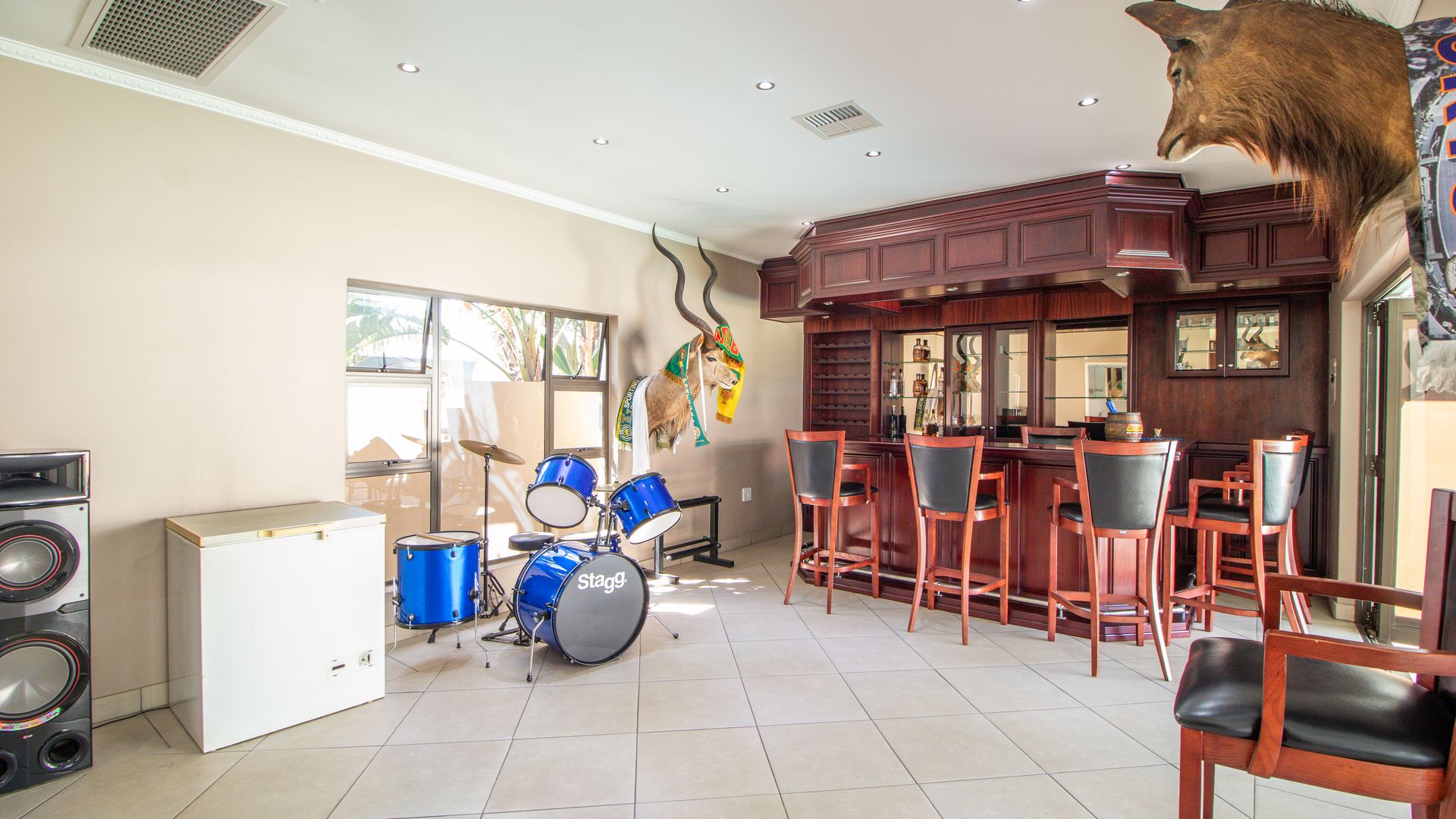 Great entertainment areas with a covered patio, built-in braai plus a separate area which includes a fitted bar, kitchenette and guest bathroom. Well positioned pool in a tranquil landscaped garden with water feature.