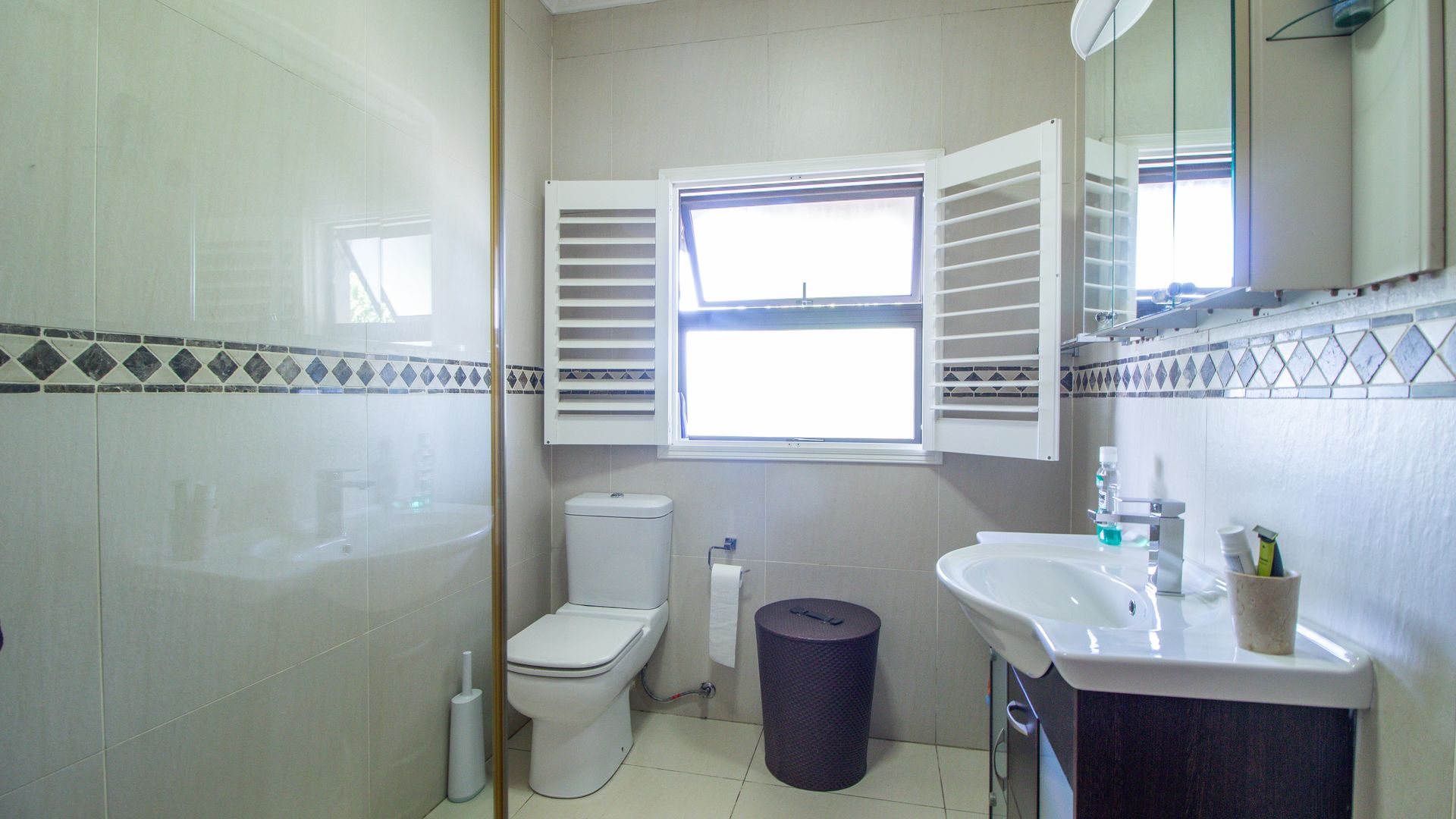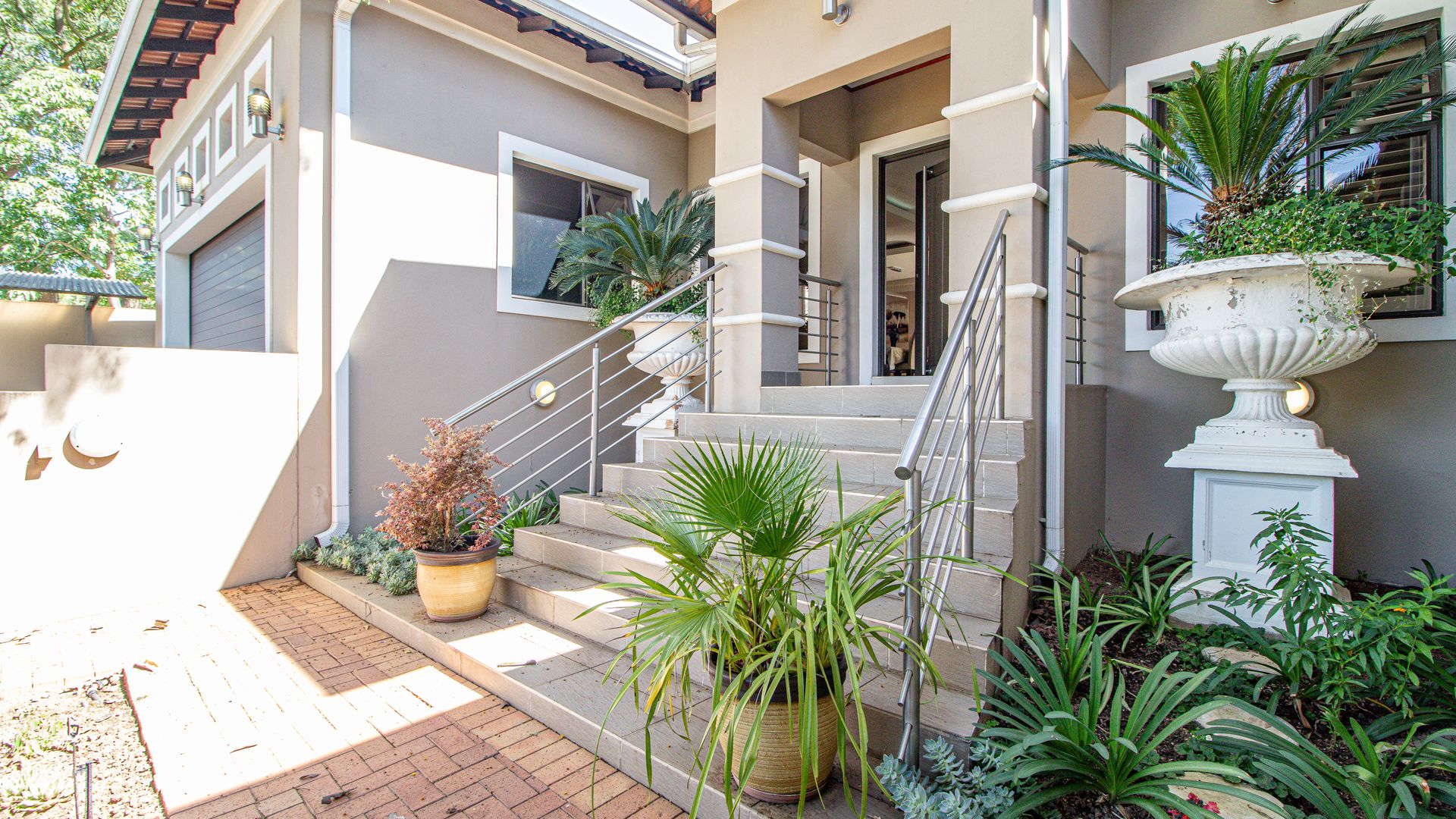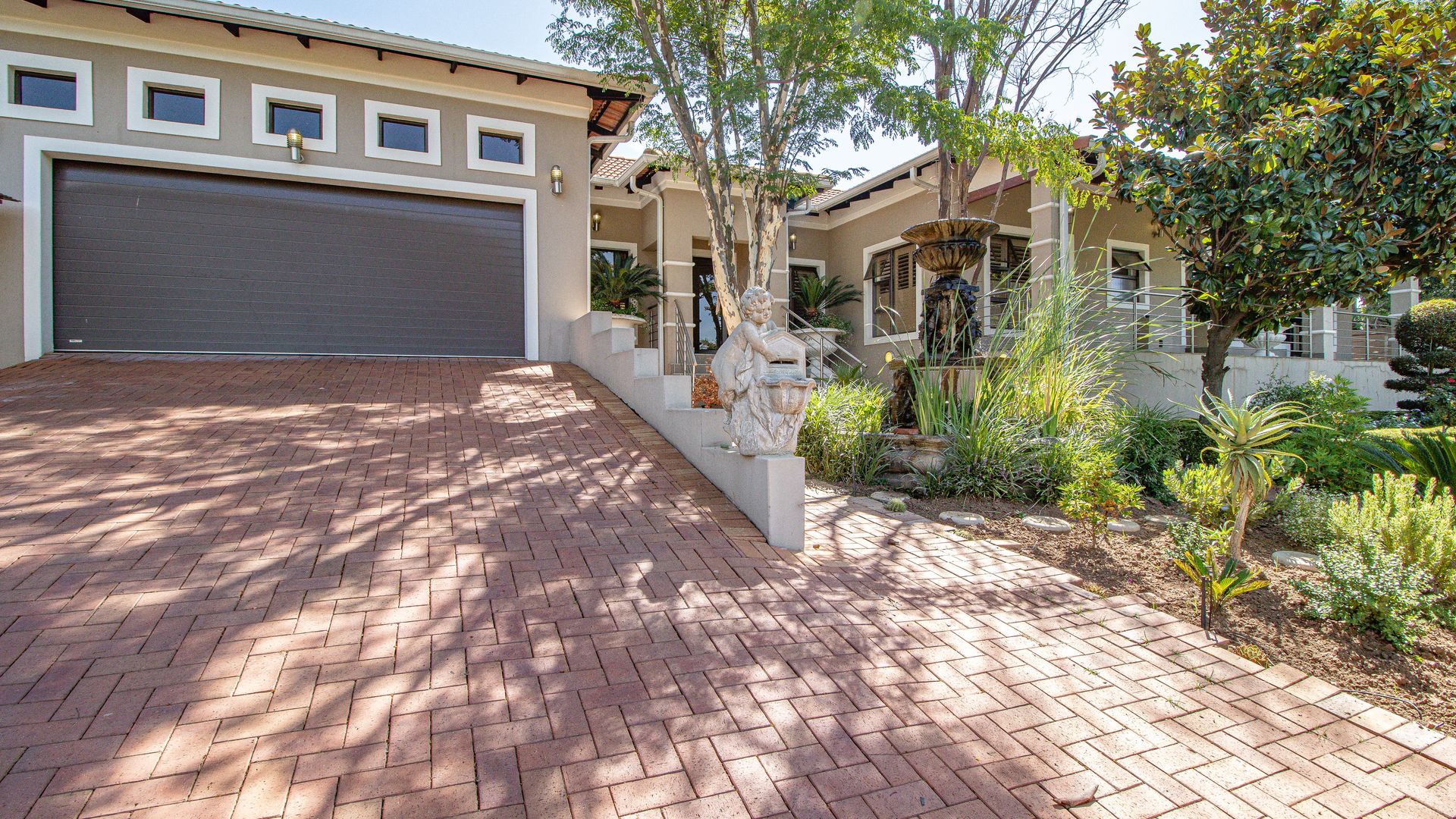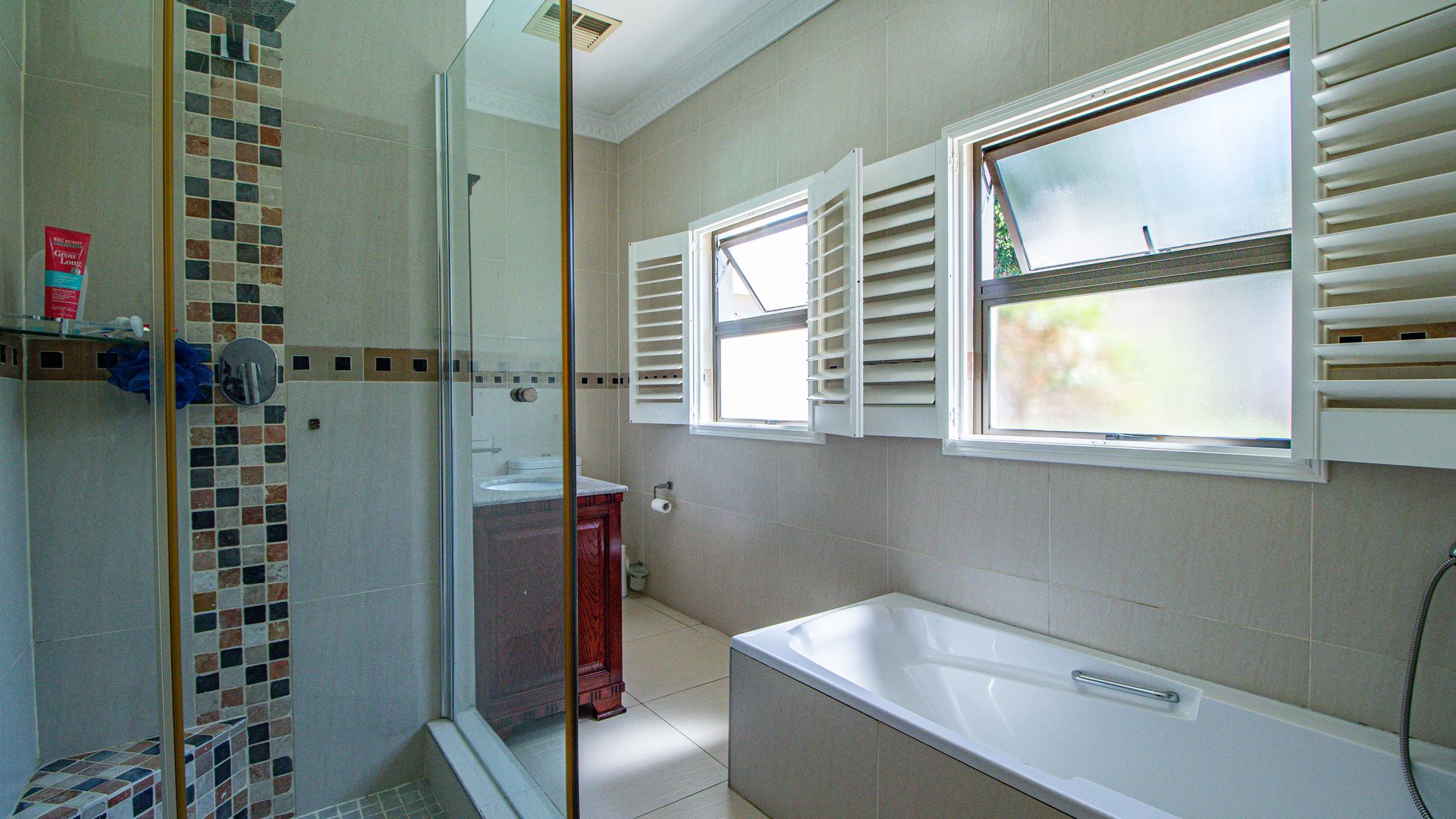 Great entertainment areas with a covered patio, built-in braai plus a separate area which includes a fitted bar, kitchenette and guest bathroom. Well positioned pool in a tranquil landscaped garden with water feature.