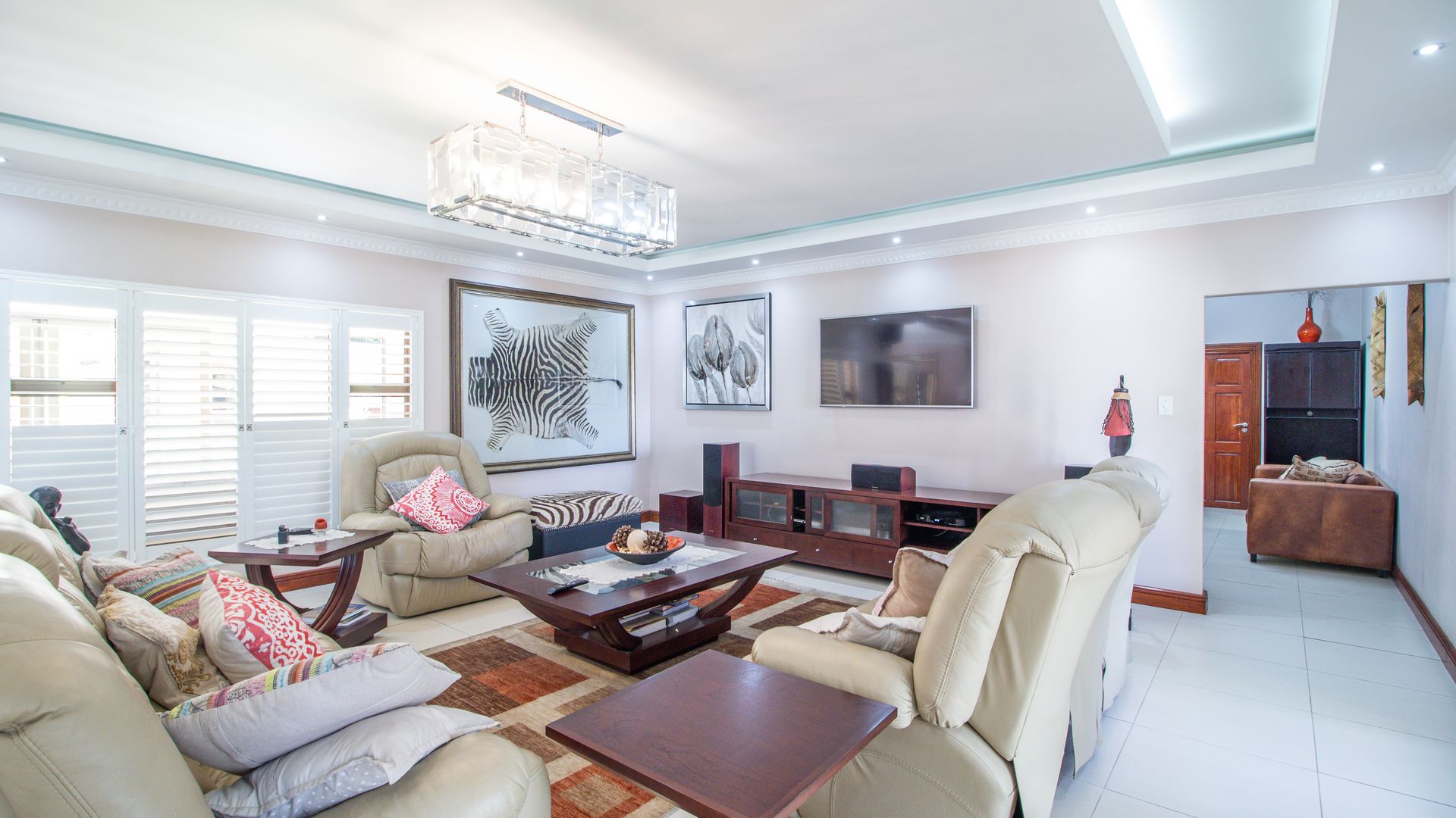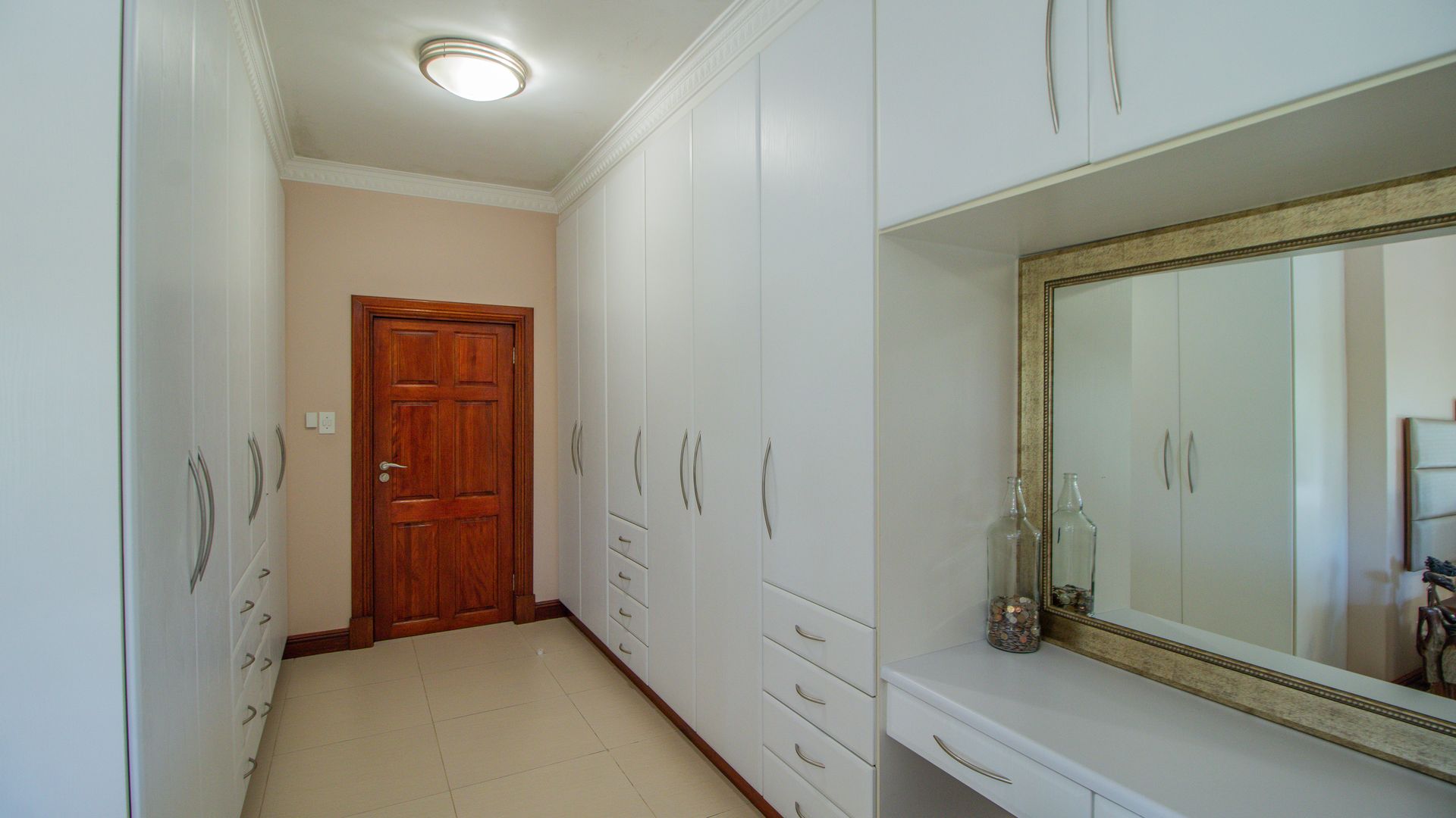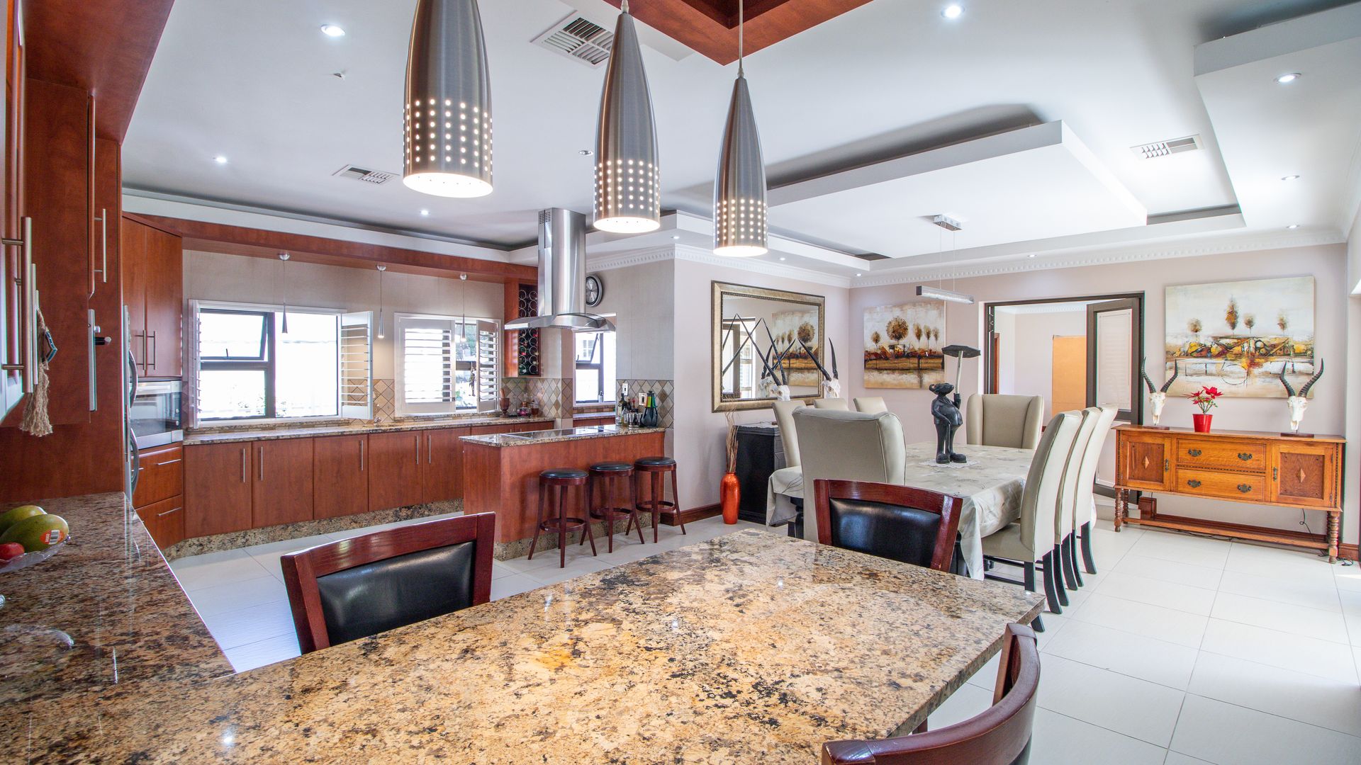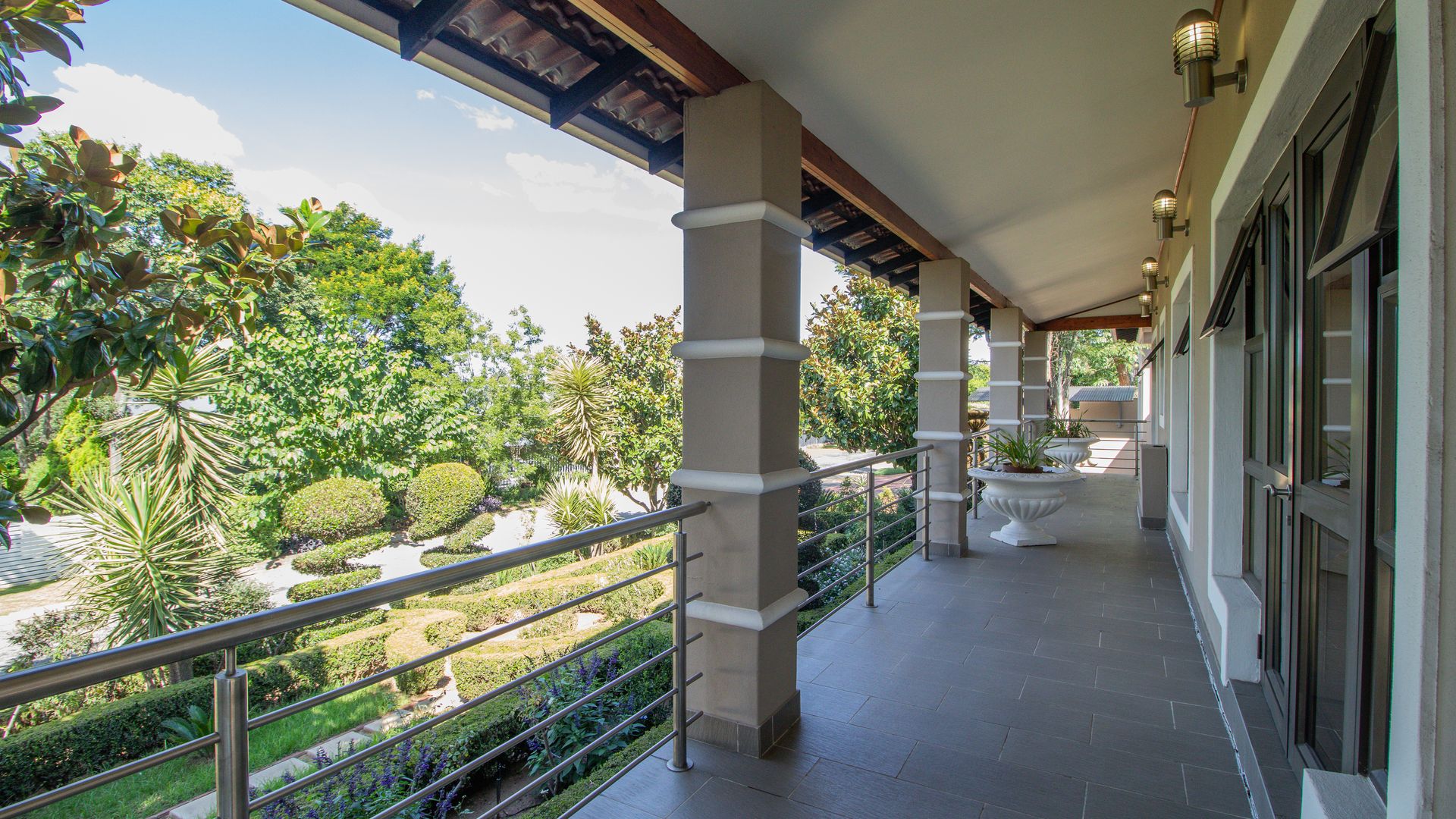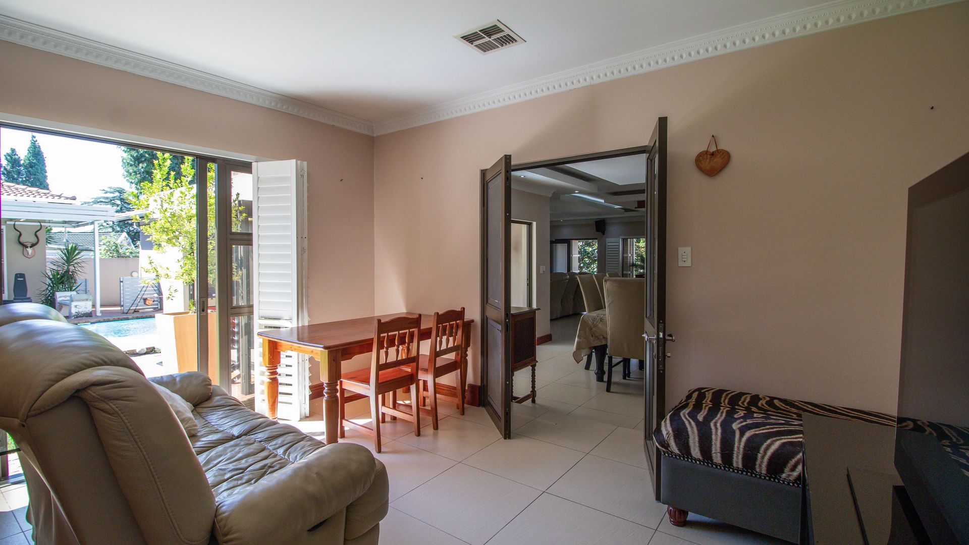 Great entertainment areas with a covered patio, built-in braai plus a separate area which includes a fitted bar, kitchenette and guest bathroom. Well positioned pool in a tranquil landscaped garden with water feature.