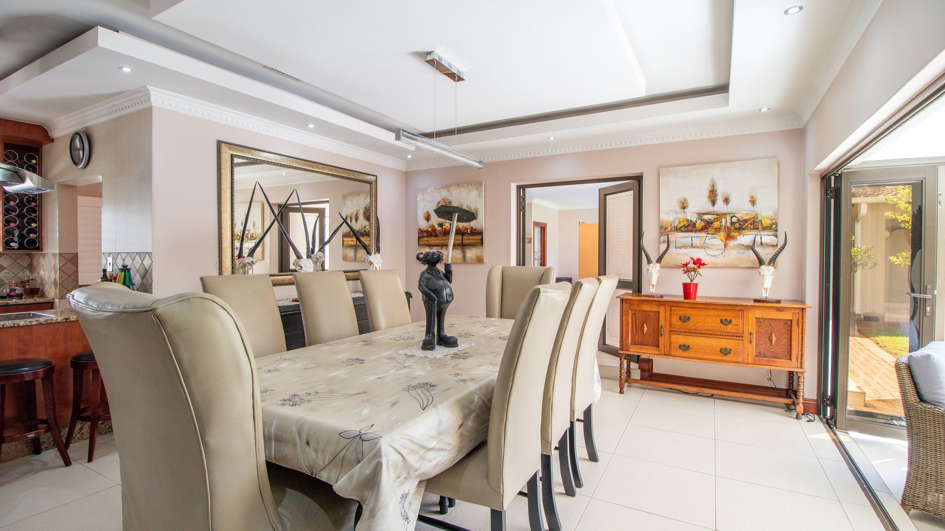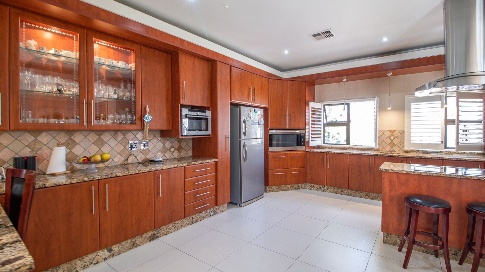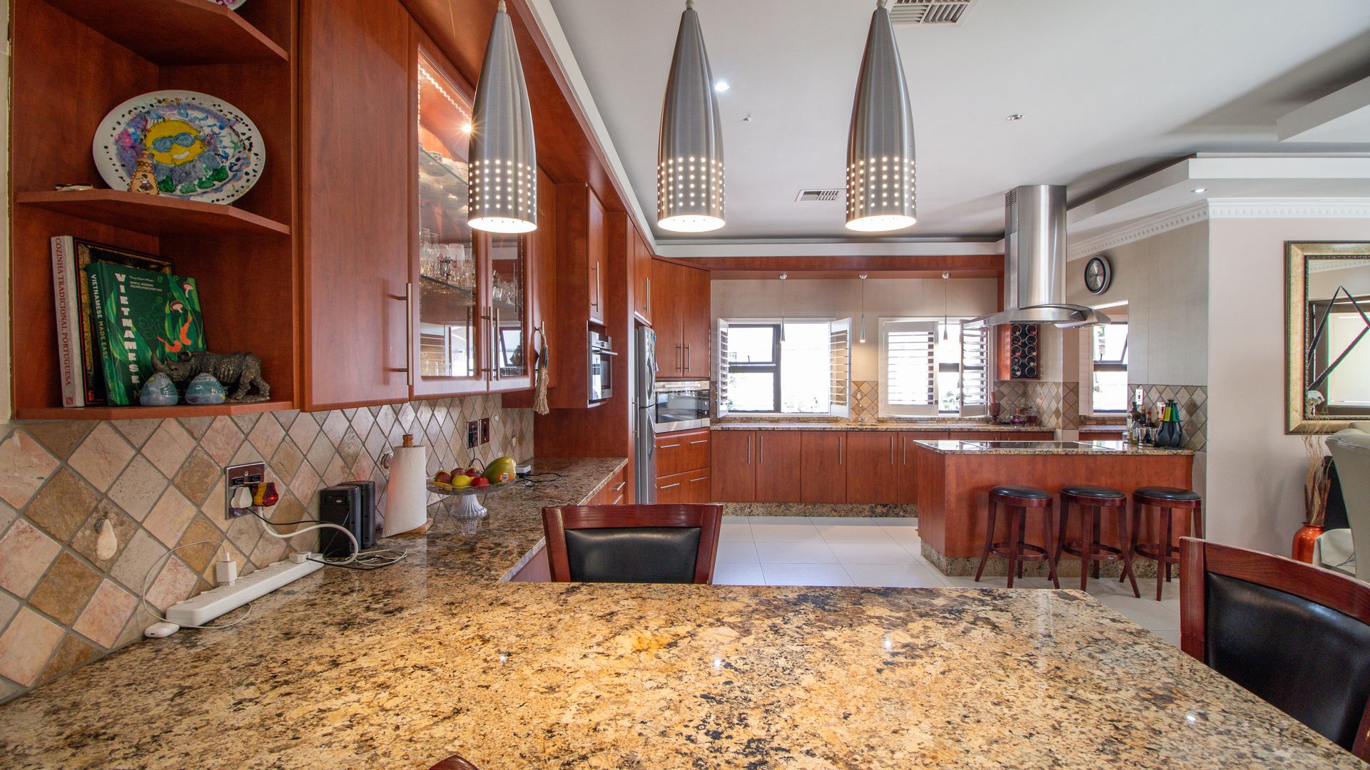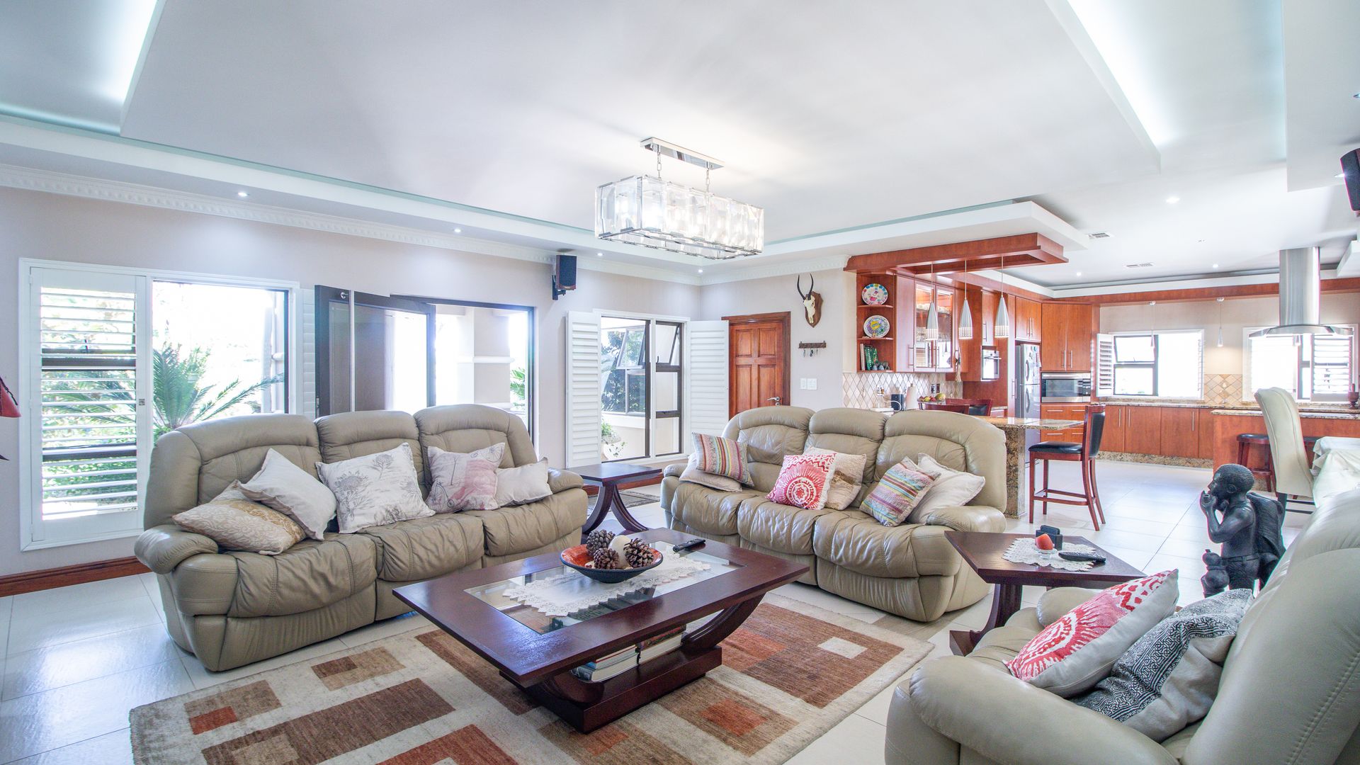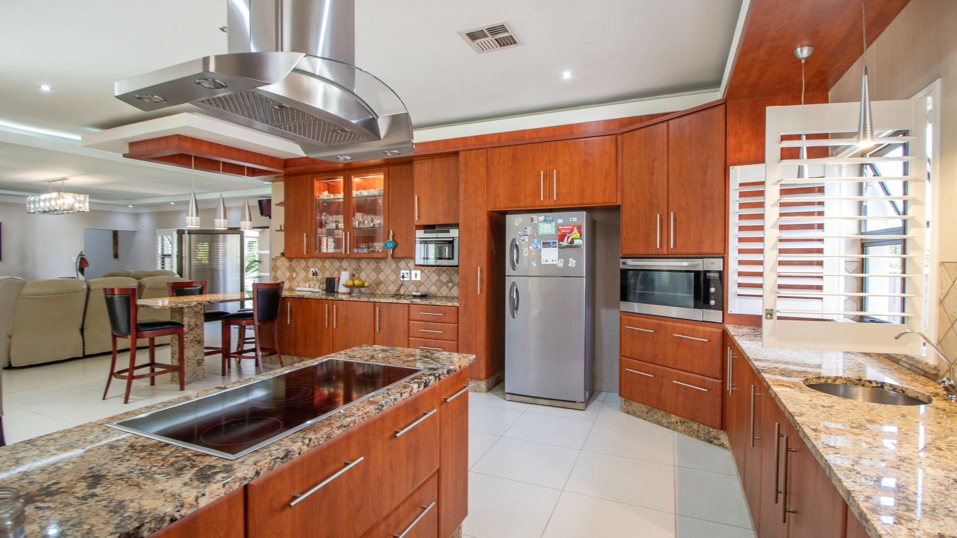 Great entertainment areas with a covered patio, built-in braai plus a separate area which includes a fitted bar, kitchenette and guest bathroom. Well positioned pool in a tranquil landscaped garden with water feature.