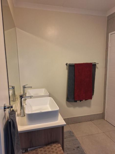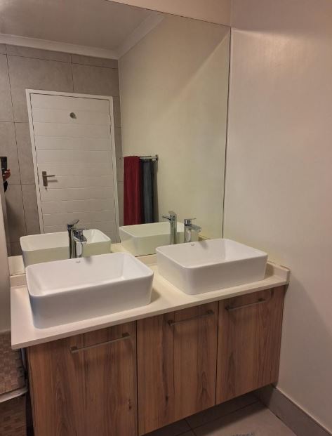 The spacious main bedroom includes ample built-in cupboards and a modern en-suite bathroom with double basins and a walk-in shower. Two additional bedrooms, also tiled and with generous cupboard space, share a full bathroom complete with bath, shower, basin, and toilet.