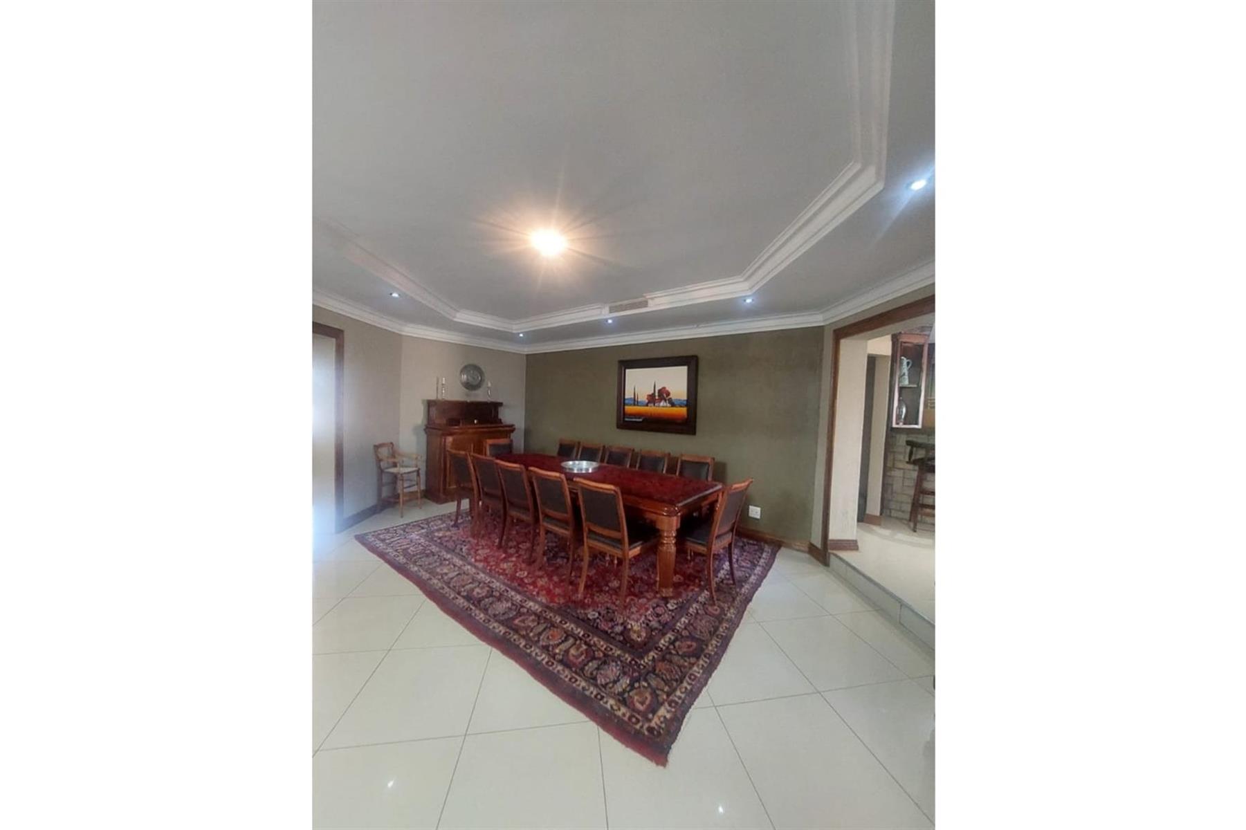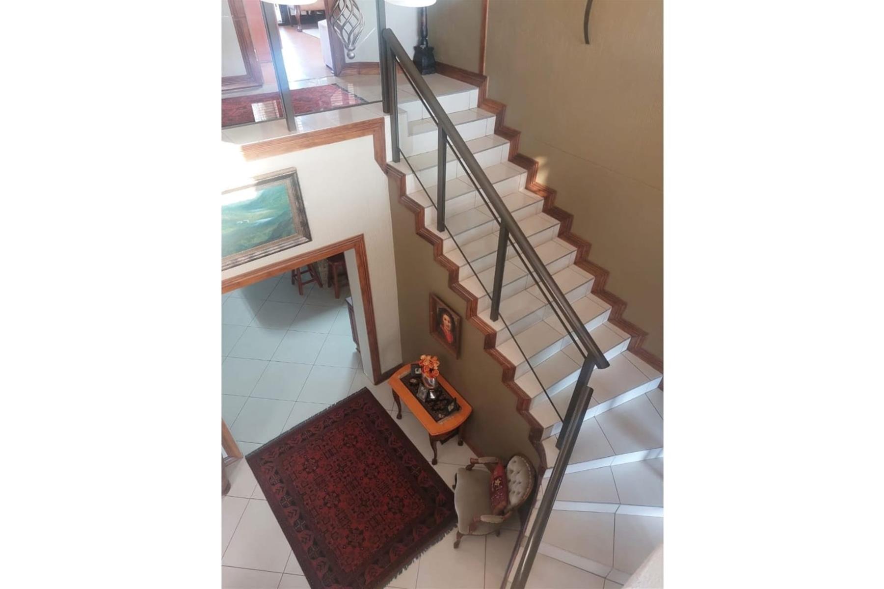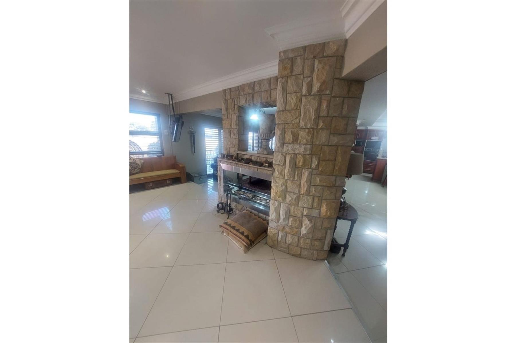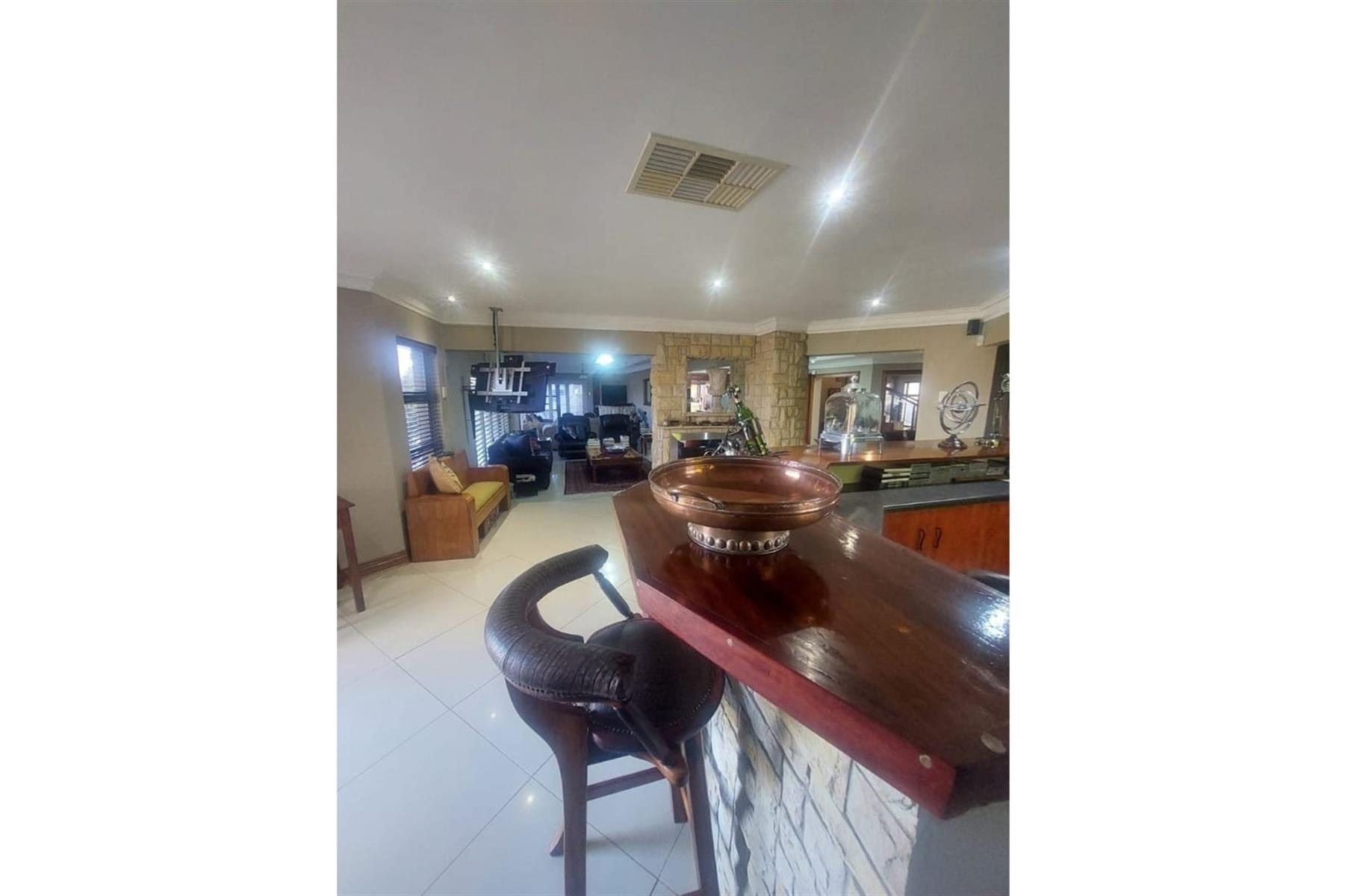 Upon entering the house, you are greeted by an impressive entrance hall. This space is enhanced by a built-in bar and chairs, creating a welcoming atmosphere for entertaining guests. The upper floor hosts a large entertainment area that includes a built-in braai. This area is designed for leisure and socializing, making it perfect for hosting events or spending quality time with friends and family.