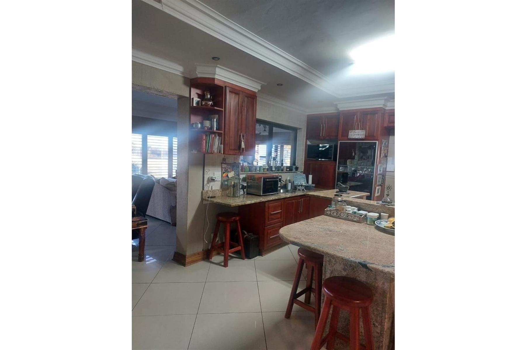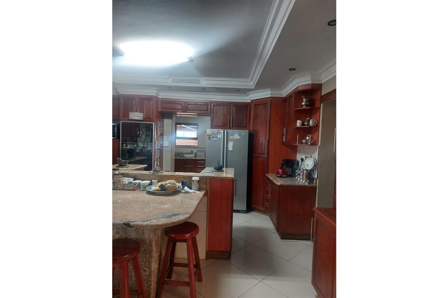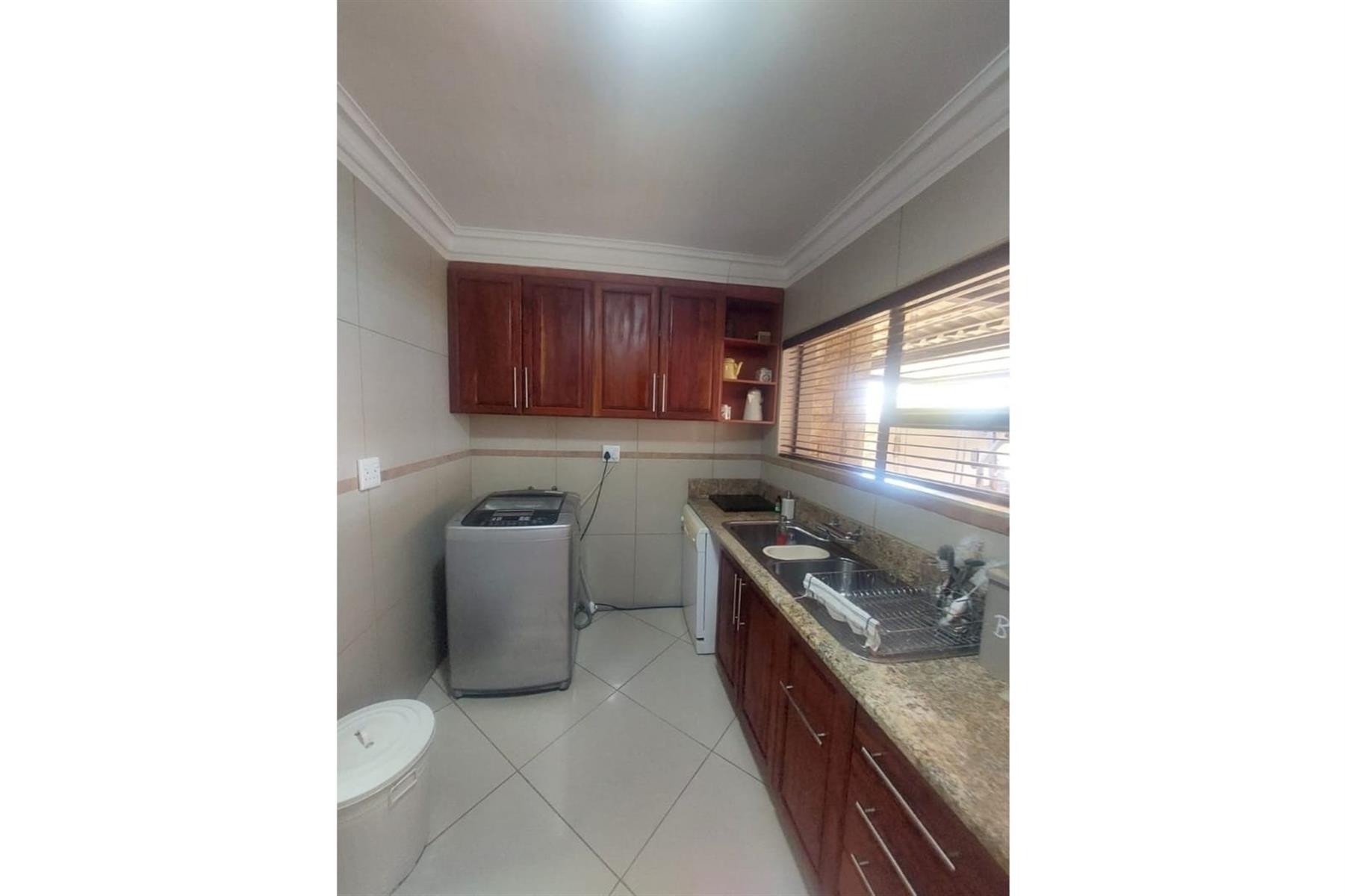 The open plan kitchen is a highlight of the house, designed with sophistication and practicality in mind. It boasts wooden cupboards that add a touch of warmth and elegance, complemented by granite countertops that offer durability and visual appeal. The kitchen is equipped with modern appliances, including a double oven and a gas hob. A scullery with built-in cupboards adds extra storage and utility space.