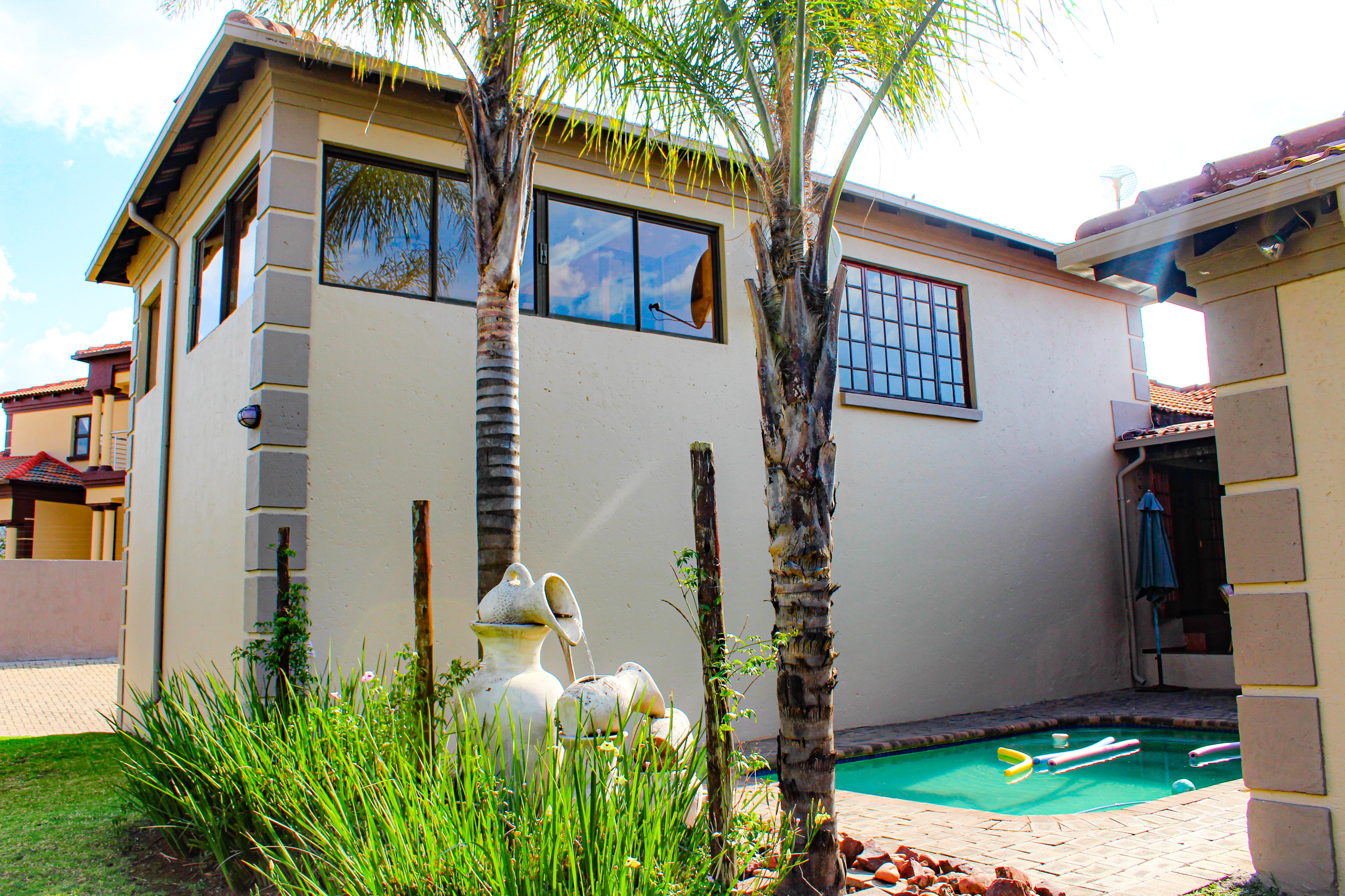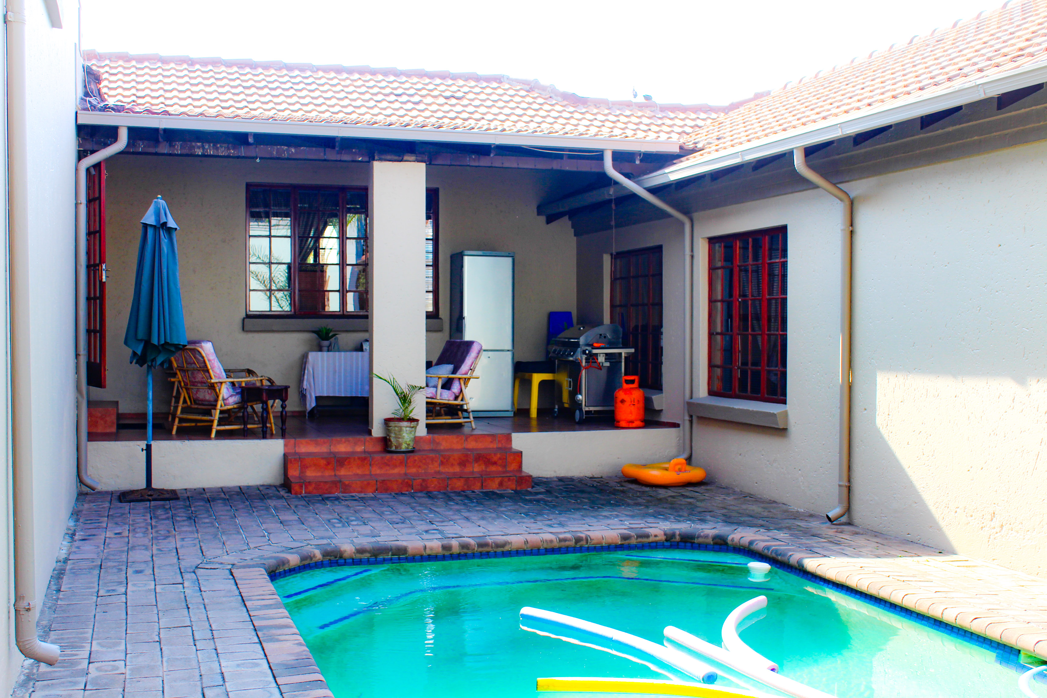 Welcome to this stunning residence nestled within a lovely estate. This exquisite home features two spacious living areas and an open-plan kitchen complete with a scullery. Upstairs, the living room opens into a delightful enclosed entertainment area, equipped with a built-in braai and abundant windows that invite natural light and refreshing late-afternoon breezes. The dining room seamlessly connects to a covered patio and a pool, providing a perfect oasis of privacy.