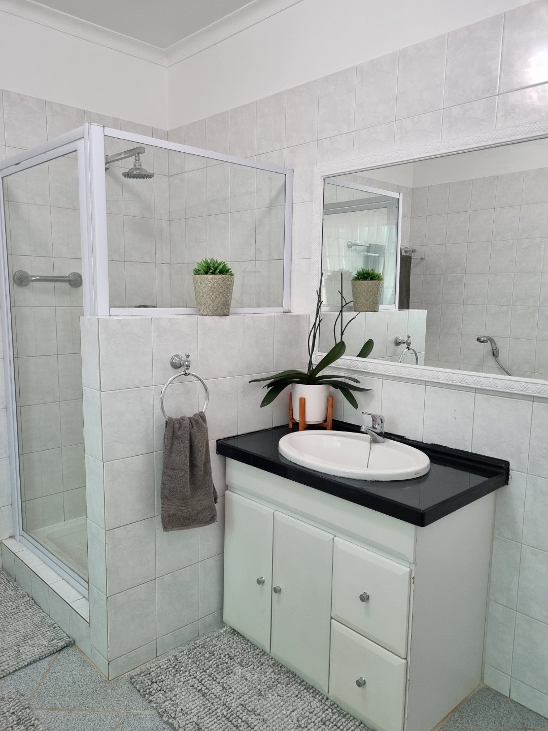 The spacious main bedroom offers ample cupboard space, air-conditioner, ceiling fan and en-suite full bathroom with shower, bath, basin & toilet.