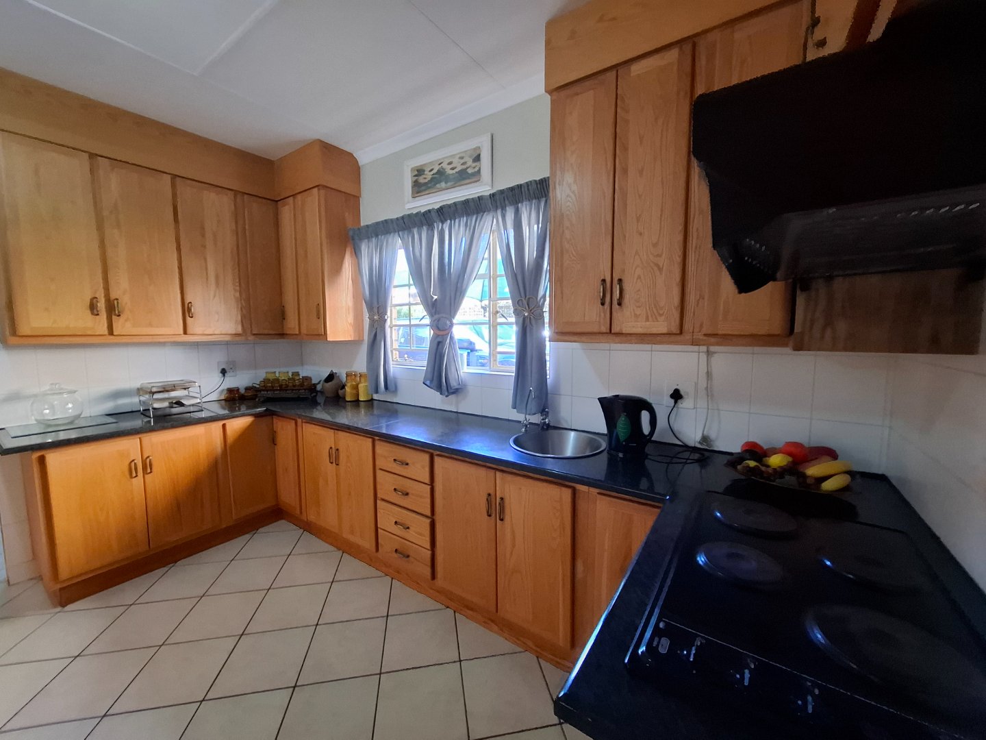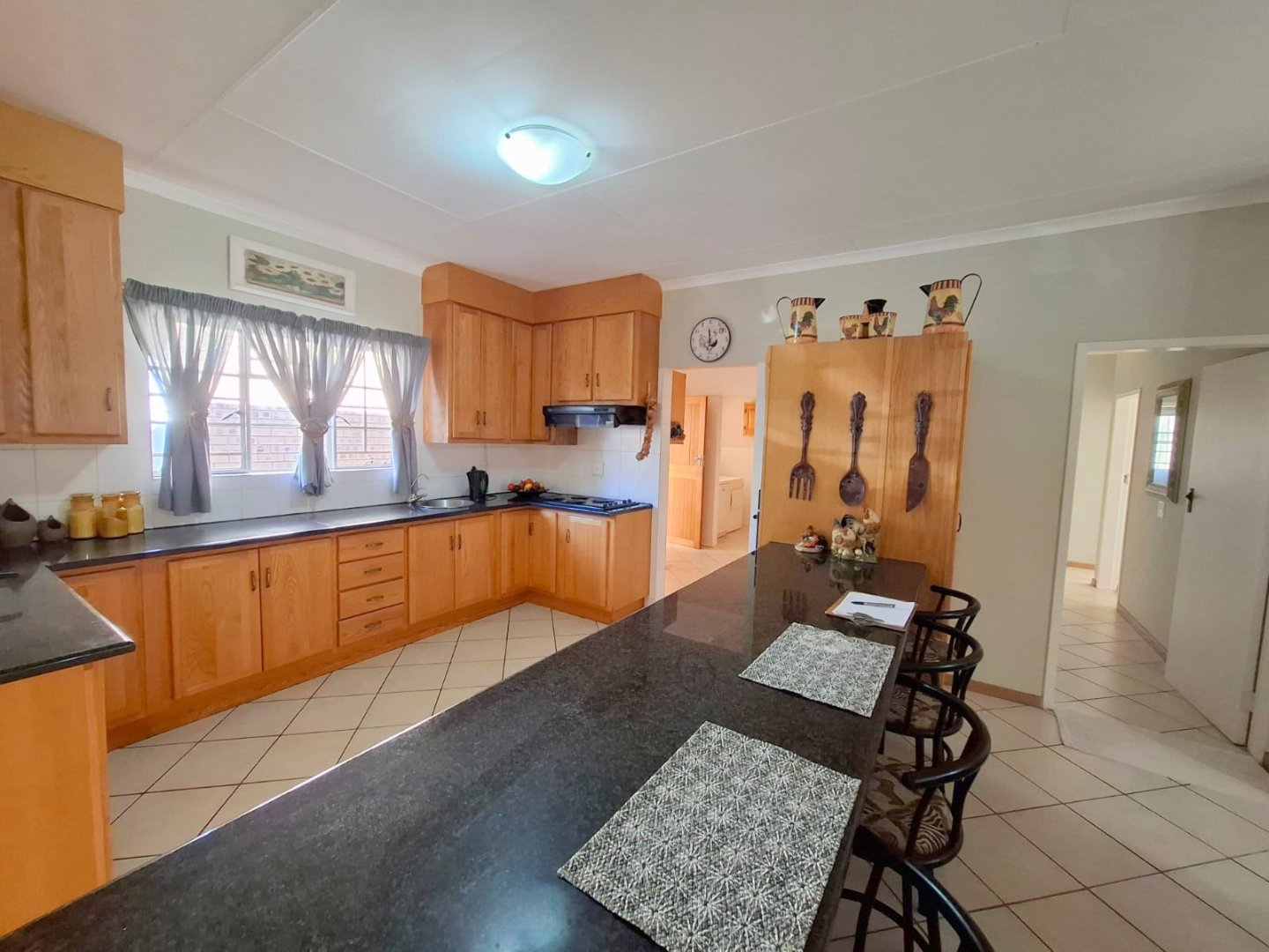 The open plan kitchen has ample cupboard space, granite tops, a breakfast nook, a hob, new generation electric oven, scullery, pantry and laundry.
