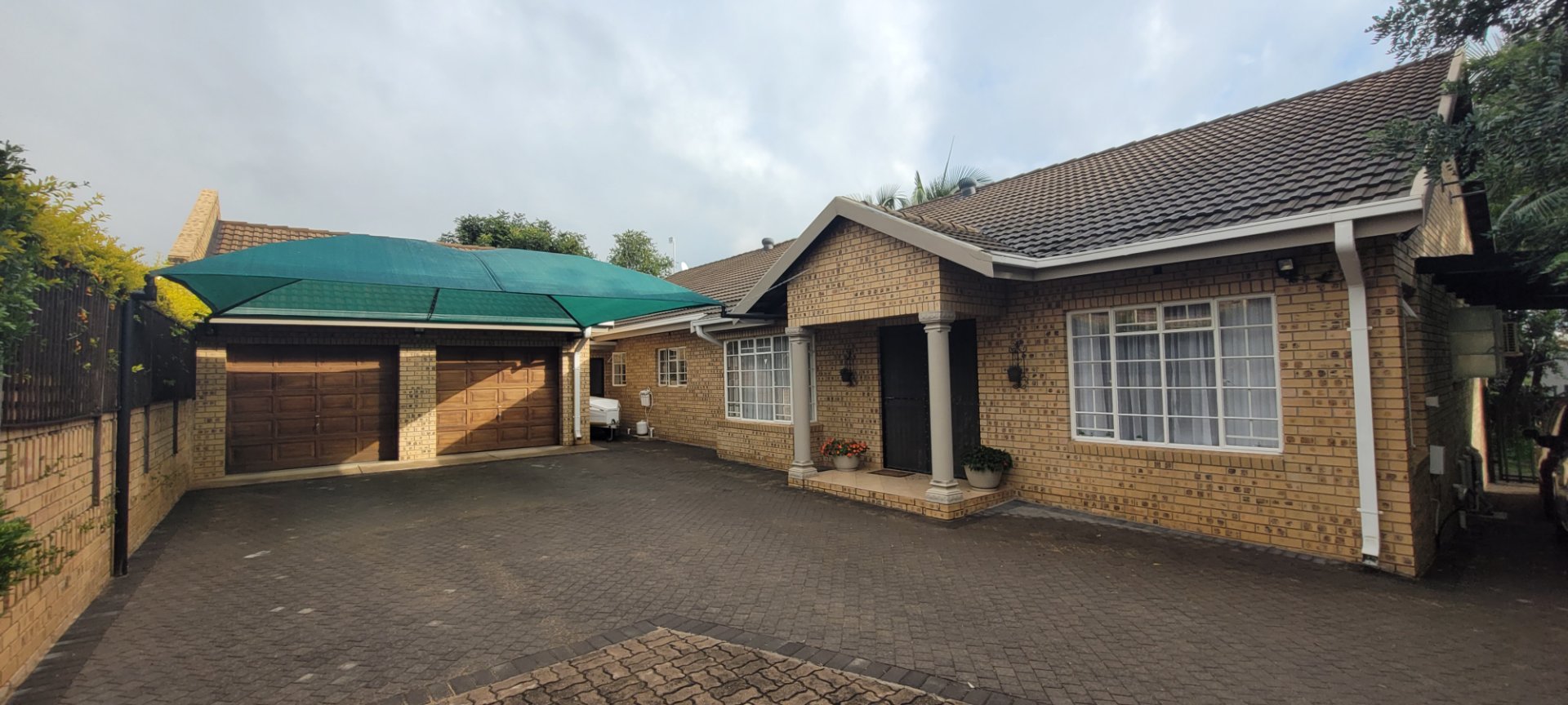 Double garage with 1 automated wooden door and one manual wooden door.