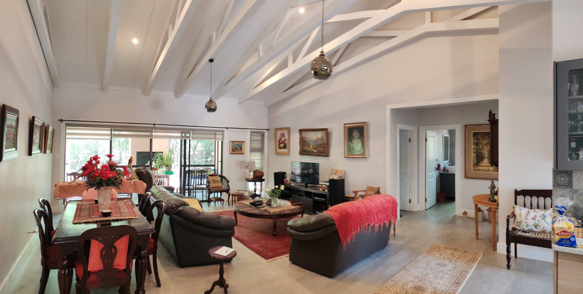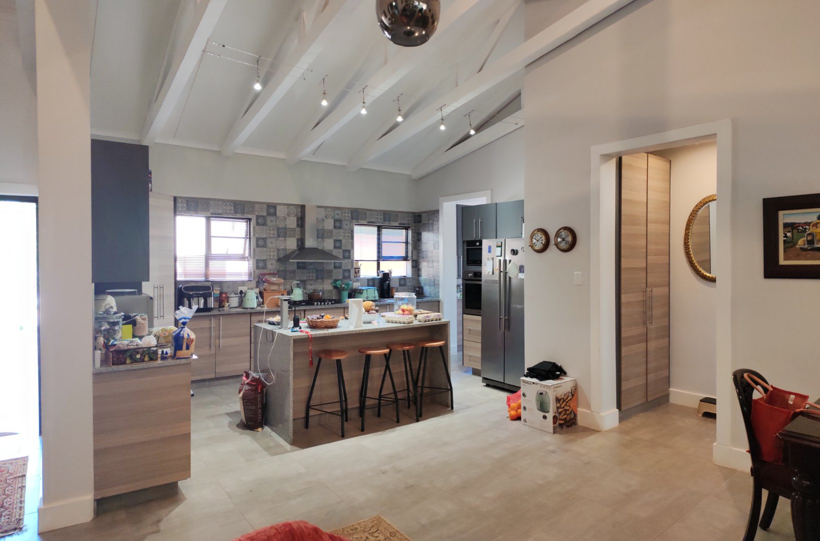 High-ceiling living area flowing onto a private covered patio with built-in braai – perfect for entertaining or relaxing in nature.