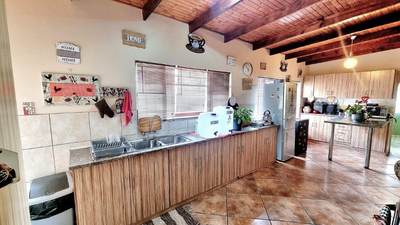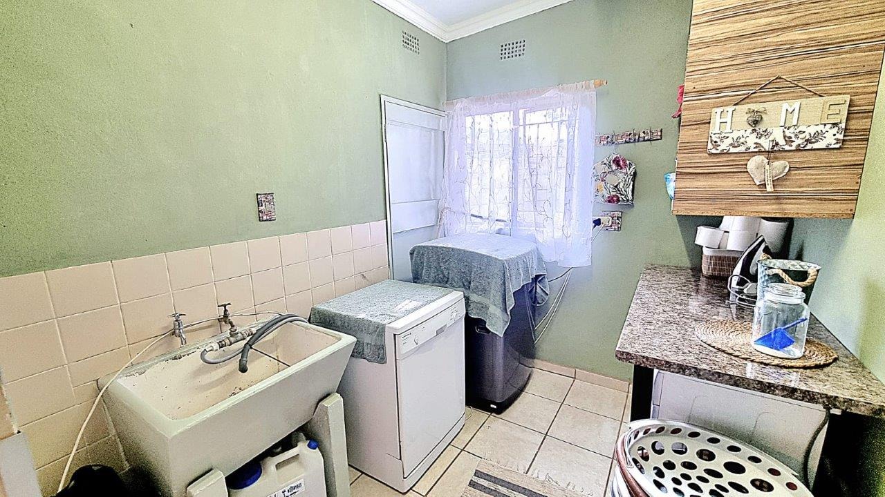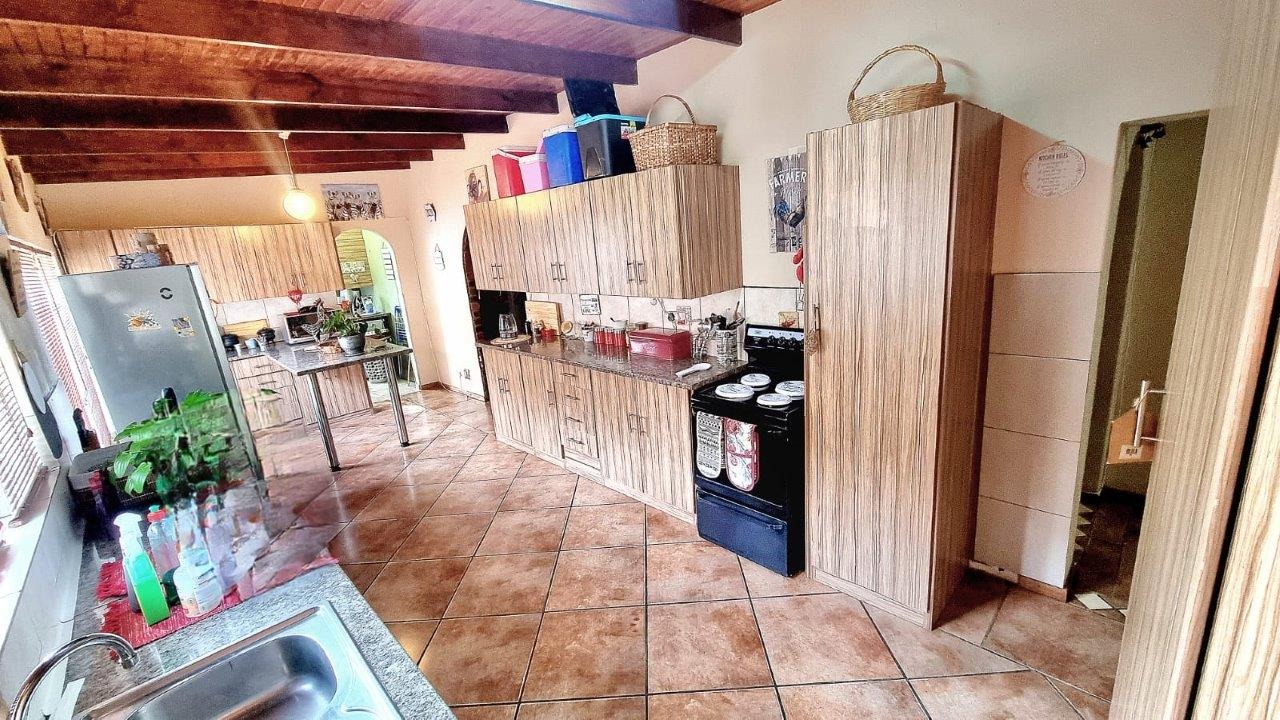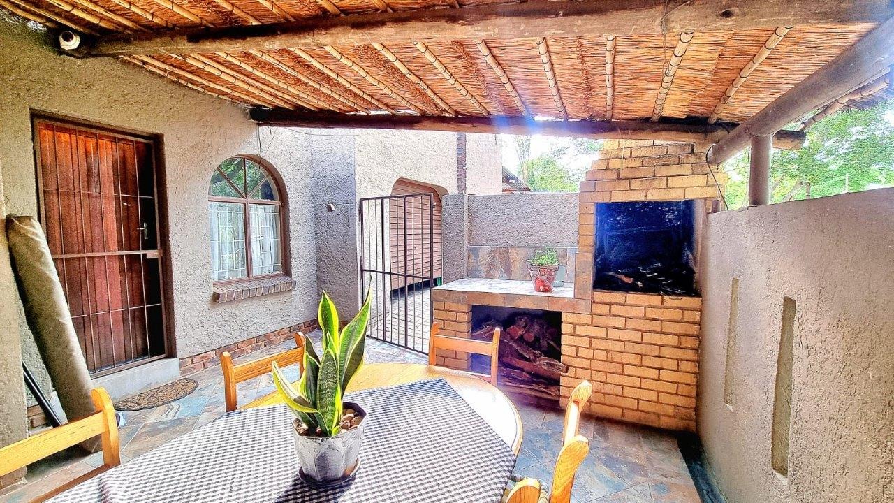 An inviting front stoep with a built-in braai welcomes you, offering a cozy space to entertain or unwind under the shade of mature trees. Inside, the air-conditioned open-plan living and dining area with rustic open brick feature wall which seamlessly connects to a spacious kitchen A separate laundry room ensures convenience and keeps the living spaces organized.