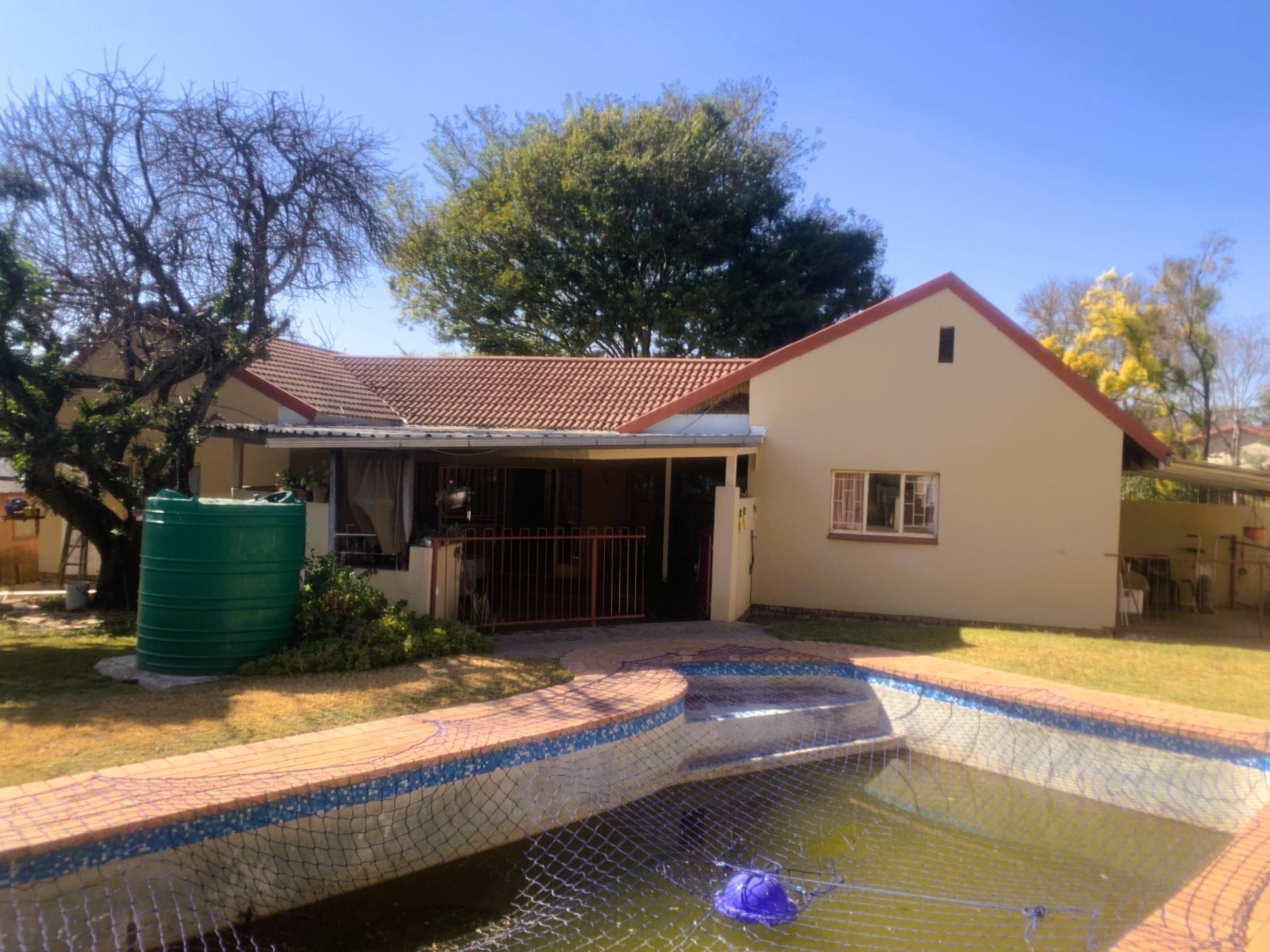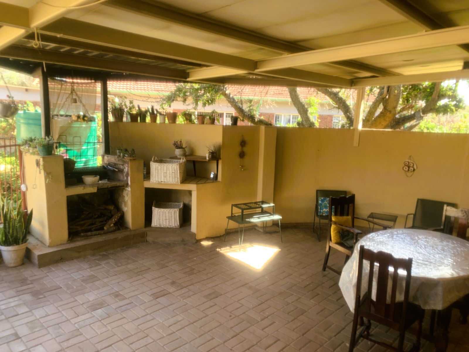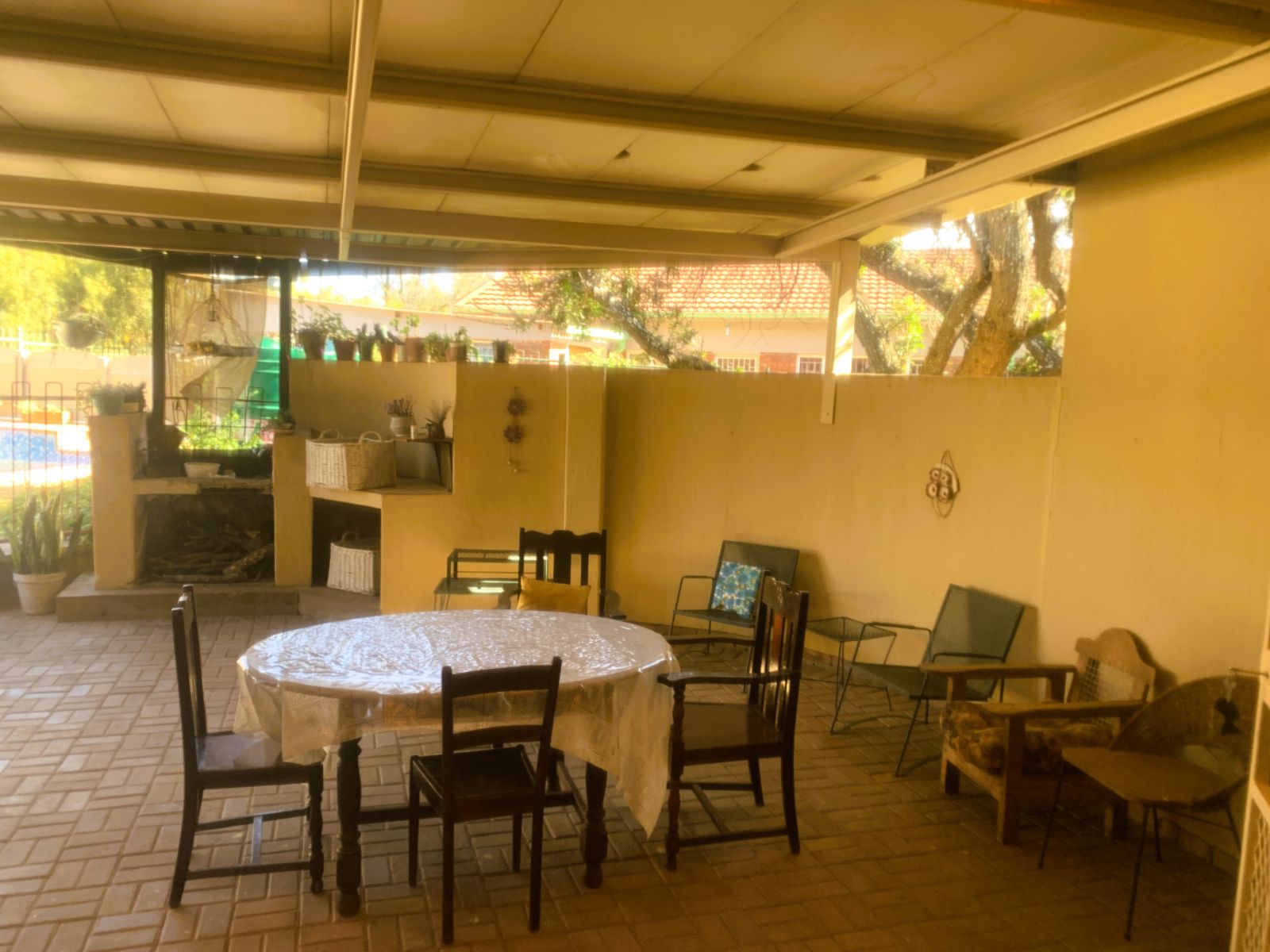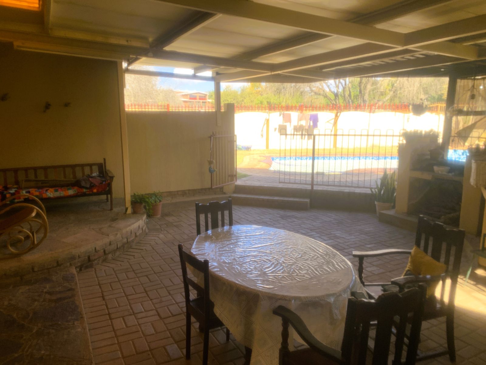 The TV lounge leads out to a lovely covered patio, seamlessly connected to the built-in braai area—perfect for entertaining. The swimming pool, though needing minor repairs, promises hours of family fun during our famously hot Bushveld summers.