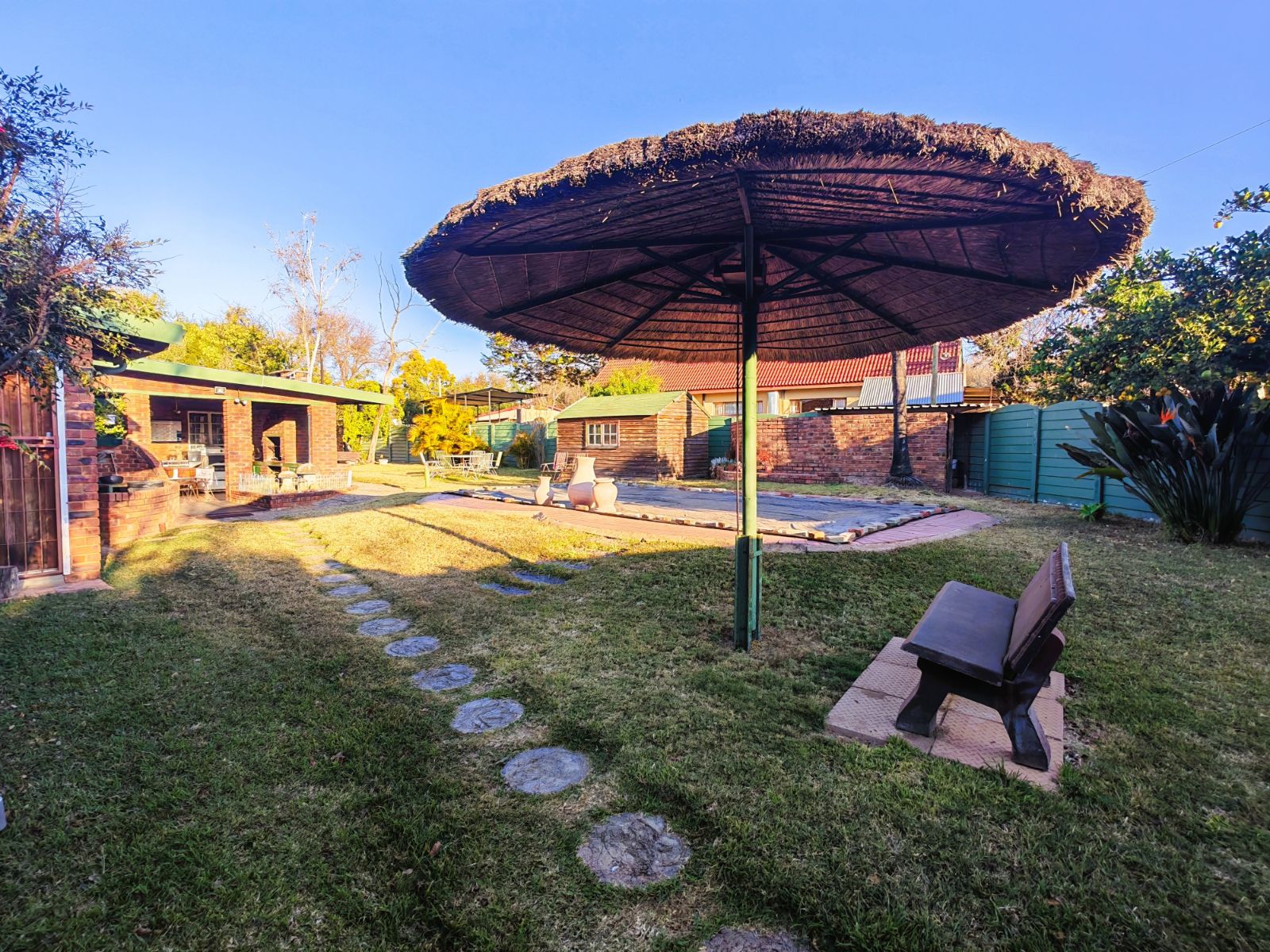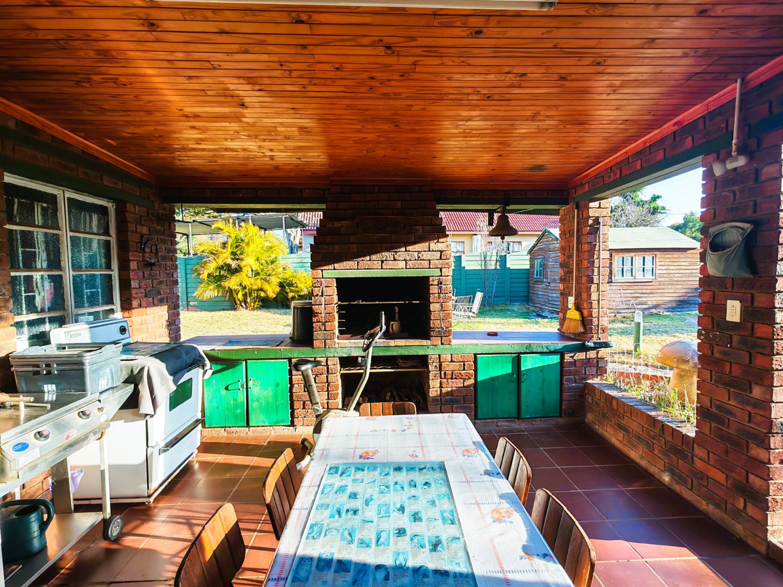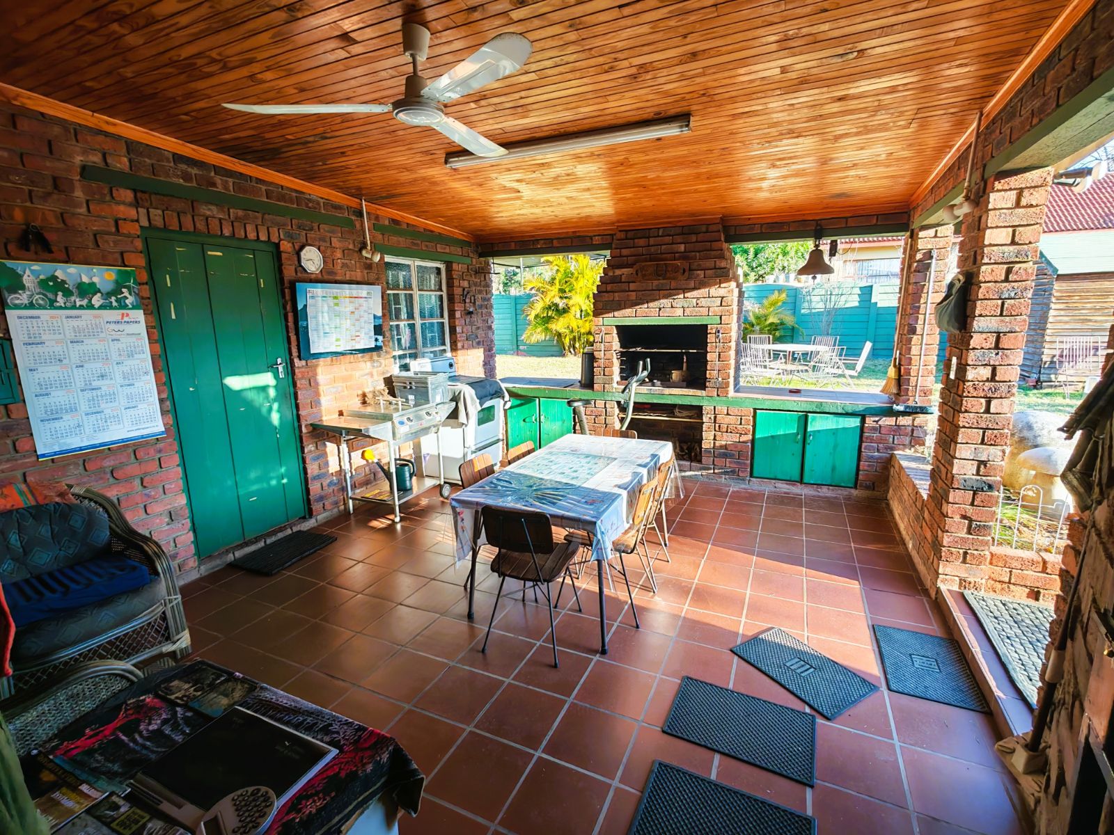 Living areas include a formal lounge off the entrance hall, a cozy study, and a massive open-plan TV lounge and dining room ideal for family life and entertaining. The large kitchen is equipped with ample cupboard space reaching up to the ceiling, a separate scullery, and a laundry area. From the kitchen, you step out onto a covered patio with a built-in braai – perfect for weekend braais and relaxed bushveld living.