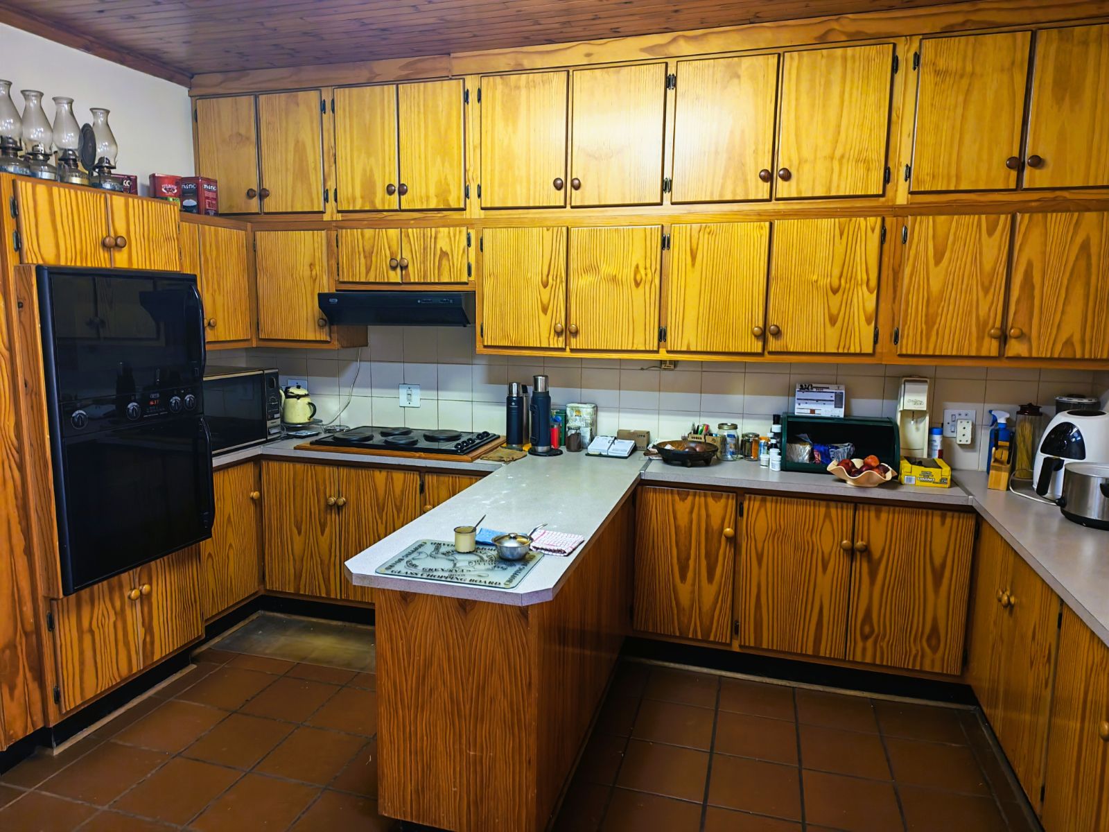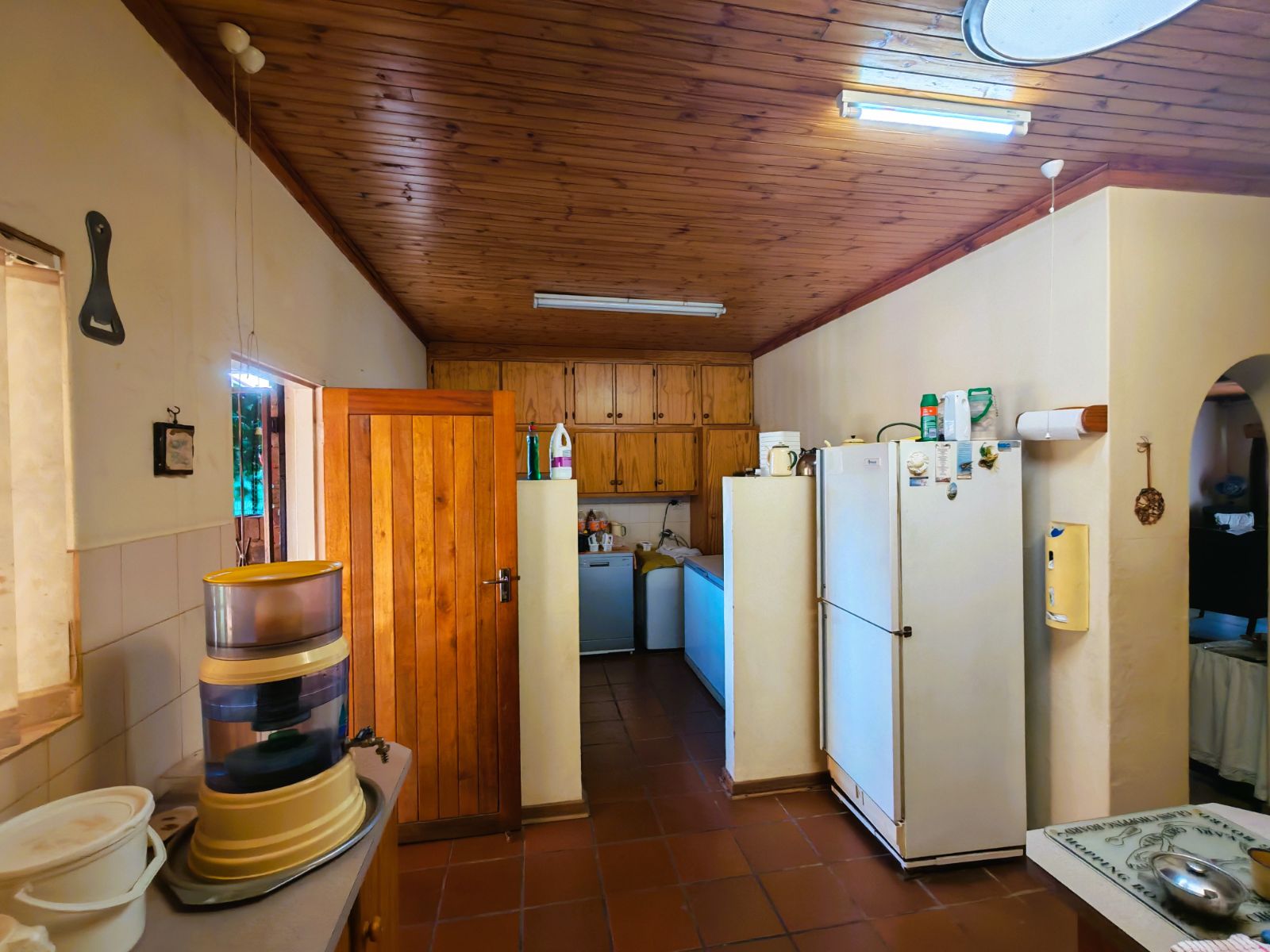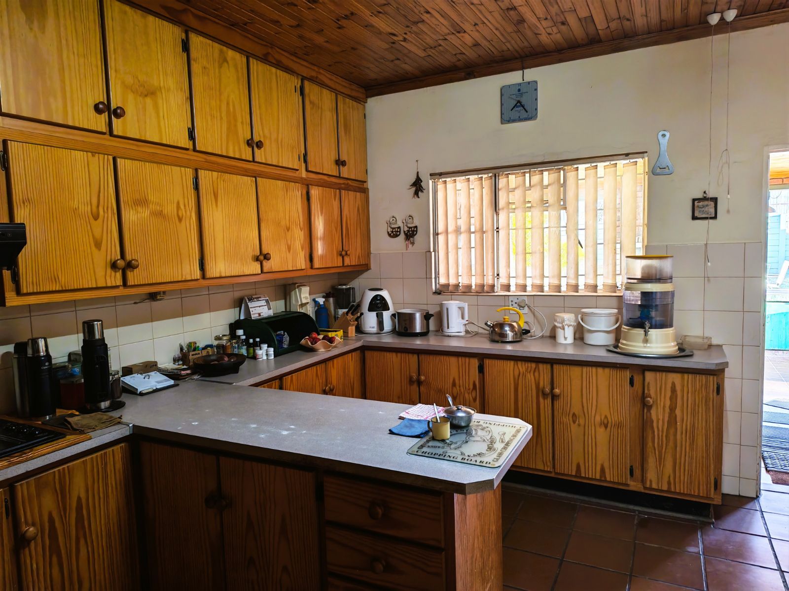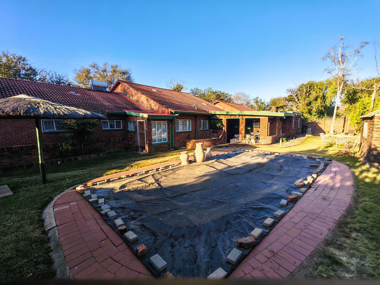 Living areas include a formal lounge off the entrance hall, a cozy study, and a massive open-plan TV lounge and dining room ideal for family life and entertaining. The large kitchen is equipped with ample cupboard space reaching up to the ceiling, a separate scullery, and a laundry area. From the kitchen, you step out onto a covered patio with a built-in braai – perfect for weekend braais and relaxed bushveld living.