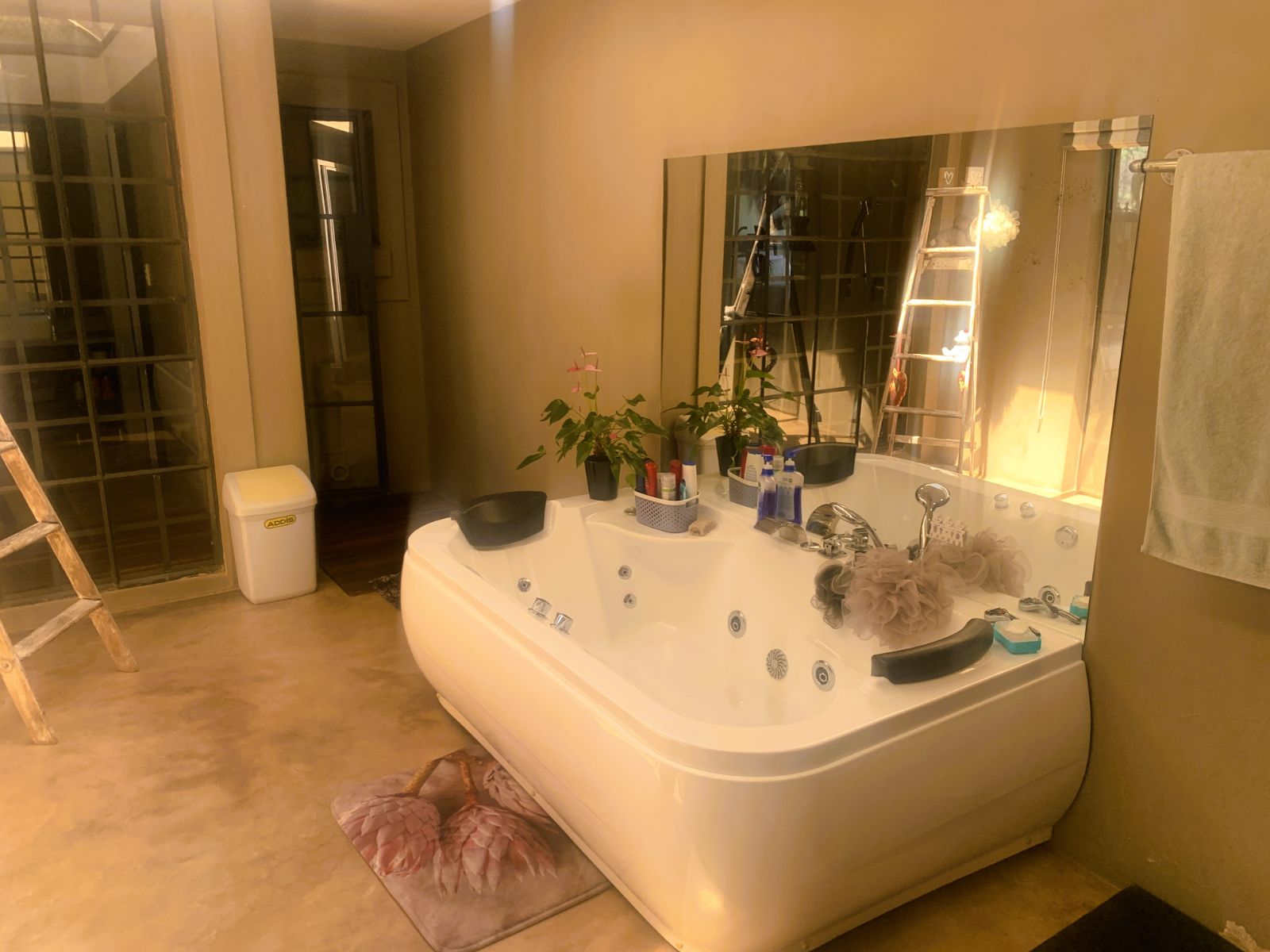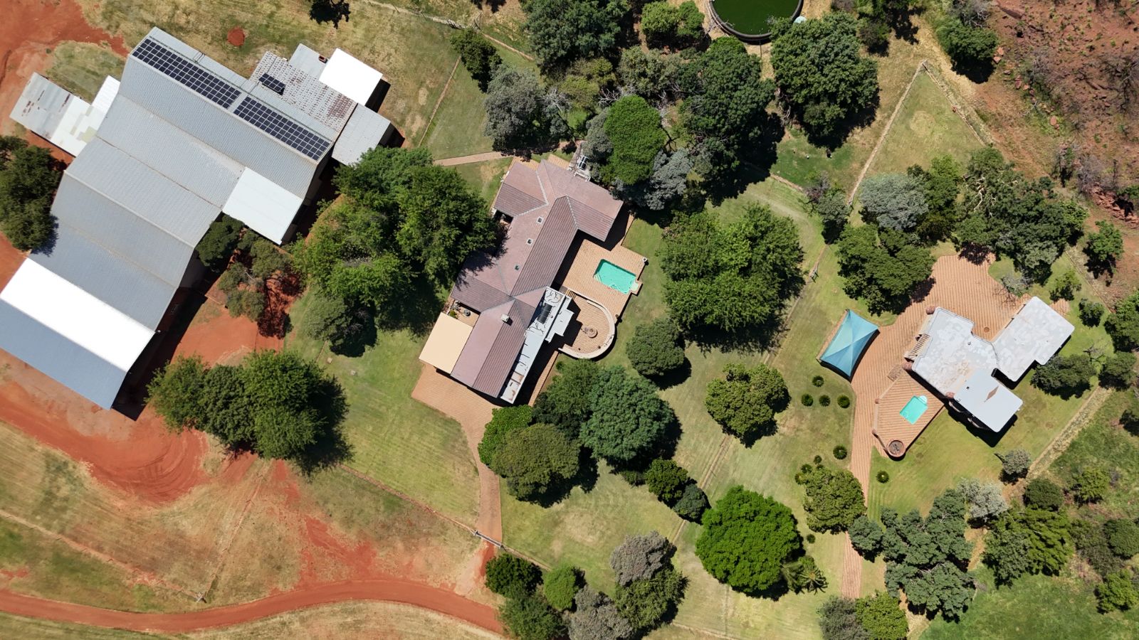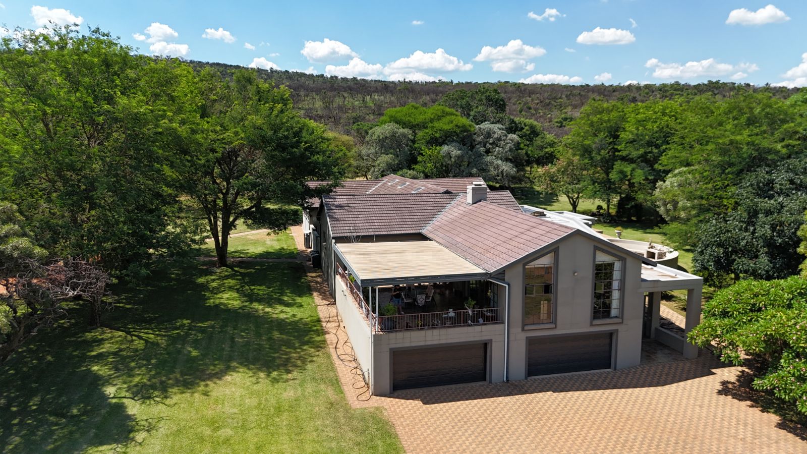 The main house is designed with luxury and functionality in mind. It boasts five spacious bedrooms, each with its own en-suite, air conditioning, and direct outdoor access. Originally built as a lodge, the home offers extensive areas for entertaining, including a built-in bar, large built-in braai, and a generous living area that flows into the open-plan kitchen. The kitchen features a SMEG stove, plenty of cupboard space, a pantry, and a separate scullery. The dining area and lounge both open up to a wide patio with panoramic views of the pecan orchard. You’ll have the option to relax in either a warm-water pool inside or a cold-water pool outside. The home also includes a wine cellar and two double garages, all set beneath the house, with a striking foyer that features a beautiful water feature.