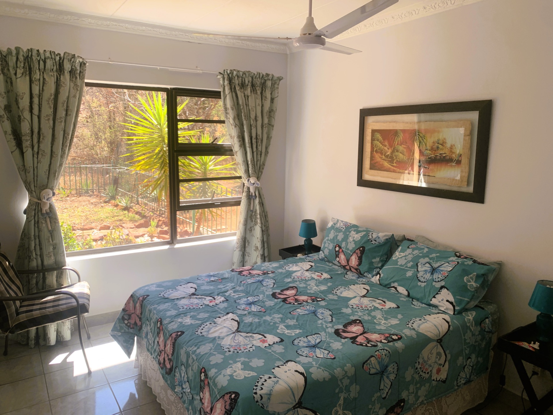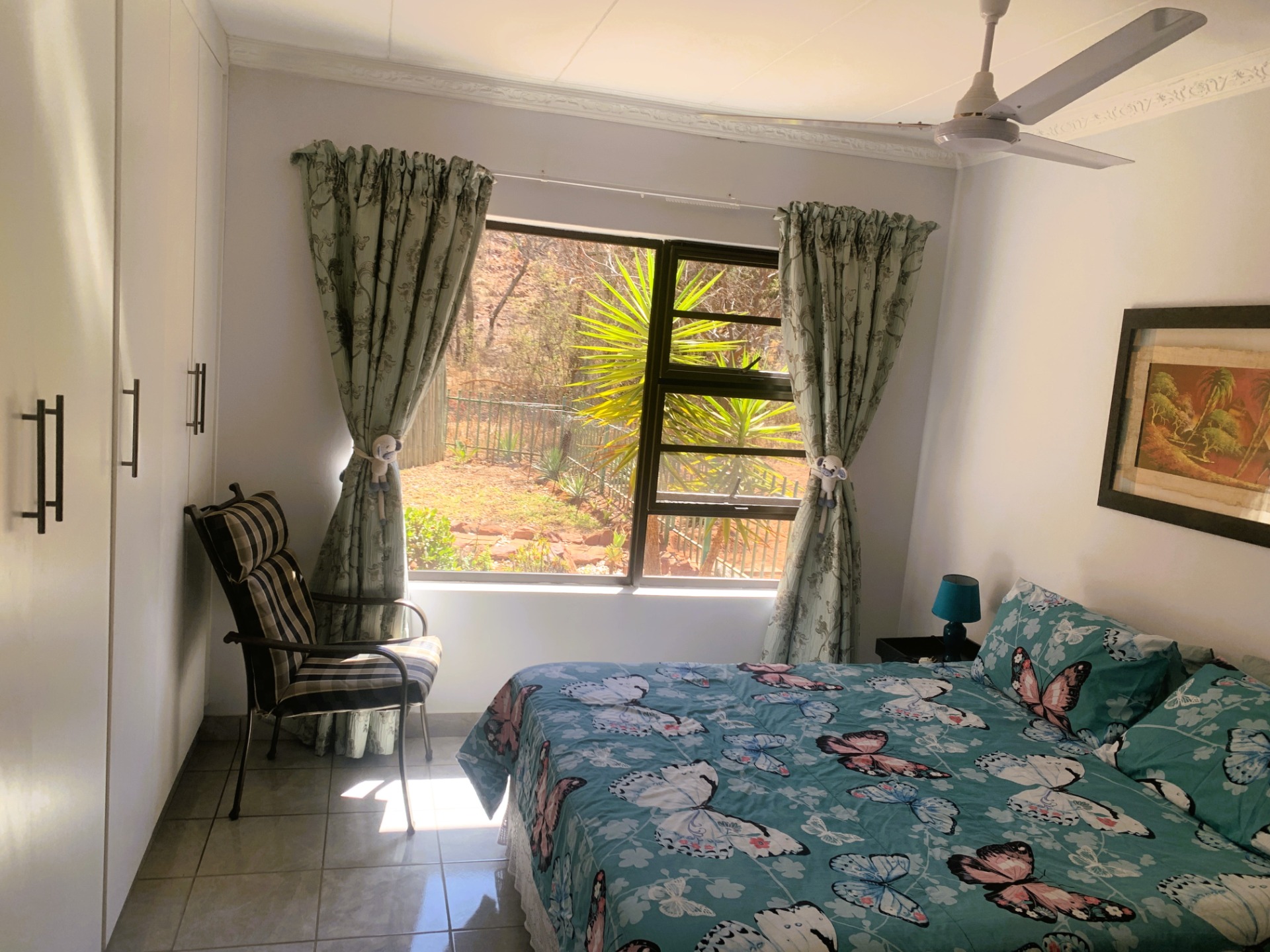 The living area flows effortlessly onto a separate stoep, where you can take in panoramic views of the lush Bushveld and mountains. The main bedroom opens onto a second stoep and includes a luxurious full en-suite bathroom and ample cupboard space. The second bedroom, also spacious, comes with its own en-suite bathroom.