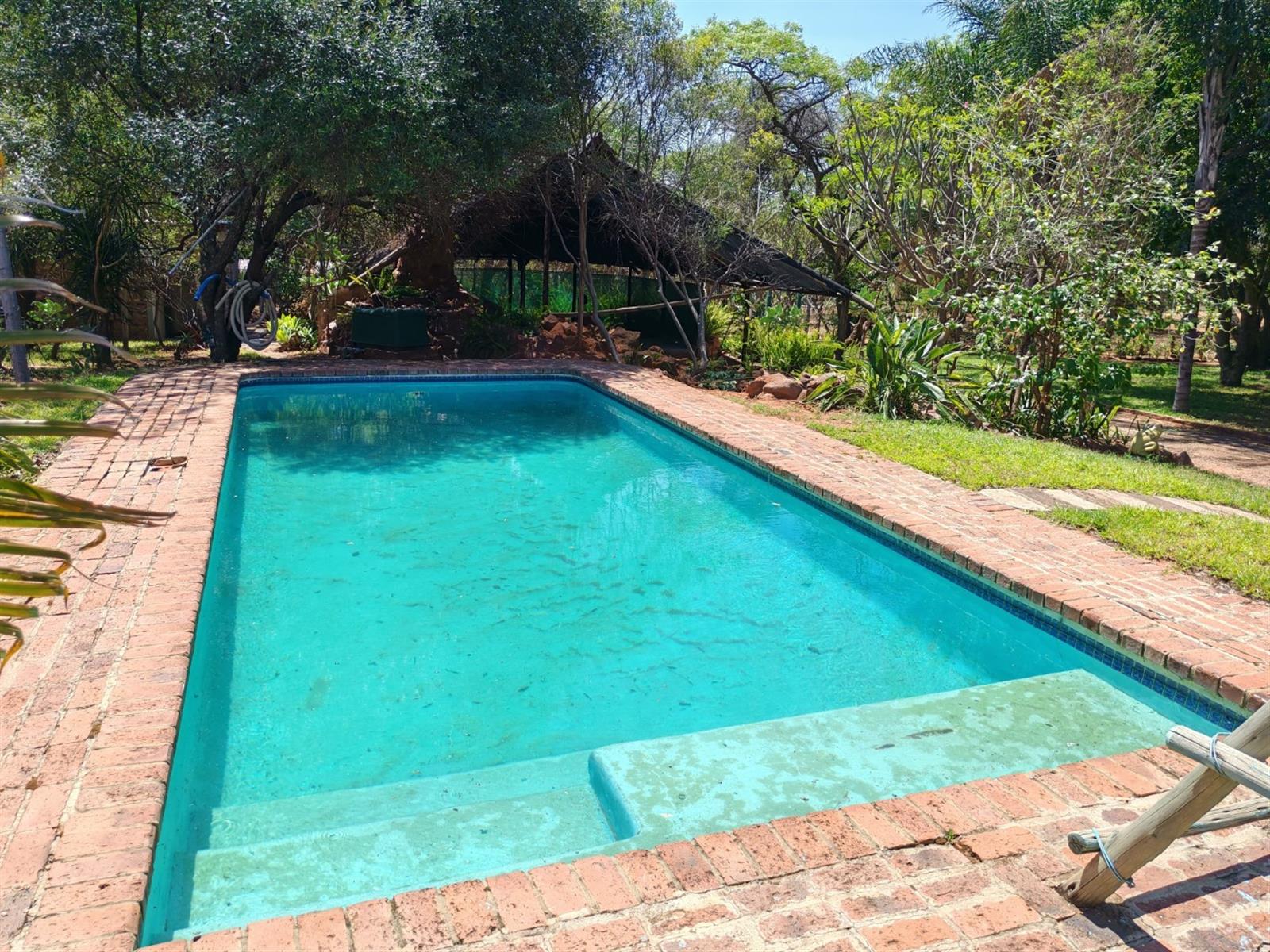 The outdoor entertainment area includes a swimming pool and a lapa with separate male and female toilets, set within a well-maintained garden.