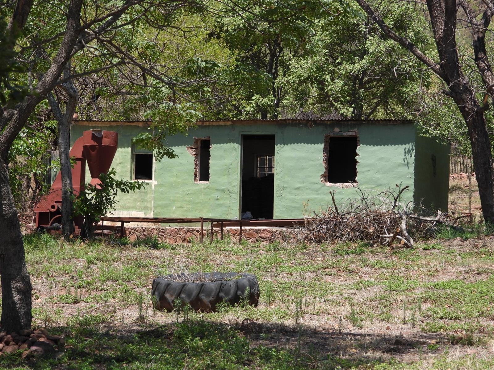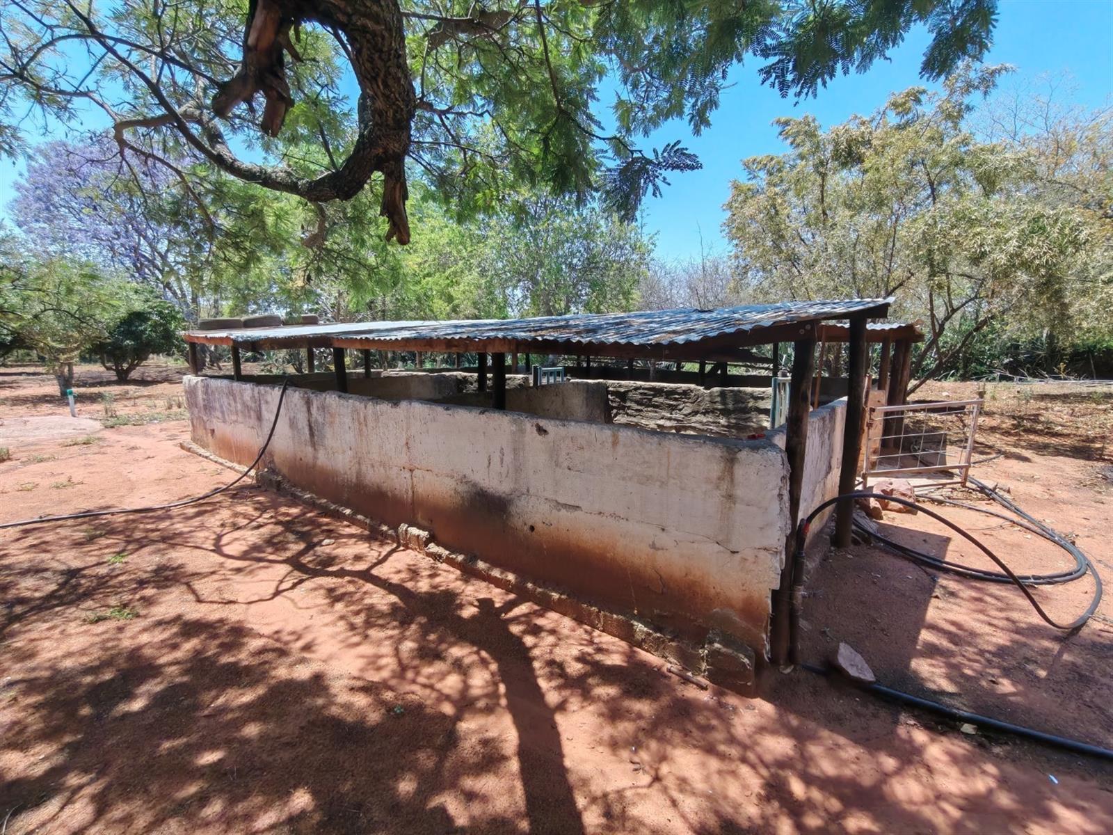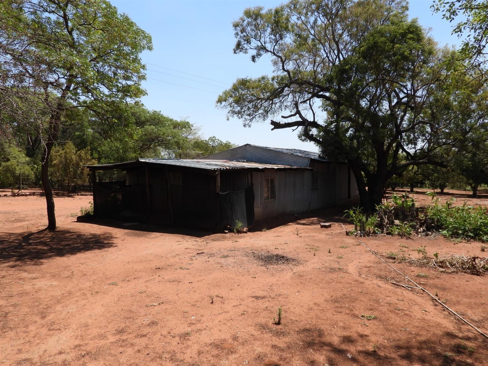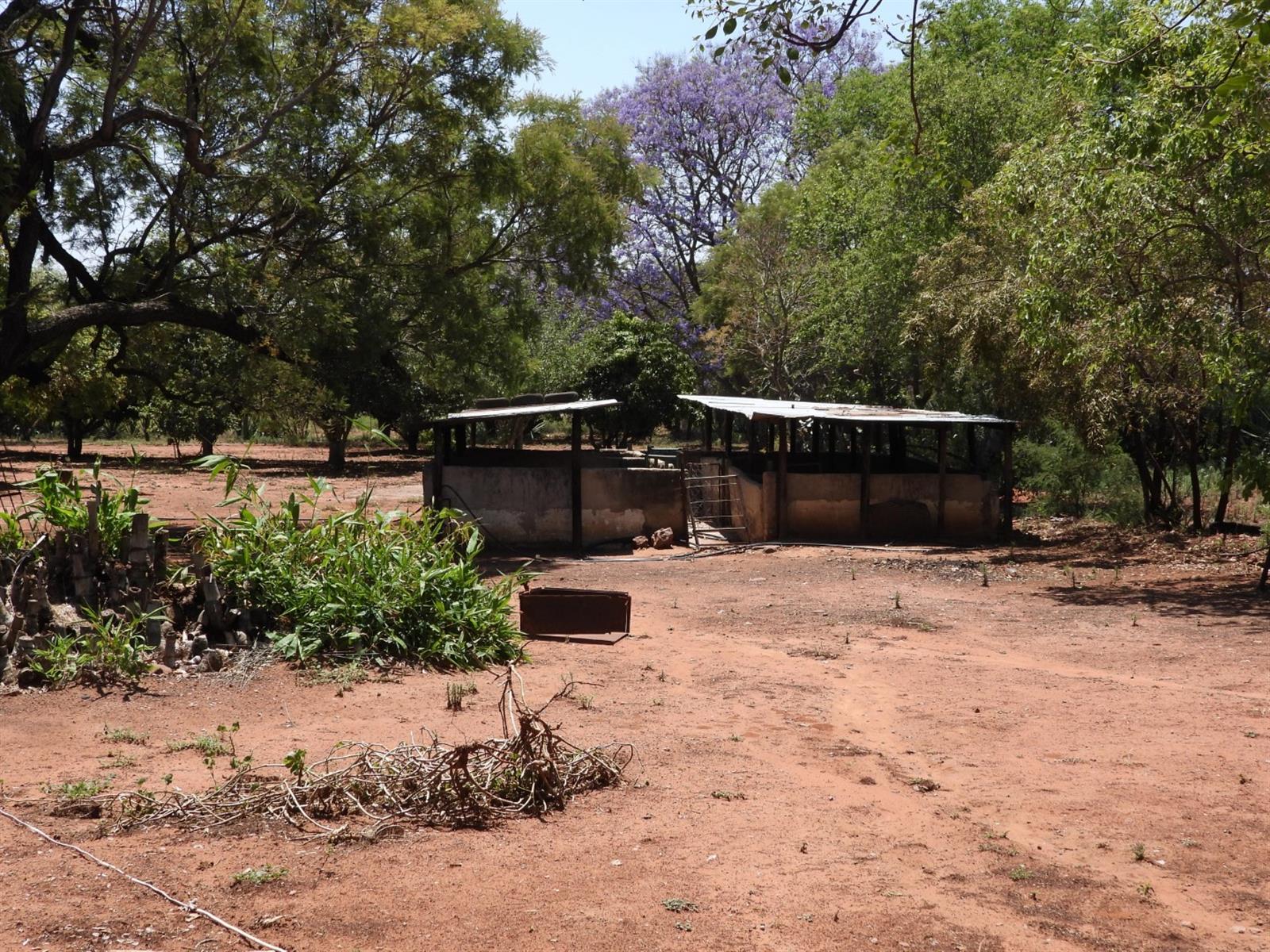 Functional infrastructure includes a large shed, a smaller store room, four garages, pig sties, and two domestic rooms. Water supply is abundant with three boreholes, two dams, and three cultivated lands. The property is divided into various camps and is fully game-fenced with an electric gate at the yard. Game on the property includes approximately 3 nyala, 7 kudu, and 10 impala (numbers to be confirmed upon viewing).