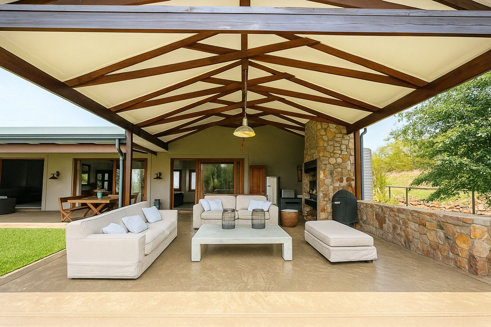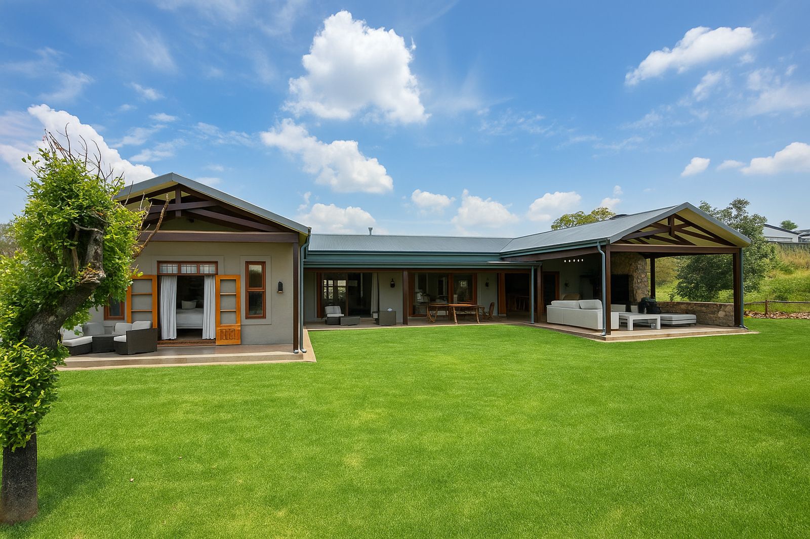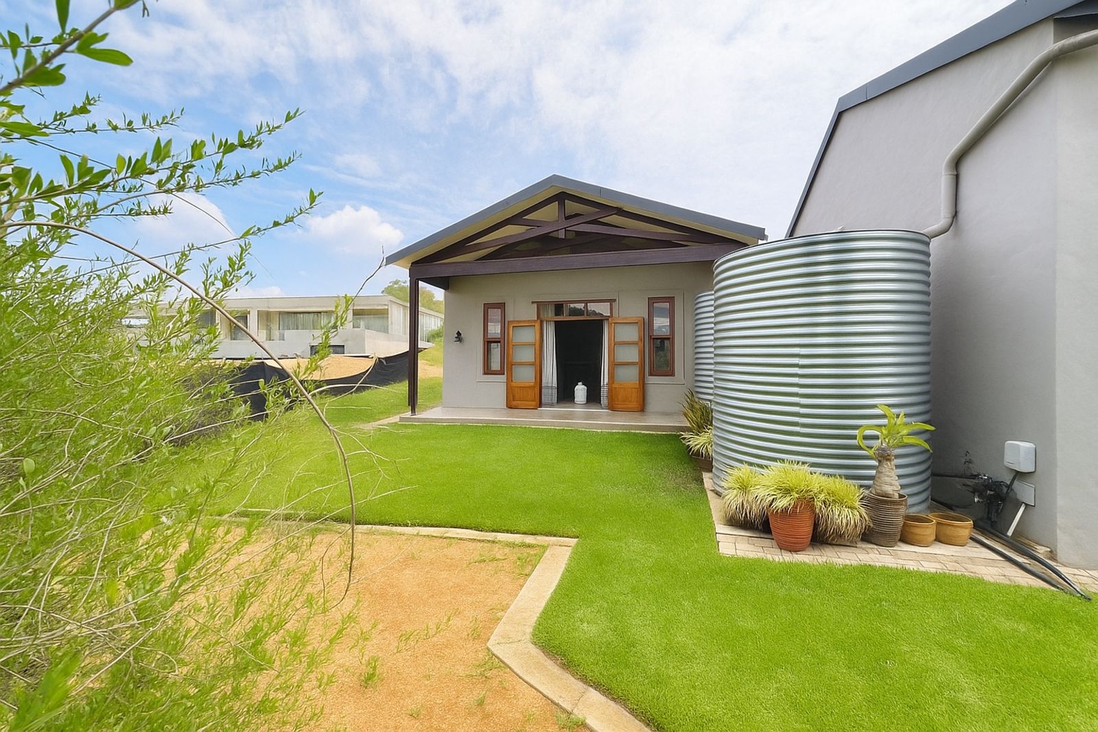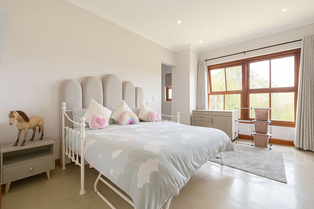 Sustainability is at the heart of this home, with a 5kVA Victron inverter, 12 solar panels, a 10kWh backup battery, and three gas geysers ensuring energy efficiency. There is 30,000 litres of rainwater storage and automated irrigation for the lawns and garden. BreezeAir cooling and a Becker anthracite fireplace provide year-round comfort.