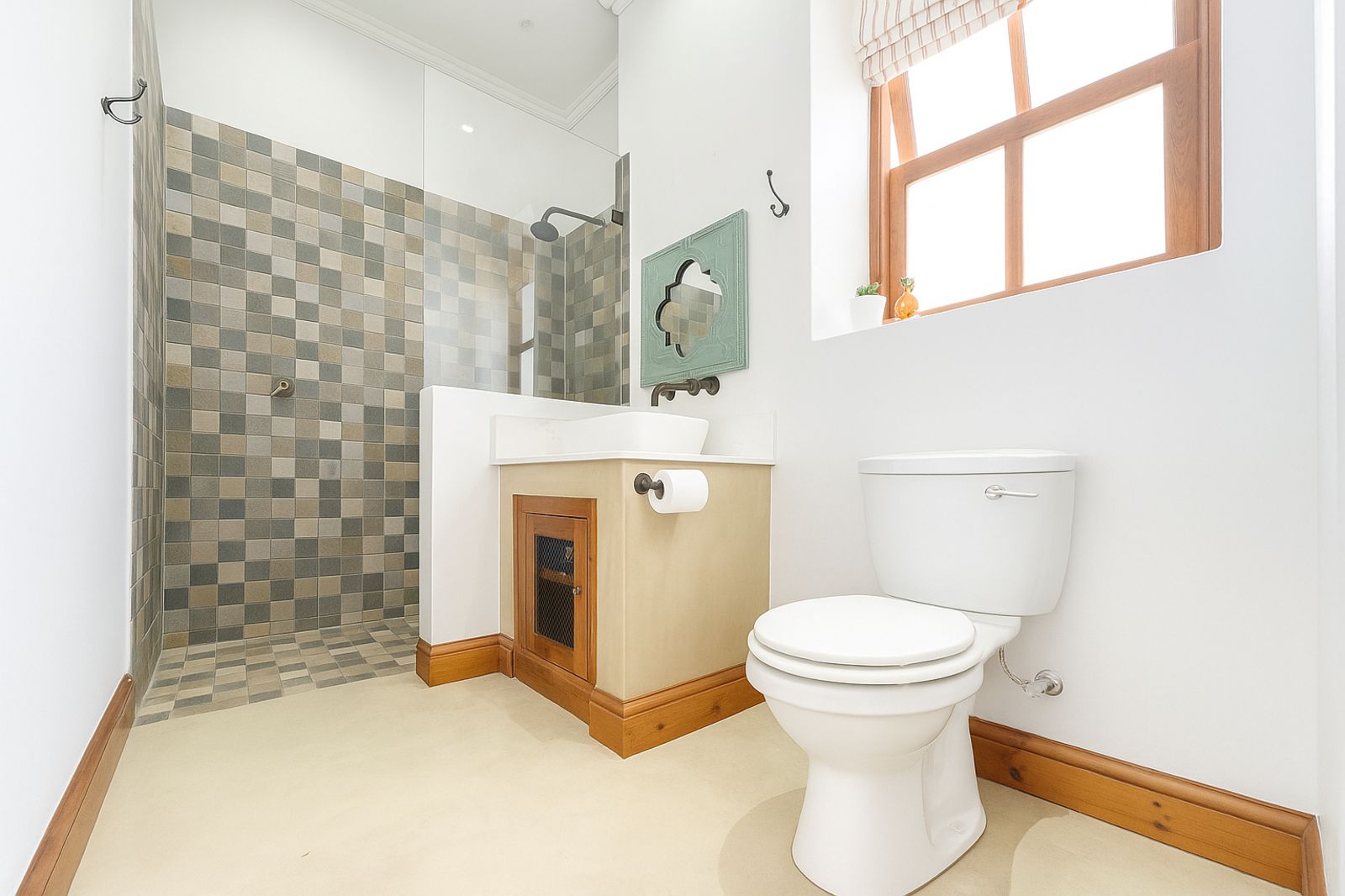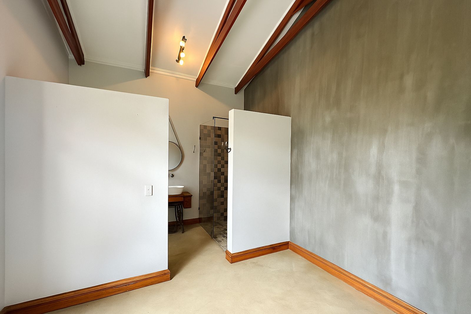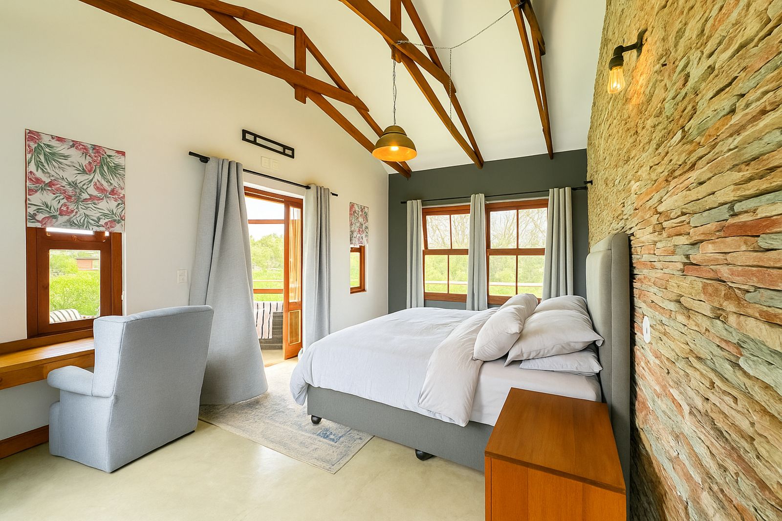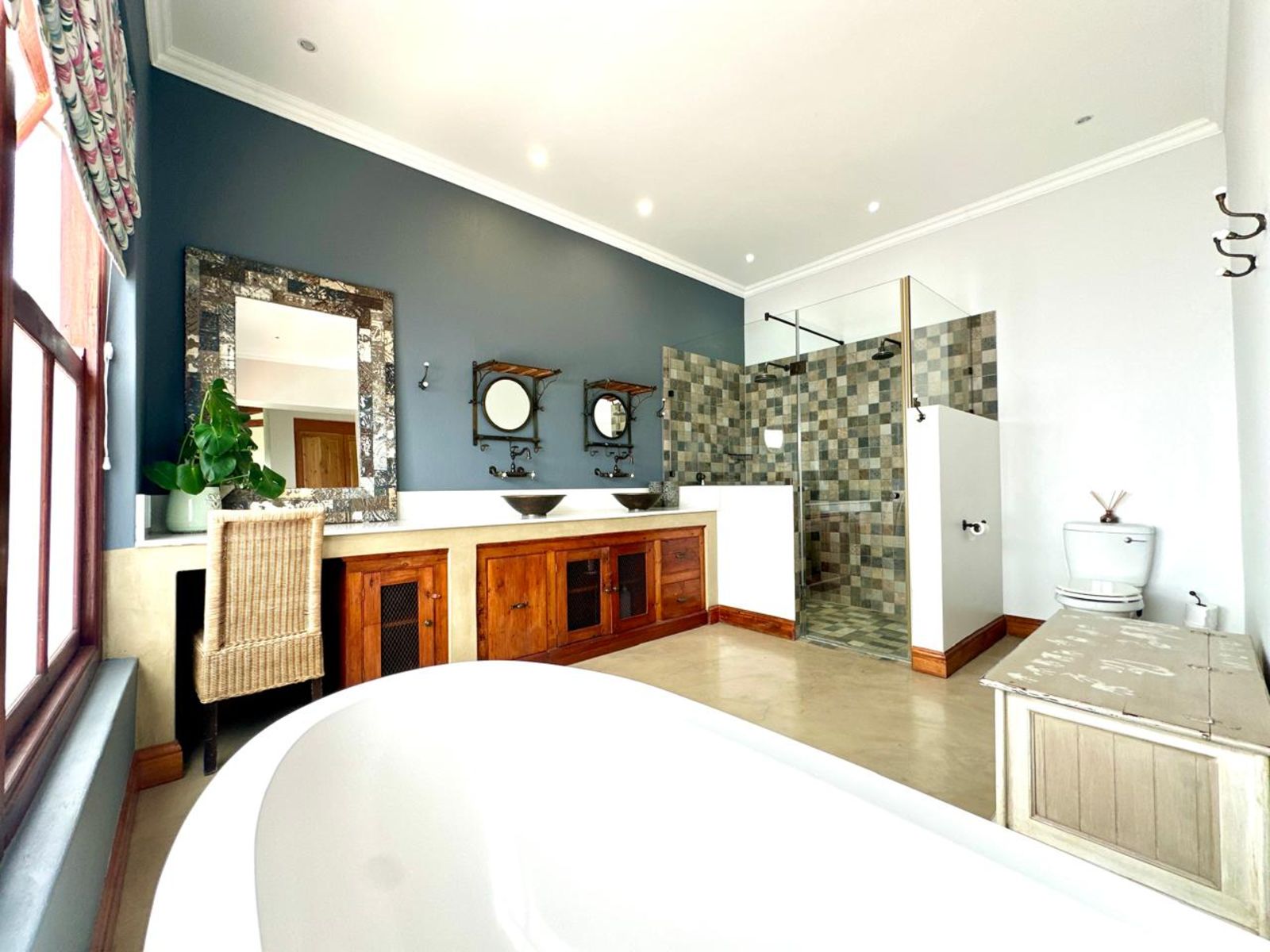 Sustainability is at the heart of this home, with a 5kVA Victron inverter, 12 solar panels, a 10kWh backup battery, and three gas geysers ensuring energy efficiency. There is 30,000 litres of rainwater storage and automated irrigation for the lawns and garden. BreezeAir cooling and a Becker anthracite fireplace provide year-round comfort.