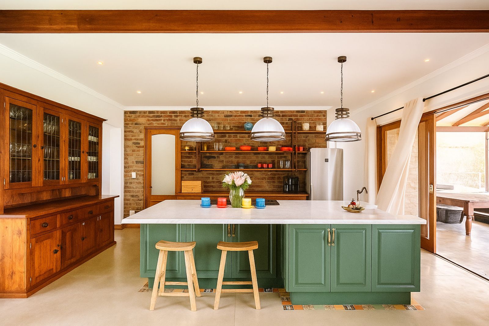 The main residence features three spacious en-suite bedrooms, a guest powder room, and a versatile additional room that can be used as a playroom, study, or home office. The open-plan living areas are warm and inviting, complemented by a fully renovated kitchen equipped with a Smeg Victoria gas hob, electric oven, pantry, scullery, and linen room.