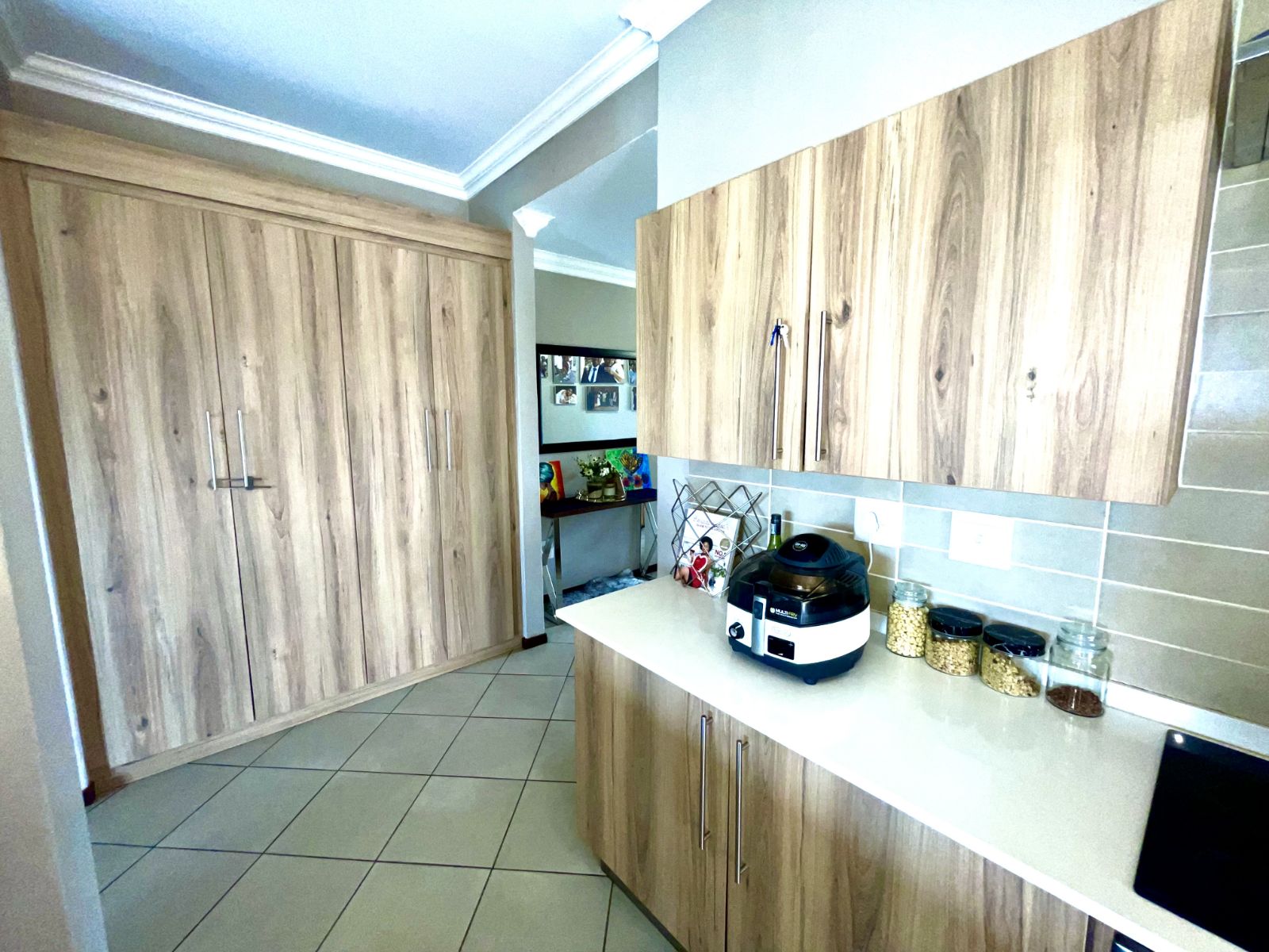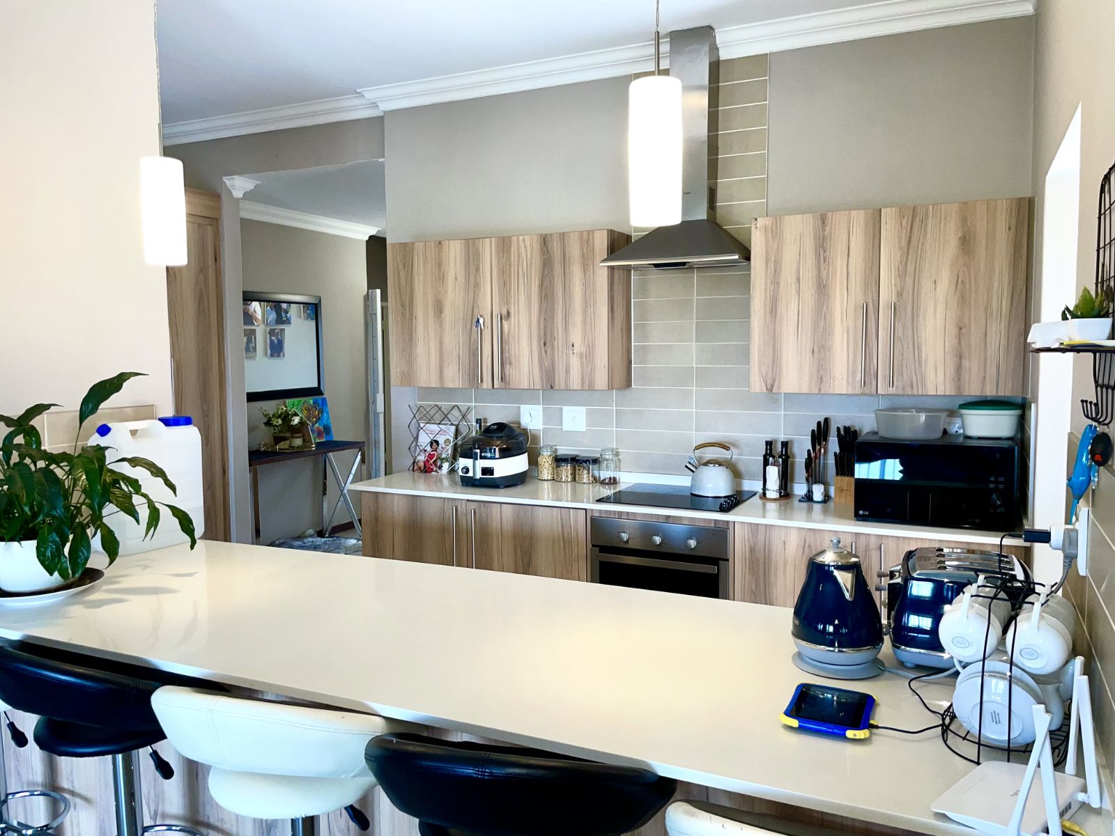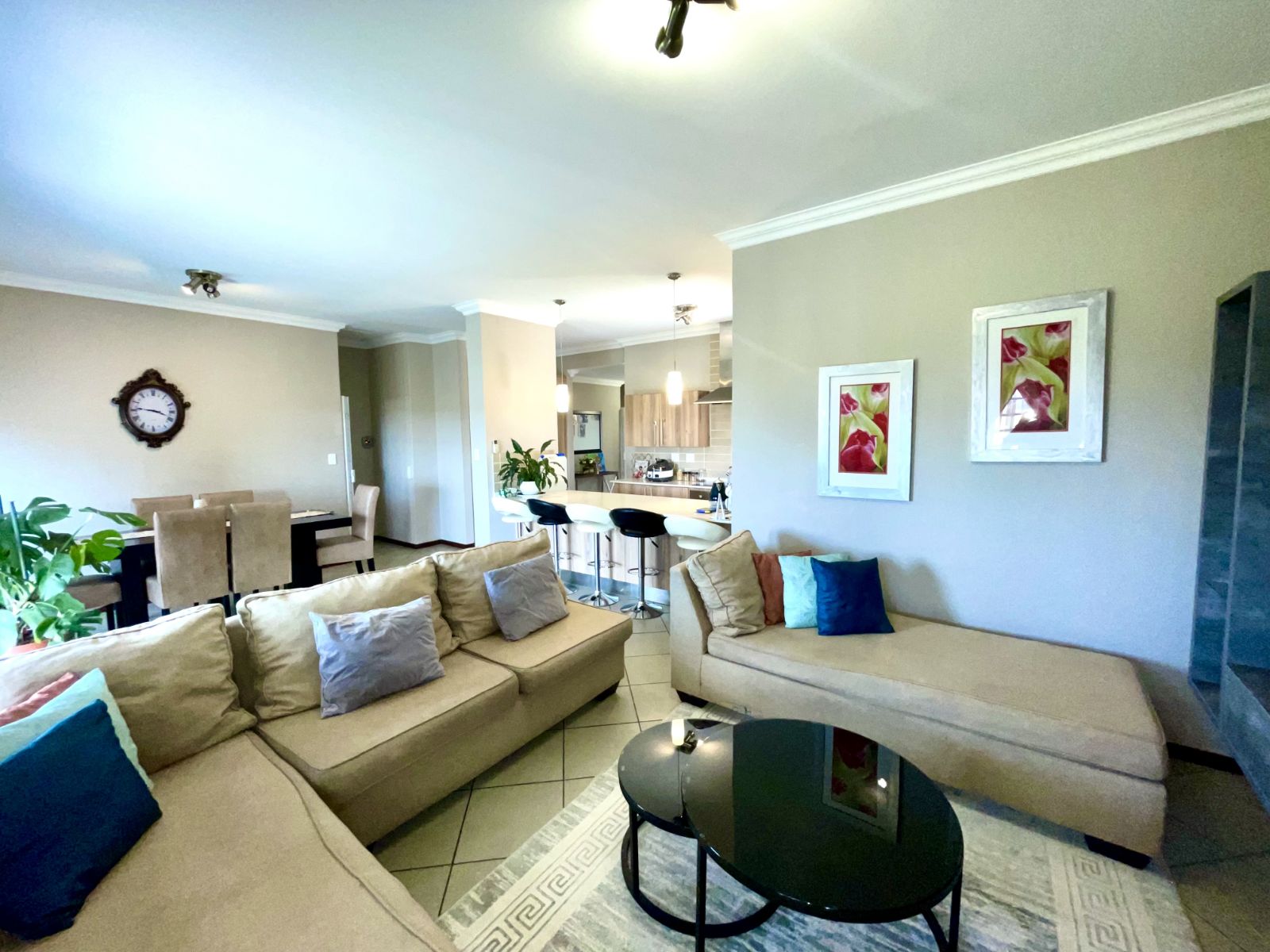 This well-designed residence offers three spacious bedrooms and two beautifully finished full bathrooms. The open-plan kitchen is both practical and contemporary, featuring a separate scullery with space for a double-door refrigerator and three undercover appliances—keeping the main kitchen neat and uncluttered.