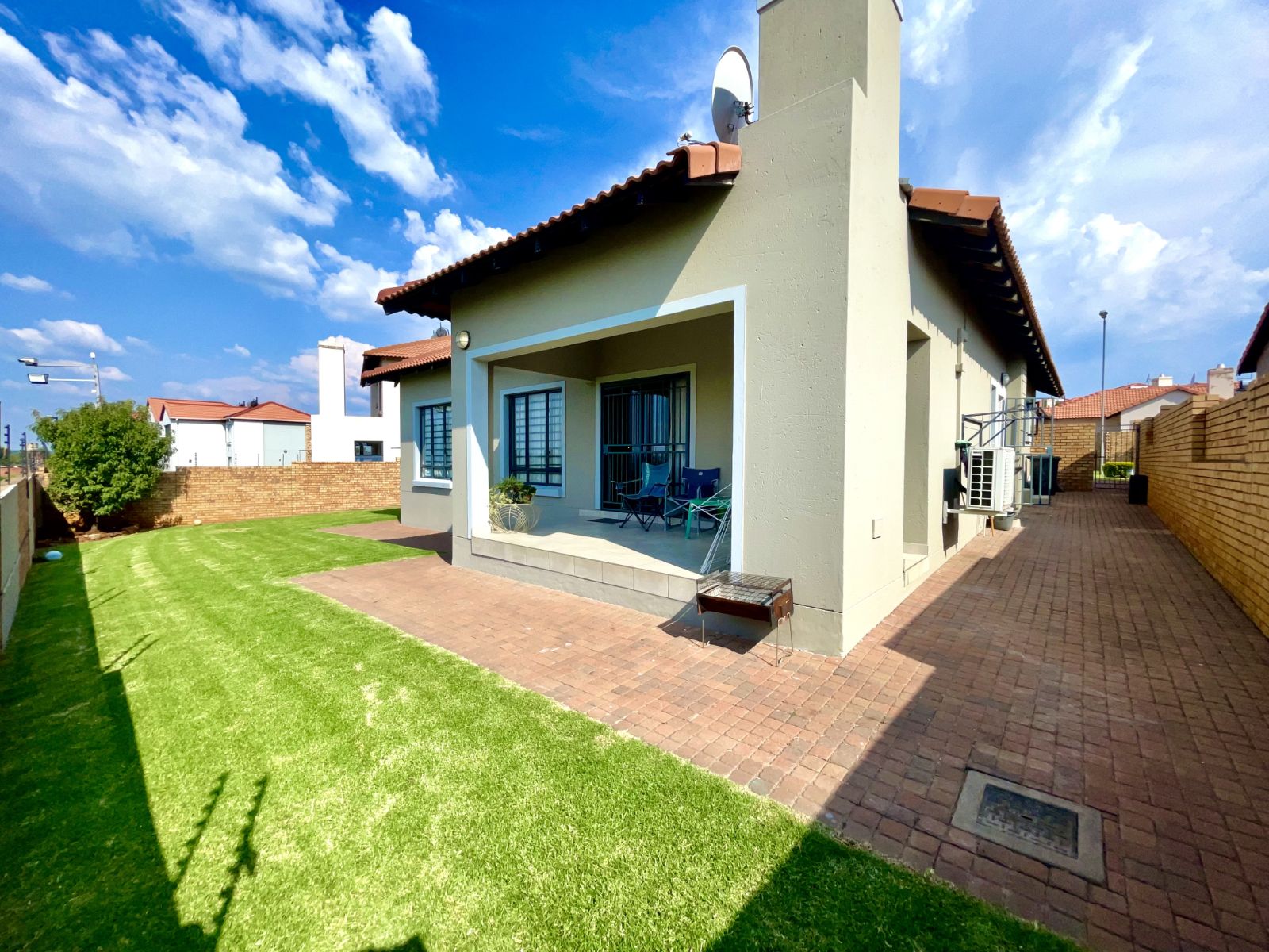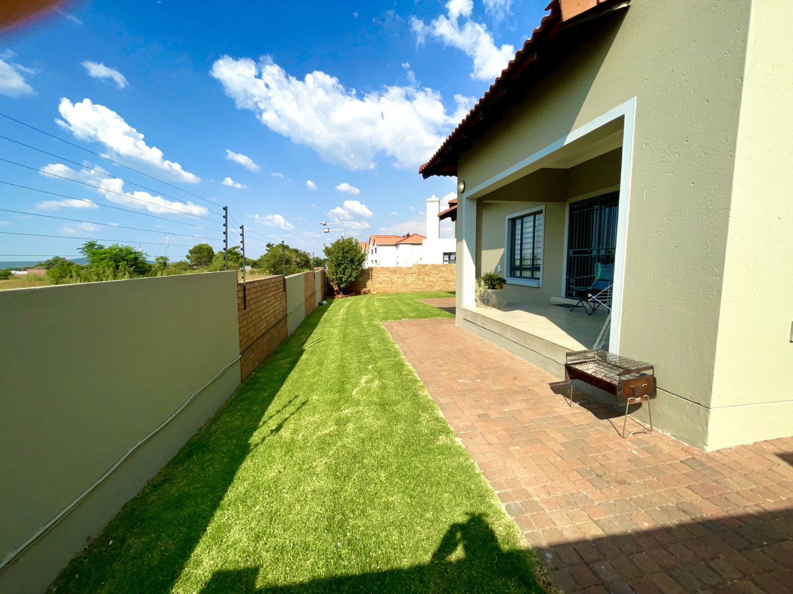 The living and dining area is light-filled and inviting, flowing seamlessly onto a covered patio that’s ideal for entertaining. Complete with a built-in braai, this space overlooks a roomy backyard, providing plenty of space for children to play or for relaxed outdoor living.