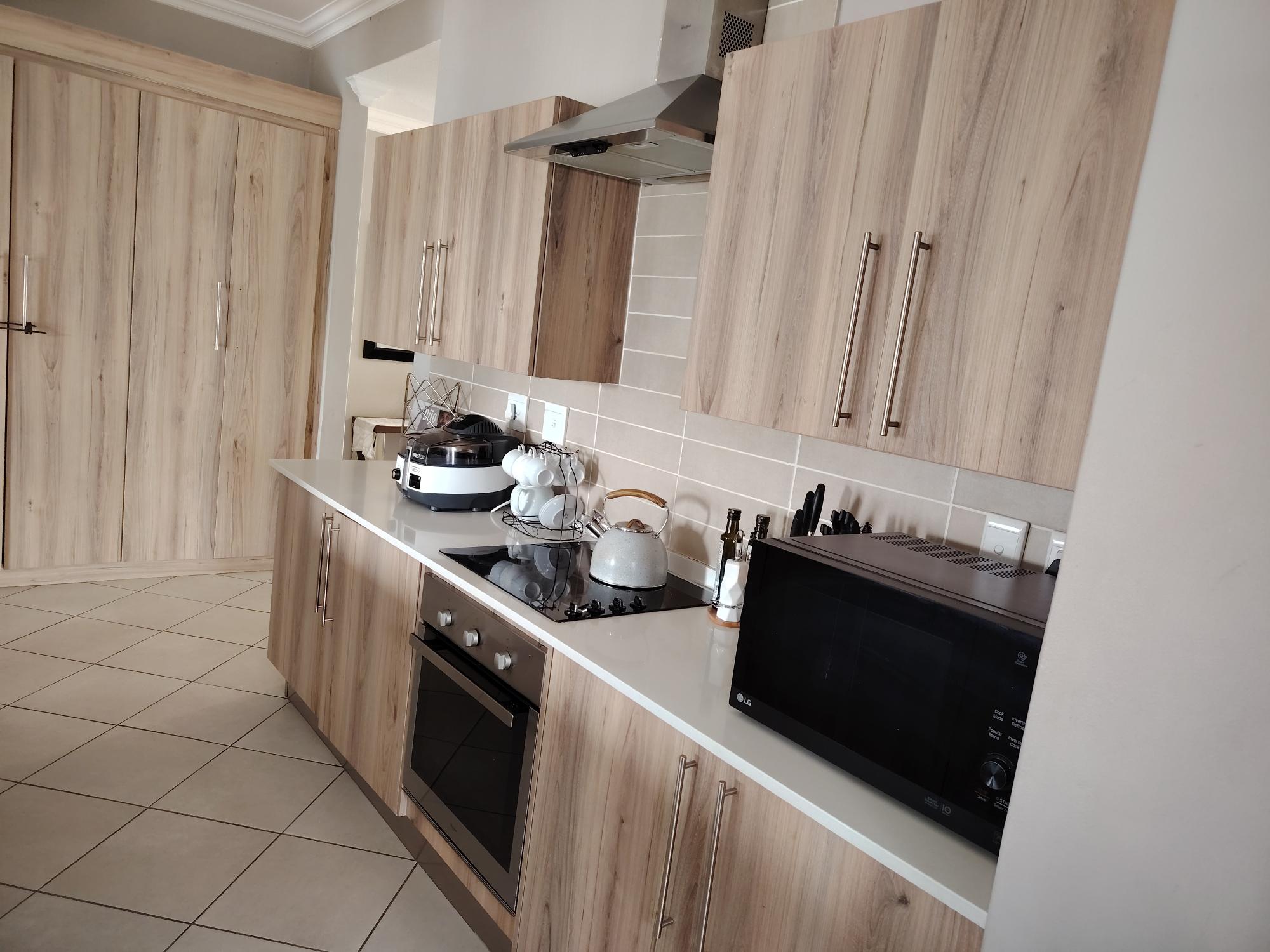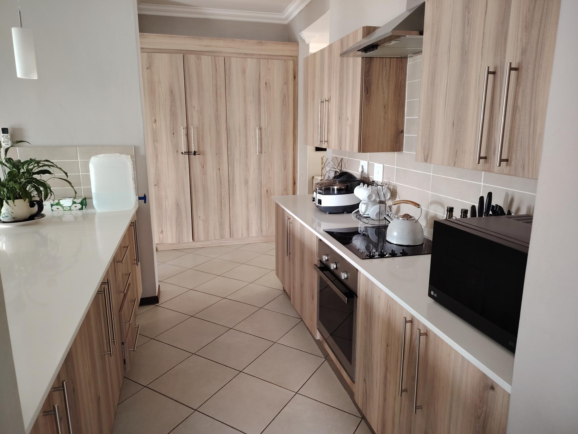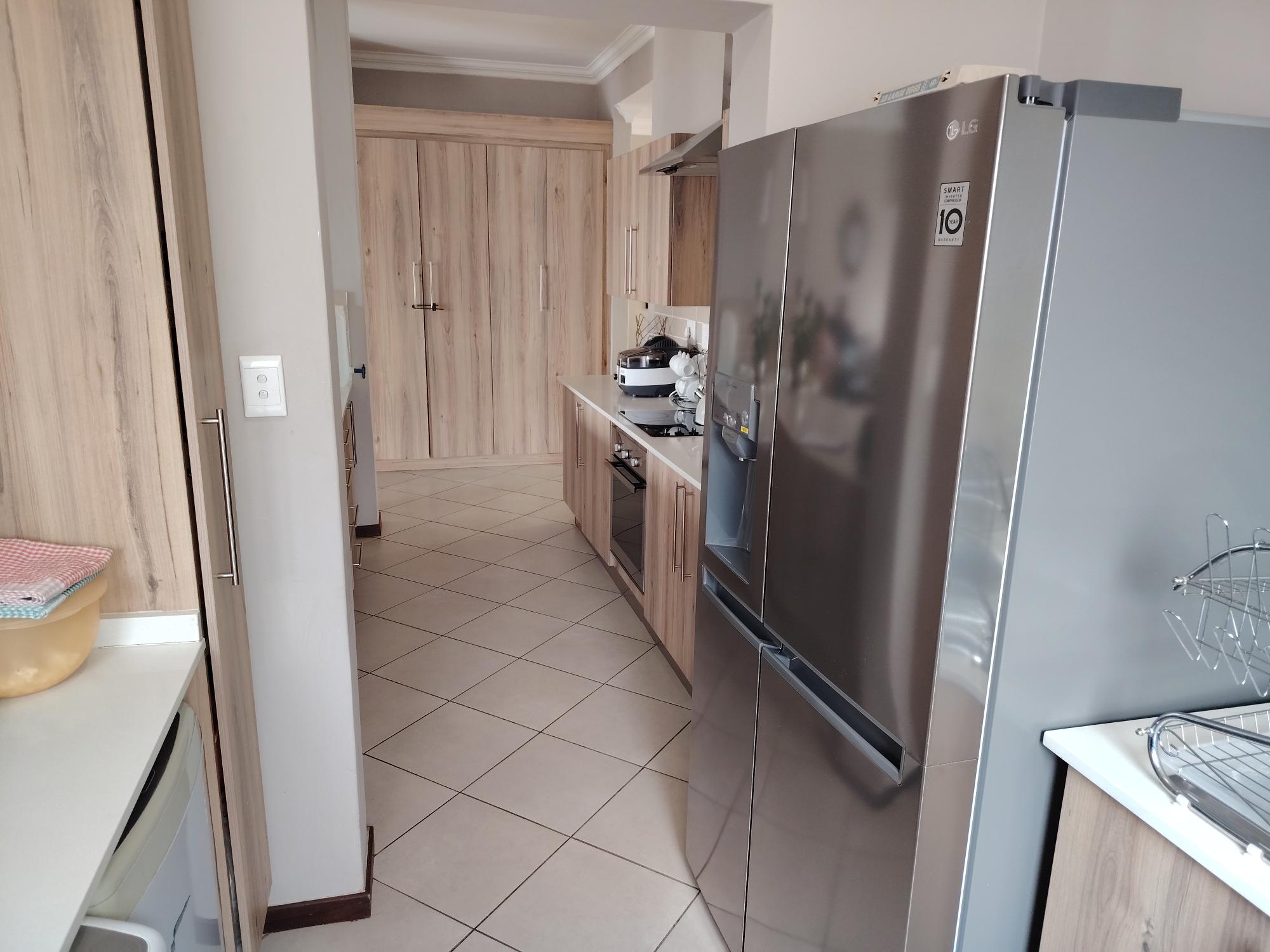 This residence features three generously sized bedrooms and two elegant full bathrooms. The contemporary open-plan kitchen includes a separate scullery, ideal for accommodating a double-door fridge and three undercover appliances. The spacious living and dining area flows effortlessly onto a charming undercover patio, perfect for entertaining, complete with a built-in braai and ample backyard space for children to play.