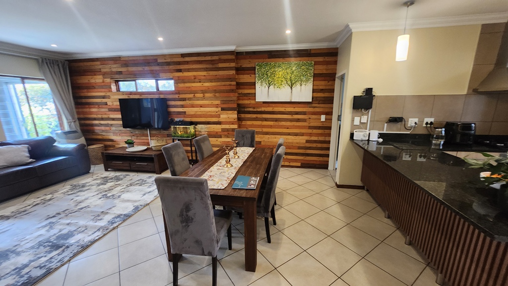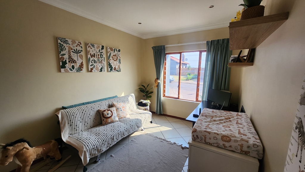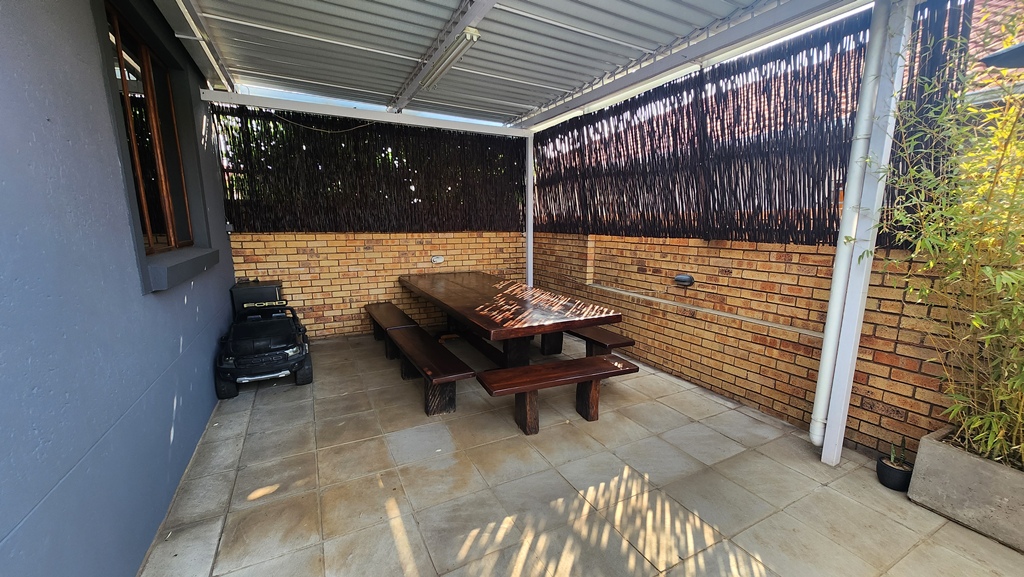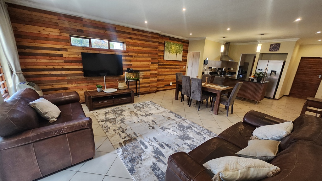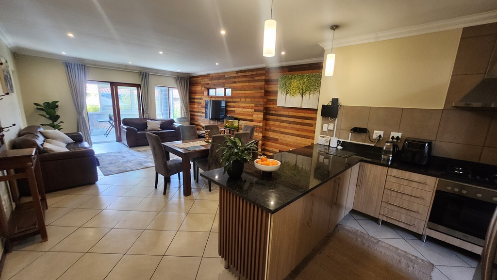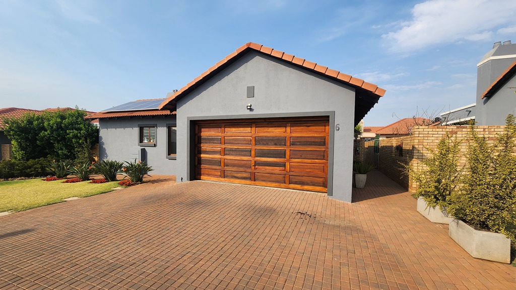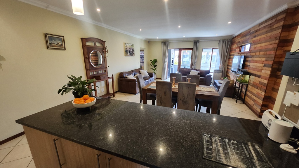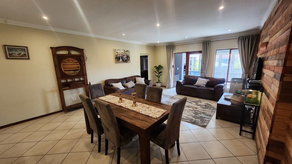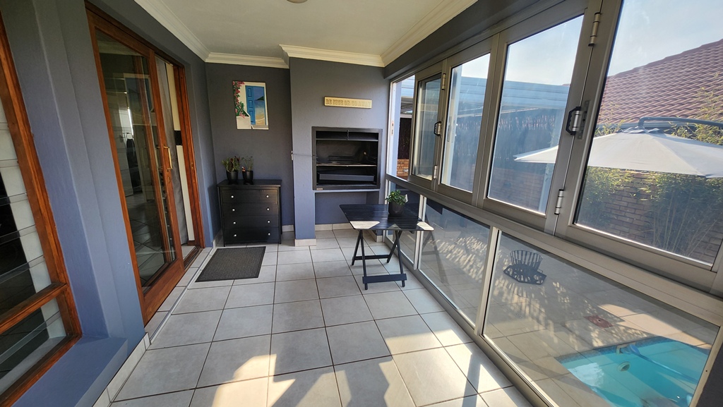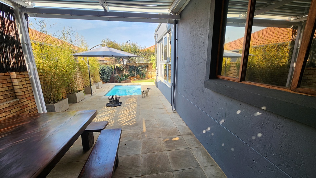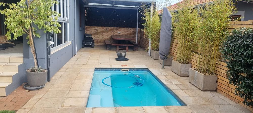 This contemporary residence boasts three spacious bedrooms and two full bathrooms, including a luxurious en-suite. The open-plan living area, which combines dining and lounge spaces, flows seamlessly into an enclosed patio featuring a built-in braai. Enjoy a picturesque view of the sparkling heated splash pool, complete with spa jets, alongside a garden perfect for children to play.