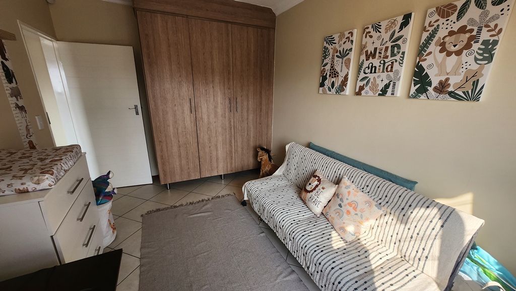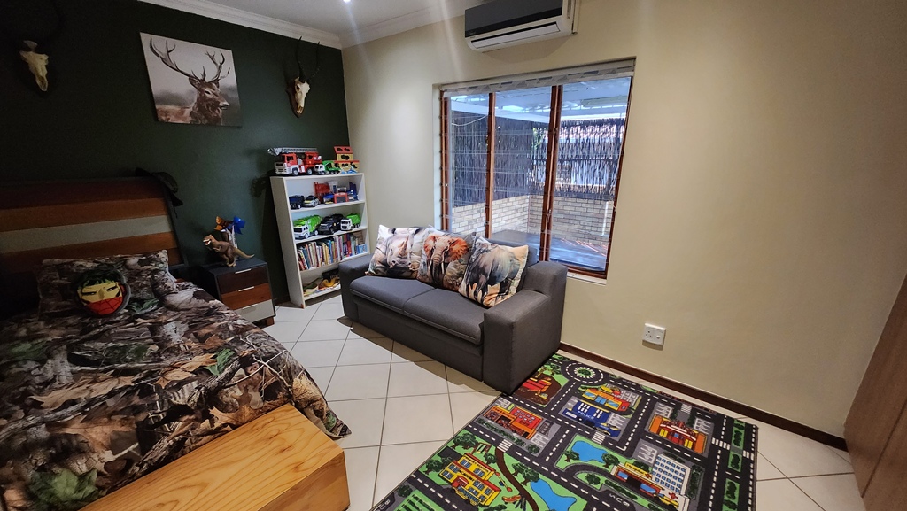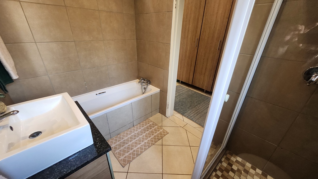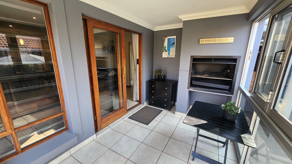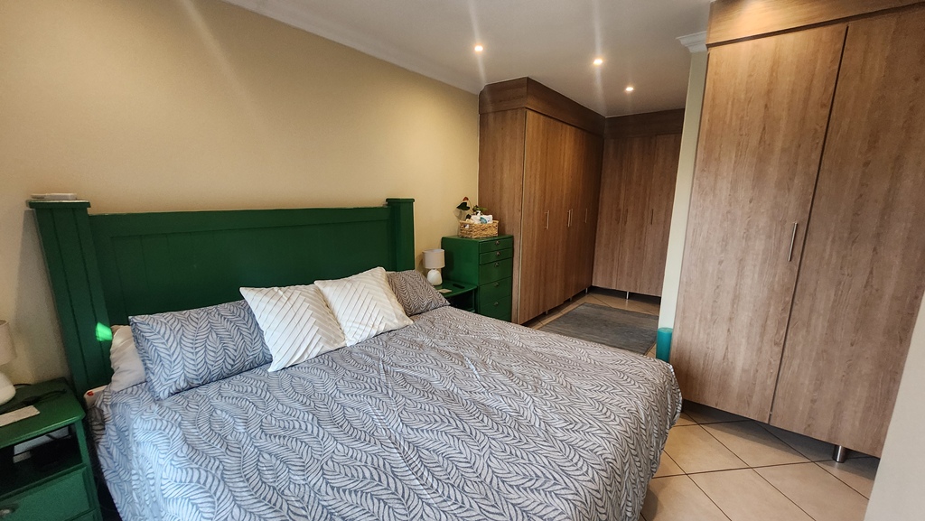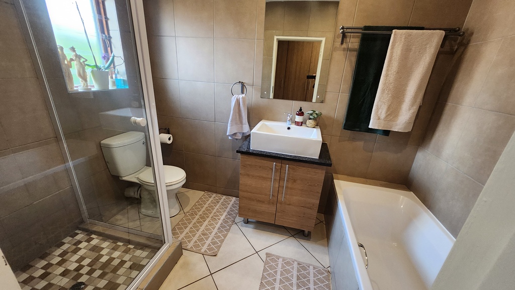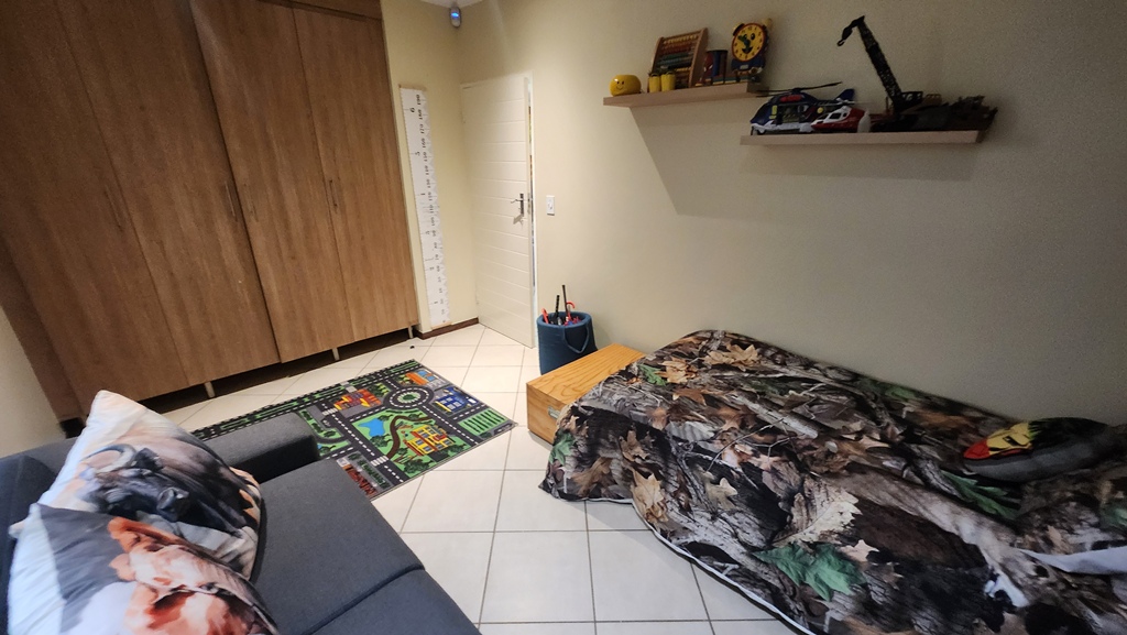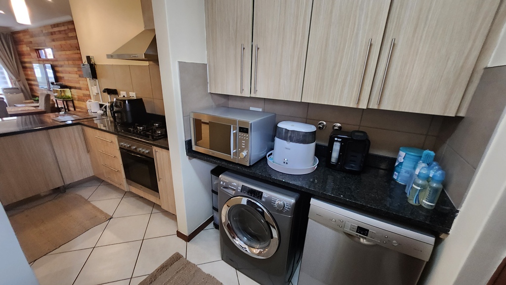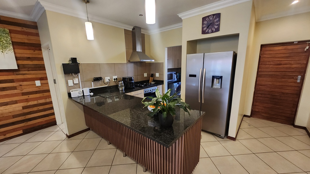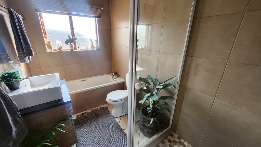 This contemporary residence boasts three spacious bedrooms and two full bathrooms, including a luxurious en-suite. The open-plan living area, which combines dining and lounge spaces, flows seamlessly into an enclosed patio featuring a built-in braai. Enjoy a picturesque view of the sparkling heated splash pool, complete with spa jets, alongside a garden perfect for children to play.