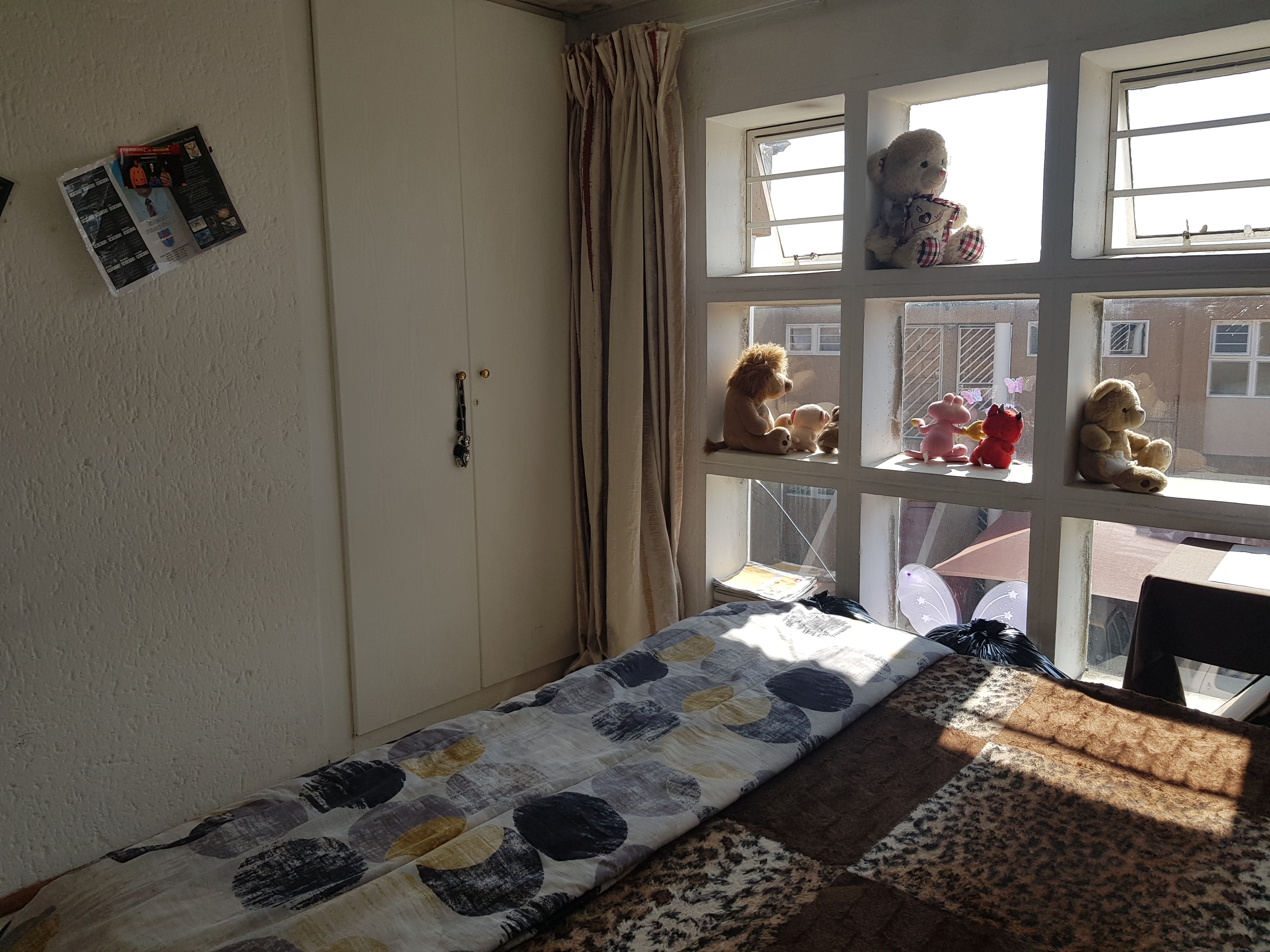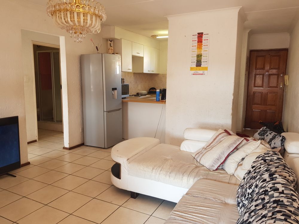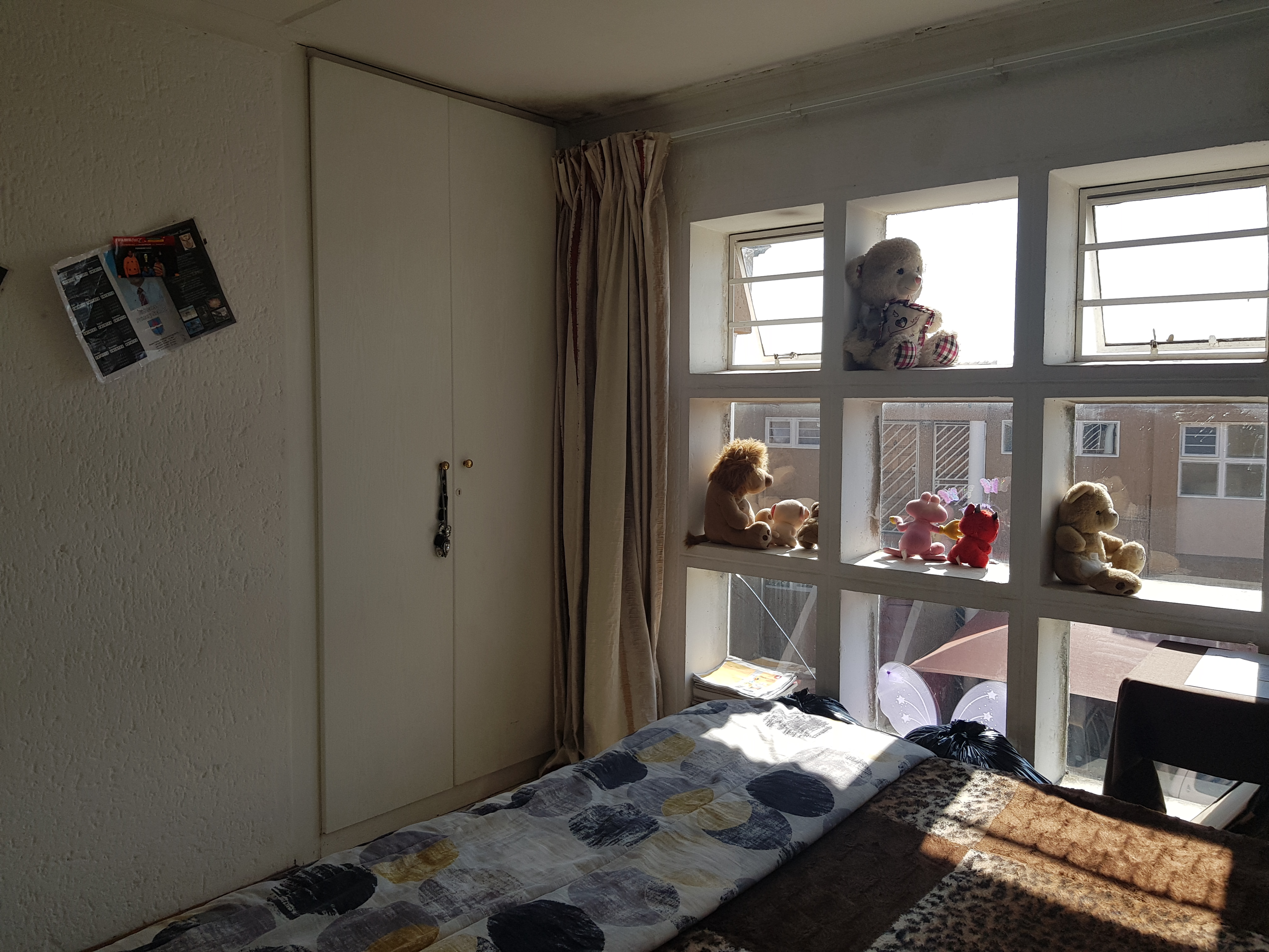 This generously sized upstairs unit features two tiled bedrooms, each equipped with built-in cupboards. The bathroom includes a bath, shower, toilet, and basin. The kitchen boasts ample built-in storage and flows seamlessly into the lounge and a large balcony.