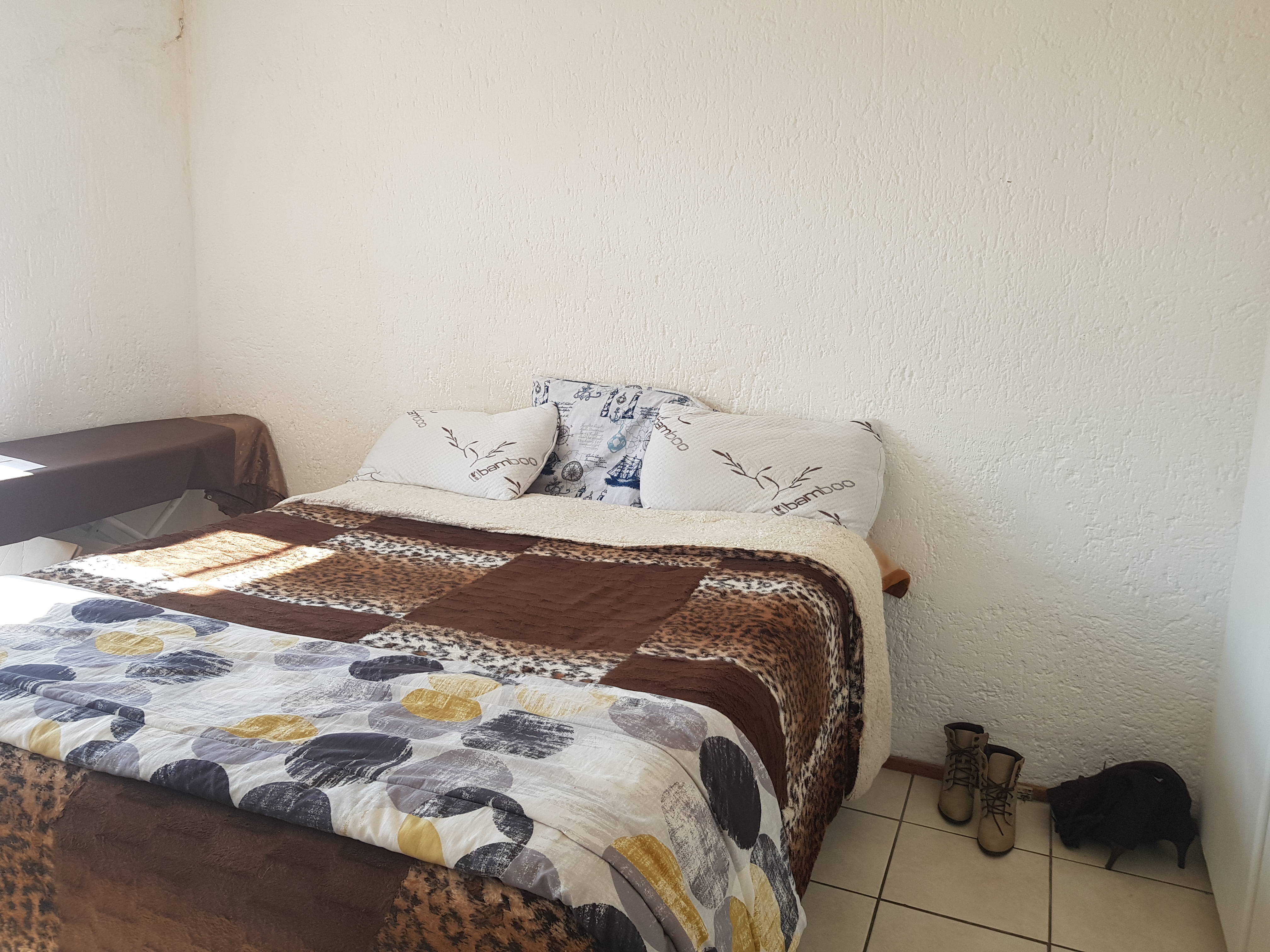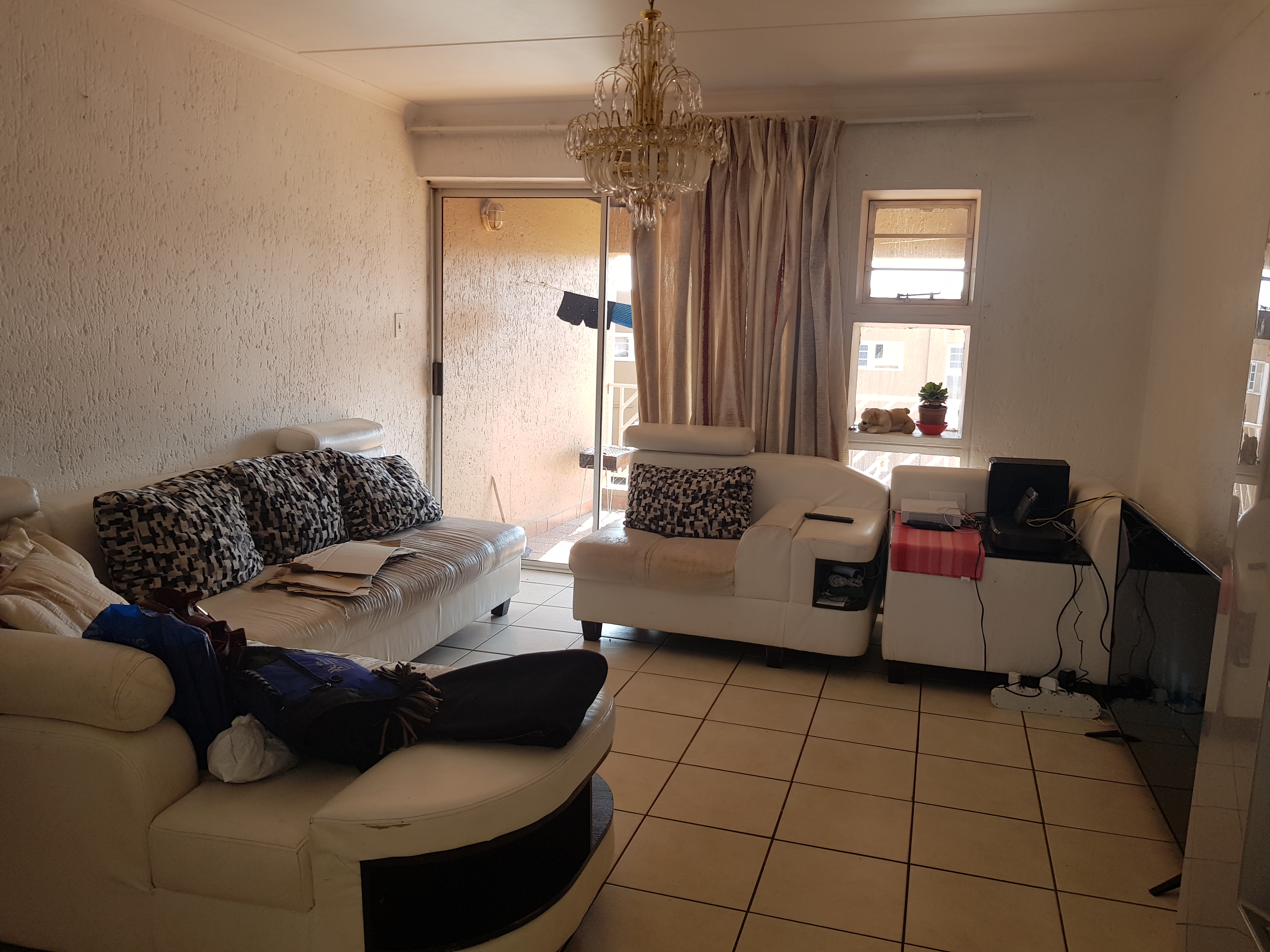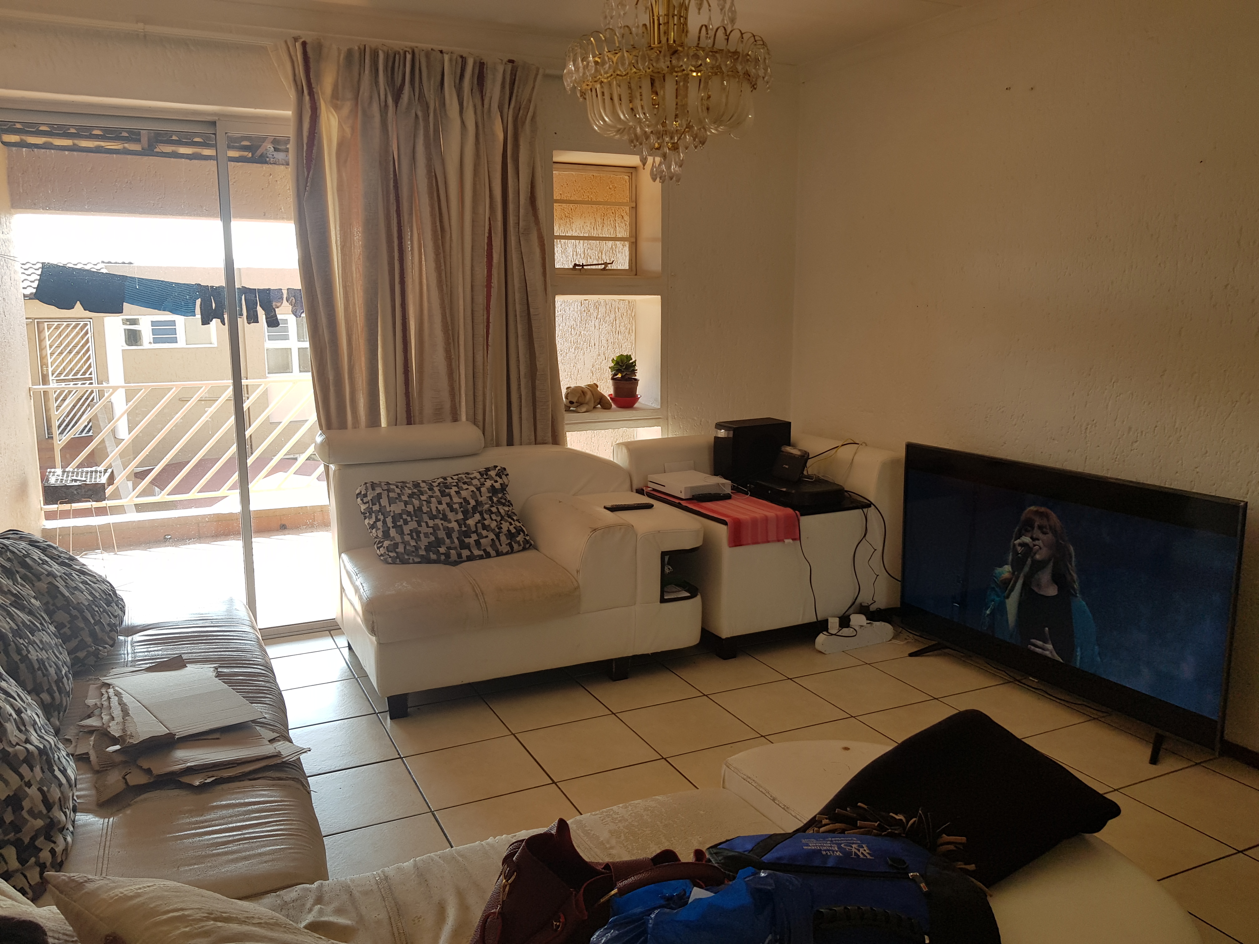 This generously sized upstairs unit features two tiled bedrooms, each equipped with built-in cupboards. The bathroom includes a bath, shower, toilet, and basin. The kitchen boasts ample built-in storage and flows seamlessly into the lounge and a large balcony.