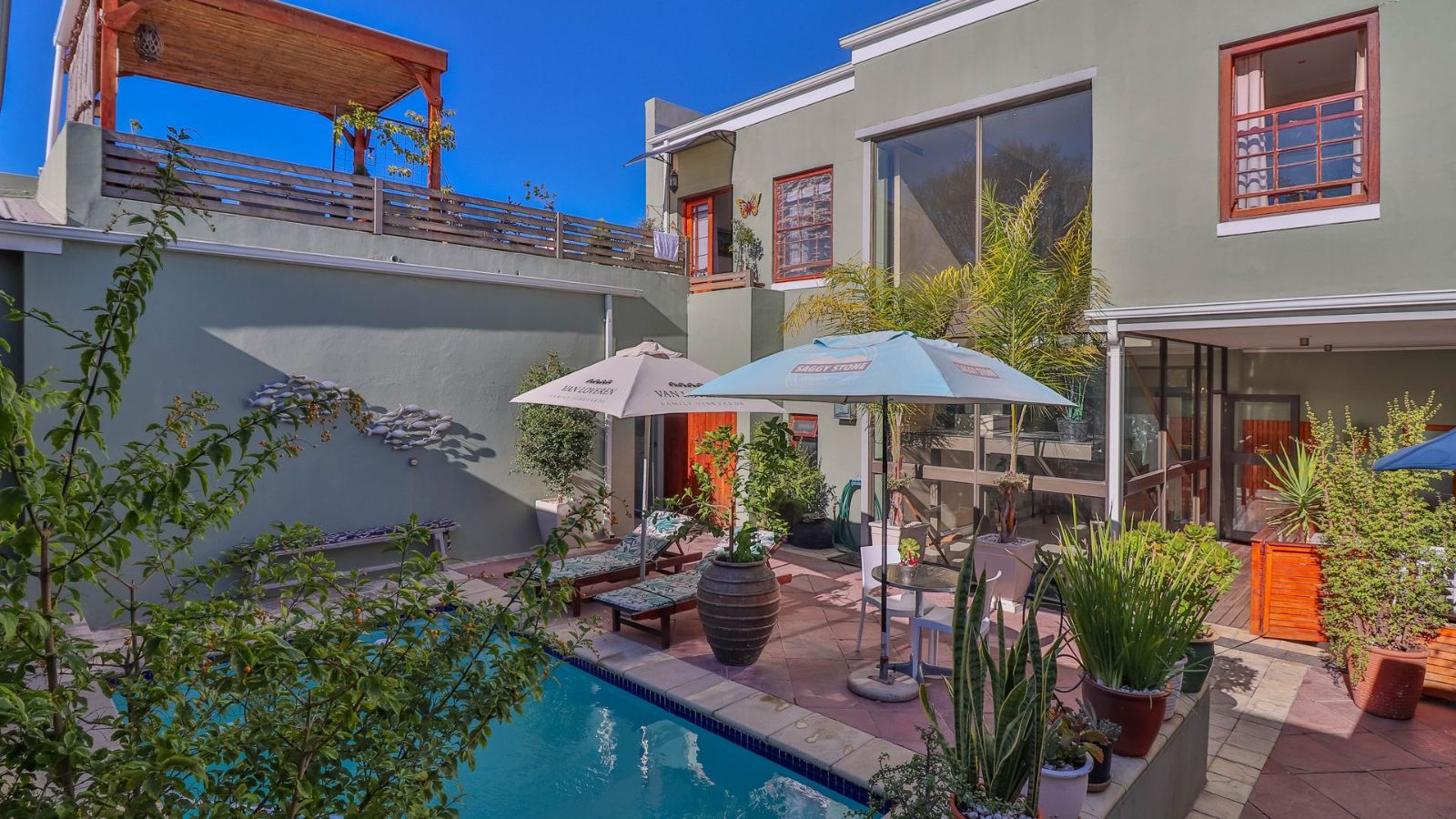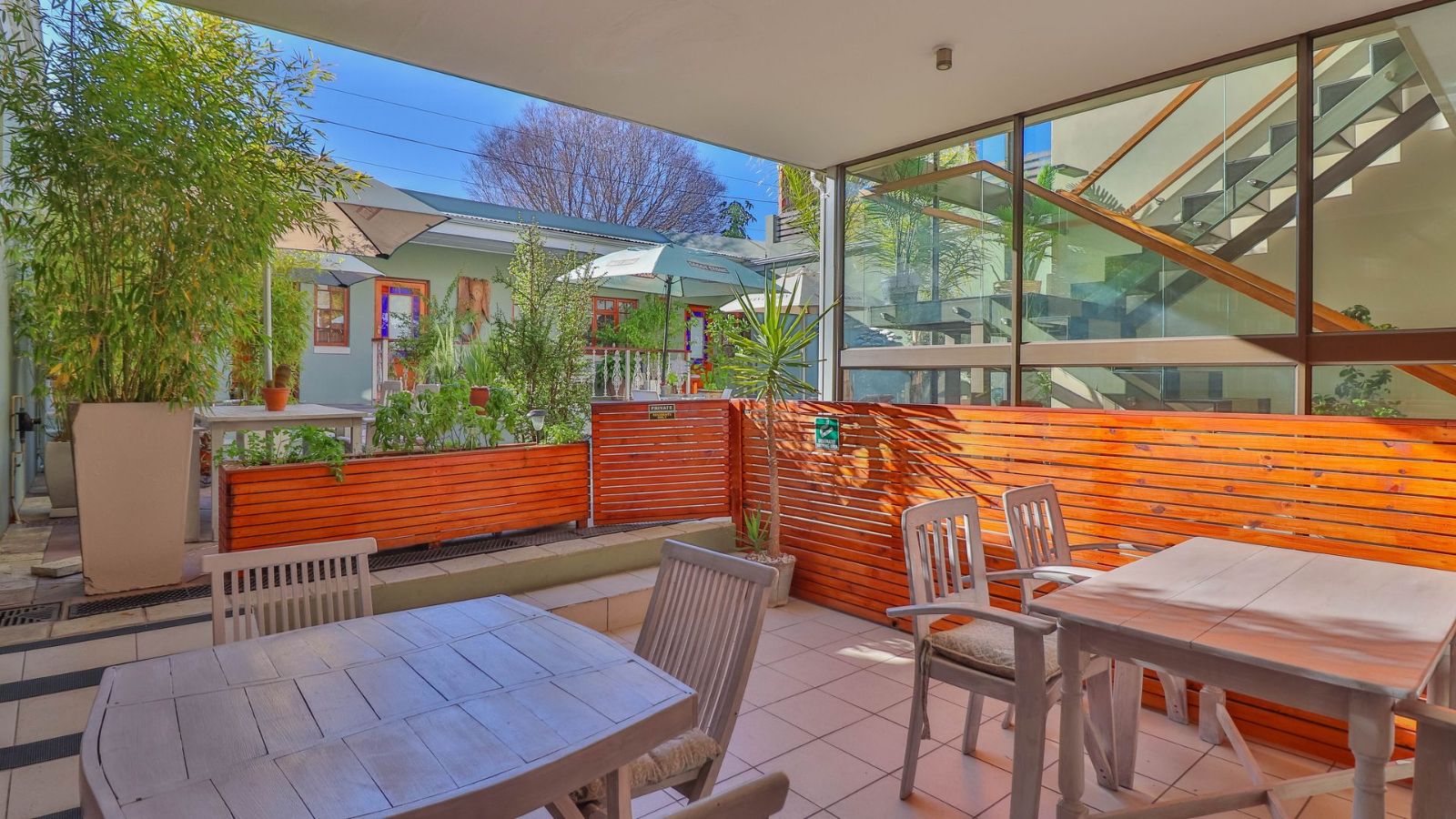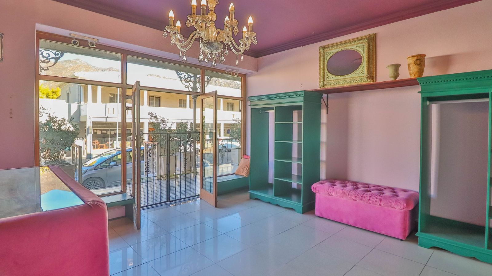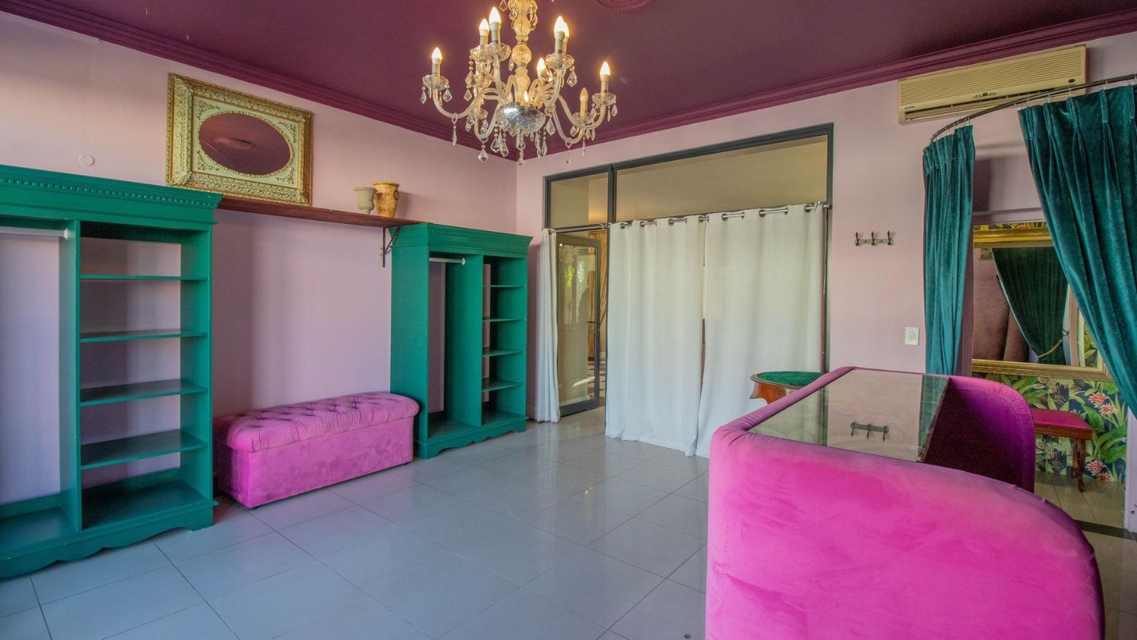 A cozy nook with a fitting room is ideal for a small clothing store. In the private outside courtyard an inviting ambiance awaits! With a covered patio, dining area and a sparkly pool.