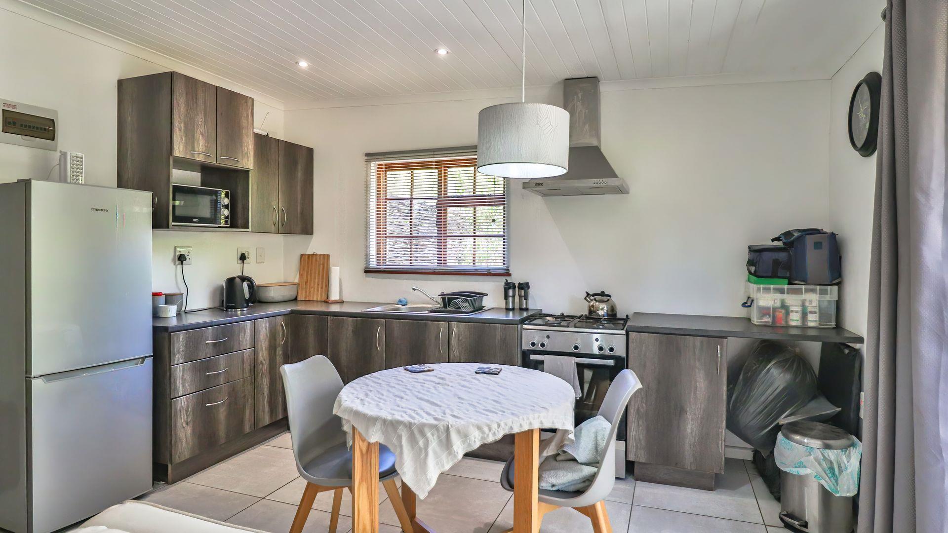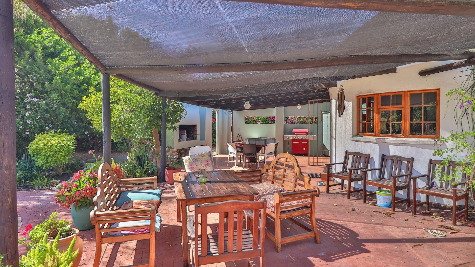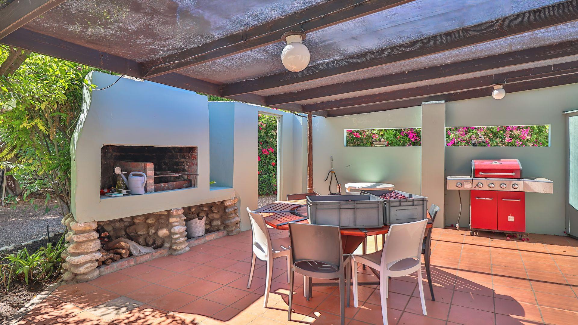 Positioned opposite the main house is a fully self-contained cottage, currently operating successfully as an Airbnb. This open-plan unit includes a bedroom, living area, kitchen, bathroom, and a private patio with braai — perfect for guests, extended family, or rental income.