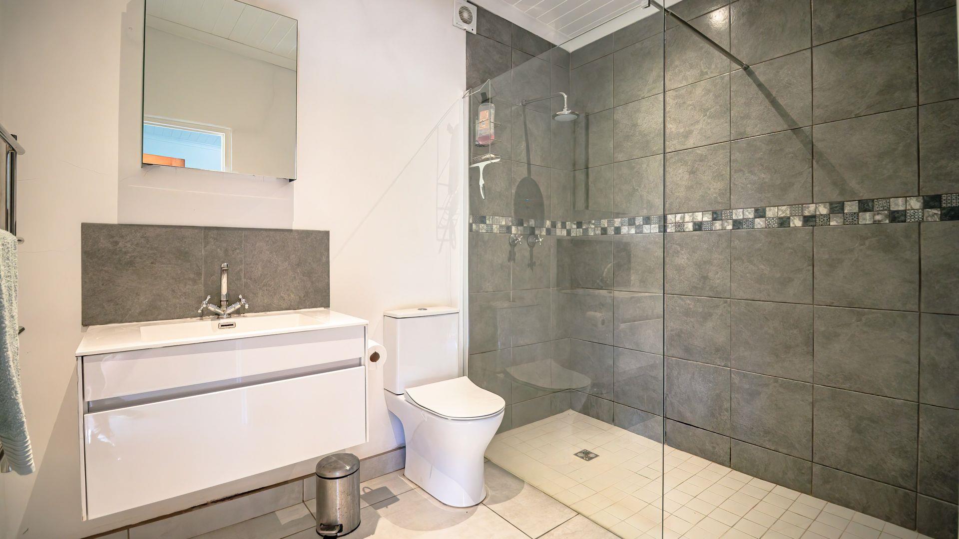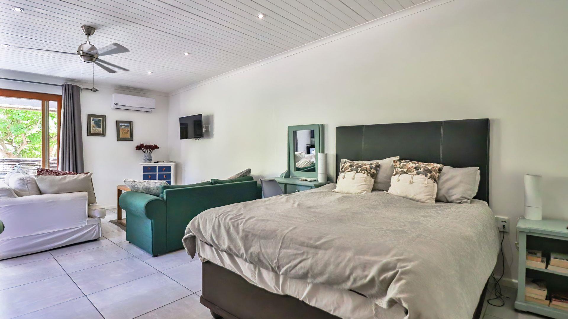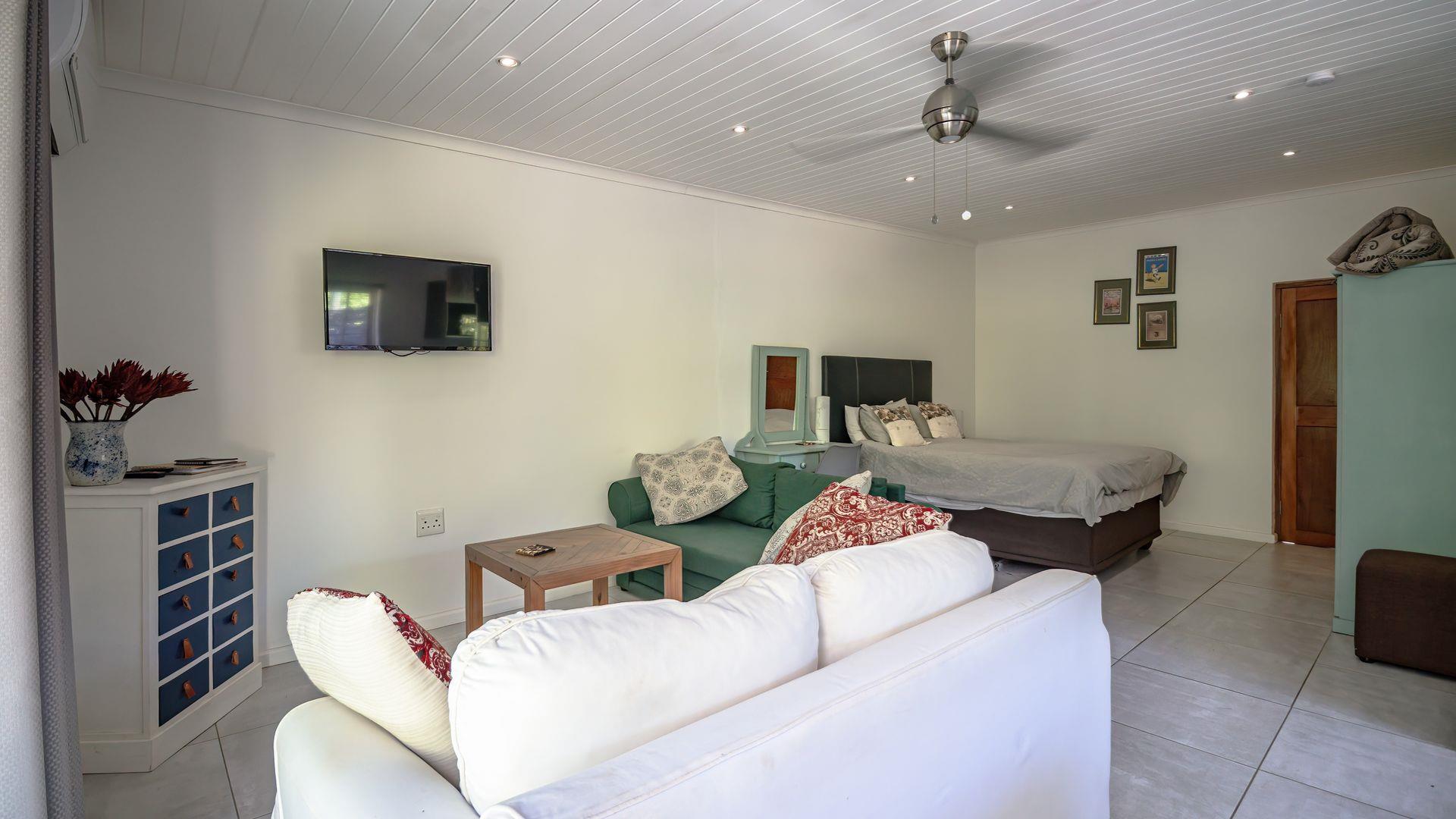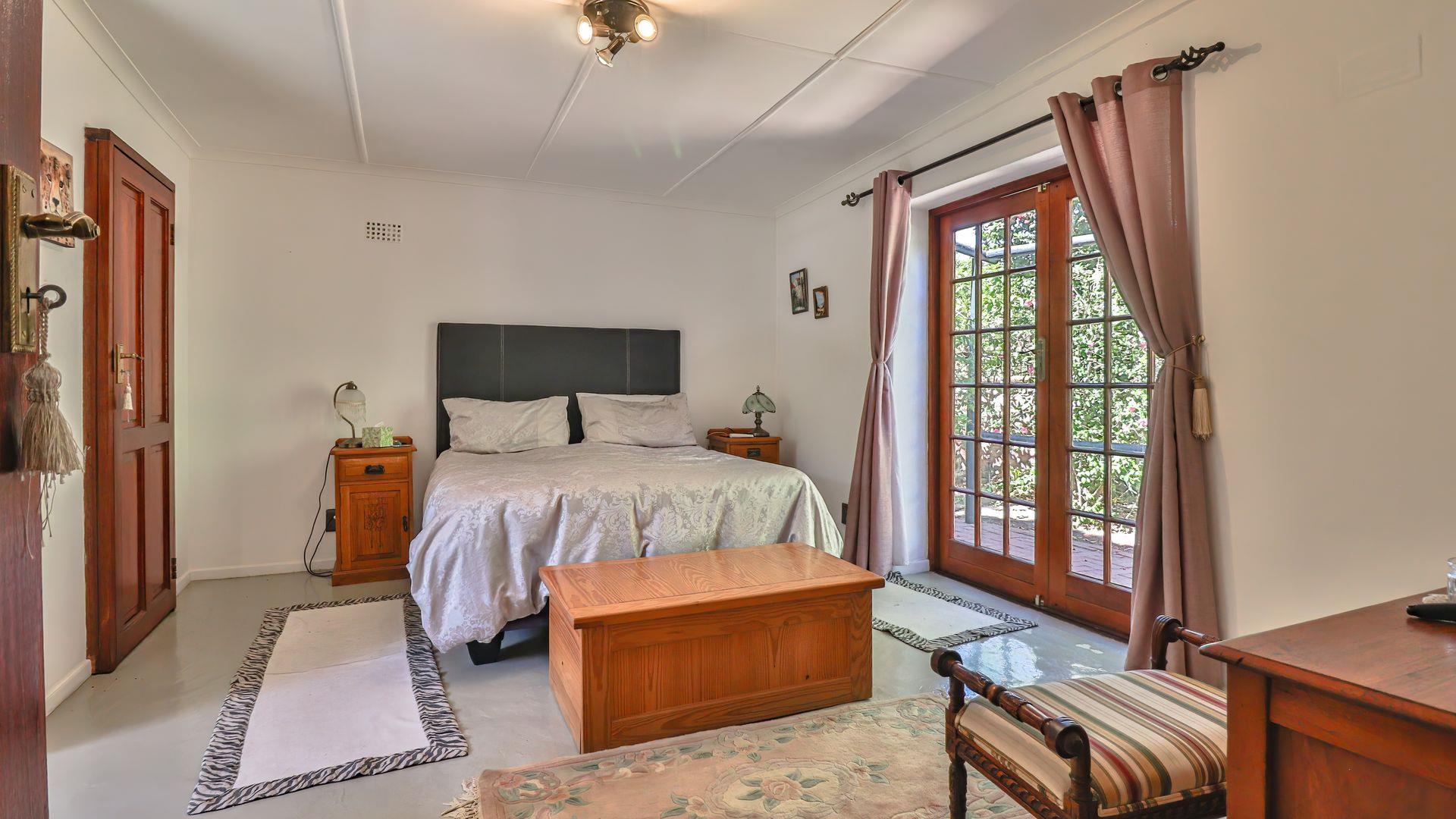 Positioned opposite the main house is a fully self-contained cottage, currently operating successfully as an Airbnb. This open-plan unit includes a bedroom, living area, kitchen, bathroom, and a private patio with braai — perfect for guests, extended family, or rental income.