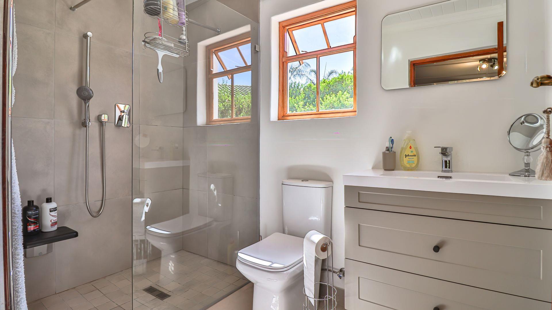 The living spaces flow seamlessly outdoors to a covered patio with built-in braai, overlooking the fibreglass swimming pool, lush gardens, and a large lined pond complete with a small bridge and resident geese. Mountain views complete this tranquil setting, making it ideal for both everyday living and weekend entertaining.
