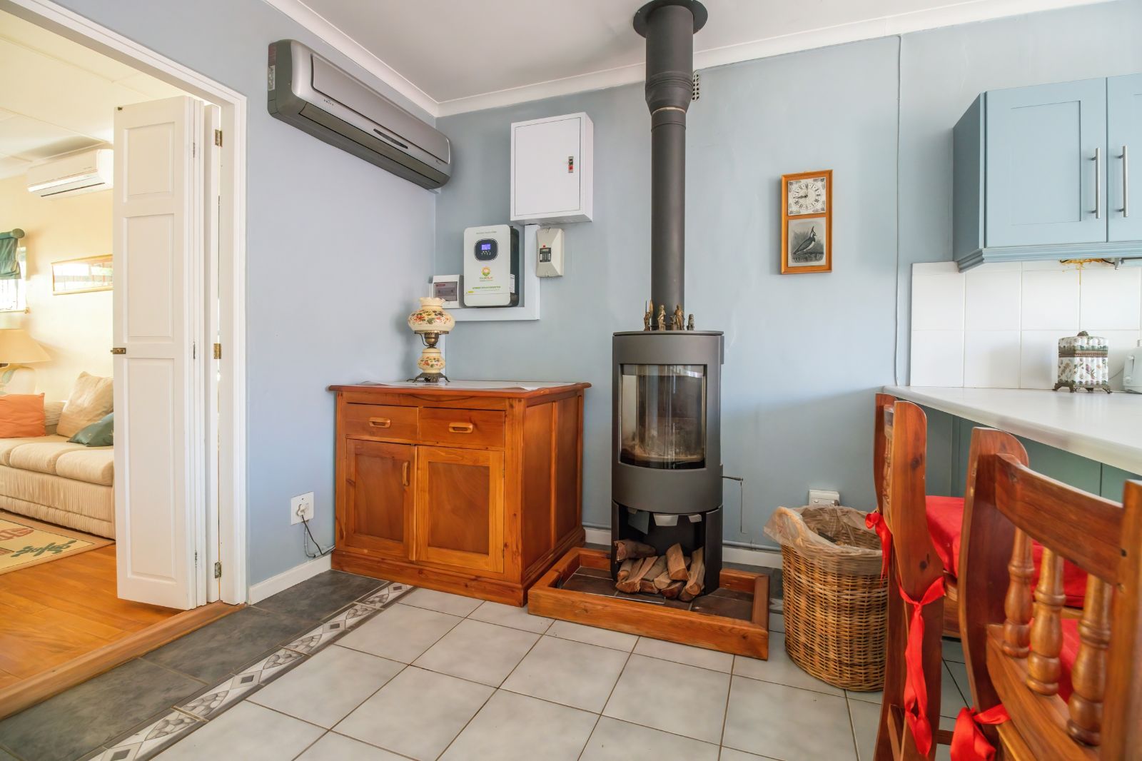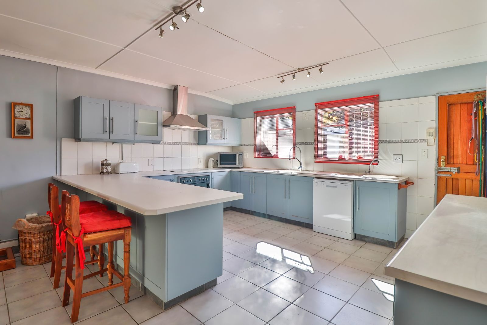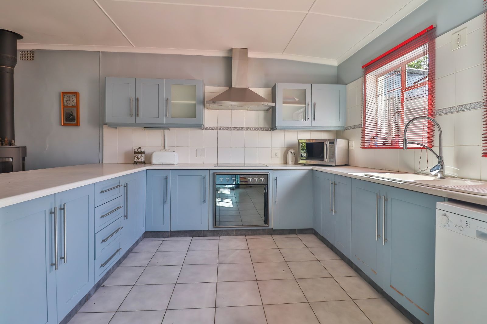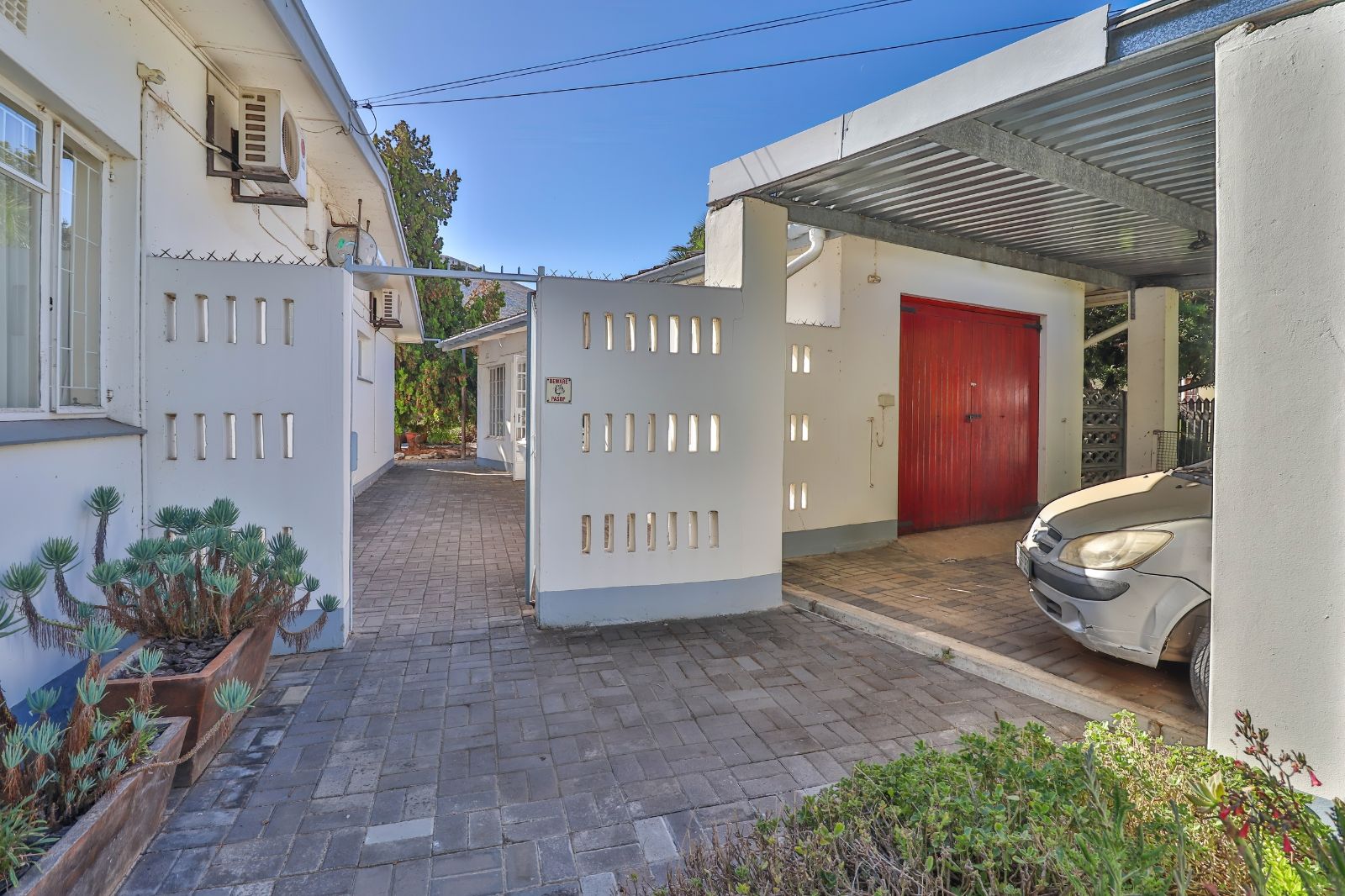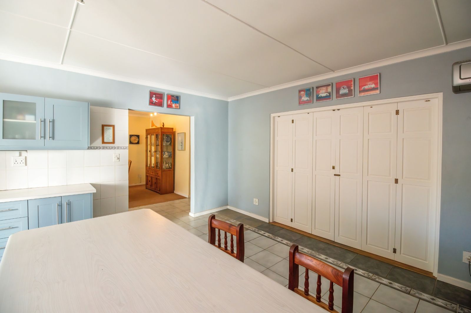 When entering through the automated gate, you are welcomed by a covered patio that leads to your living room. The kitchen is equipped with ample cupboard space, a built in fire place, built in oven, hub and extractor fan, as well as an air-conditioner. It is conveniently situated next to the dining room, creating an easy flow.