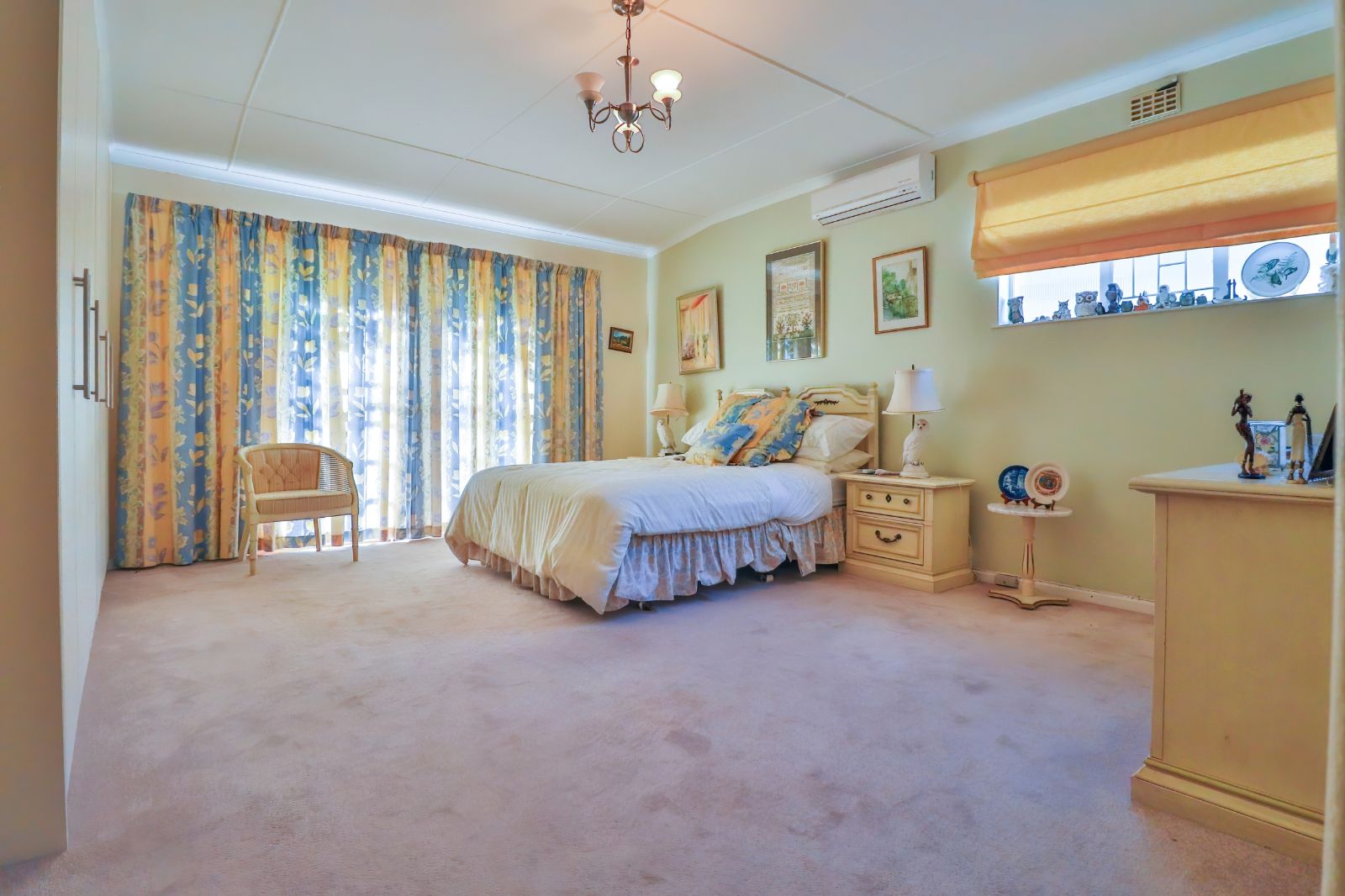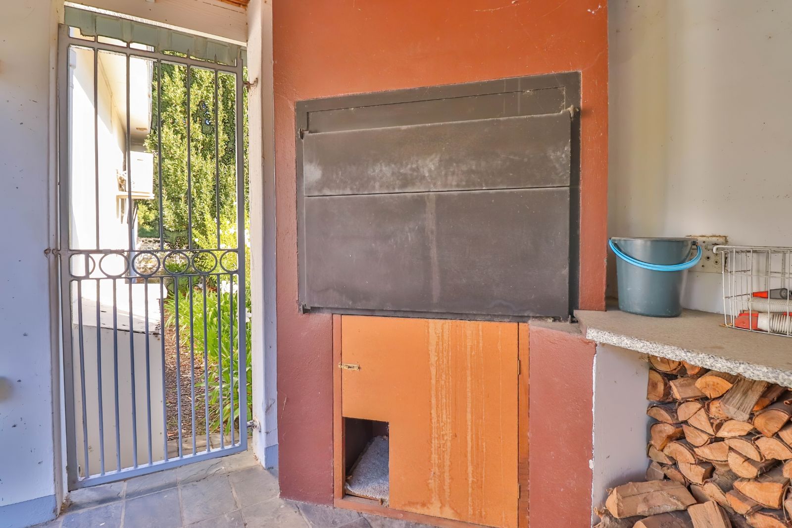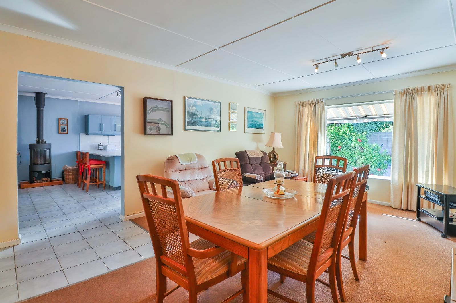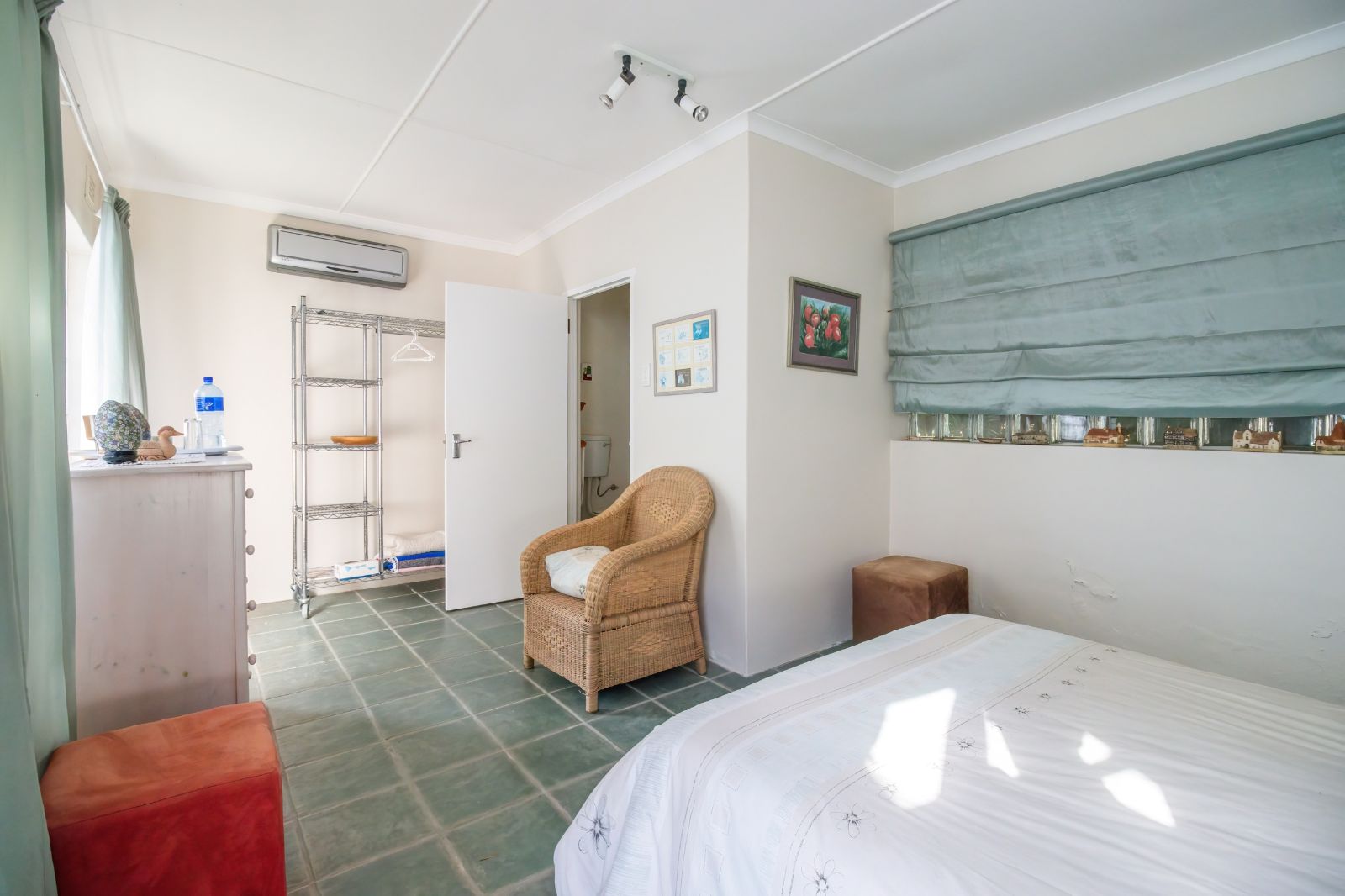 When entering through the automated gate, you are welcomed by a covered patio that leads to your living room. The kitchen is equipped with ample cupboard space, a built in fire place, built in oven, hub and extractor fan, as well as an air-conditioner. It is conveniently situated next to the dining room, creating an easy flow.